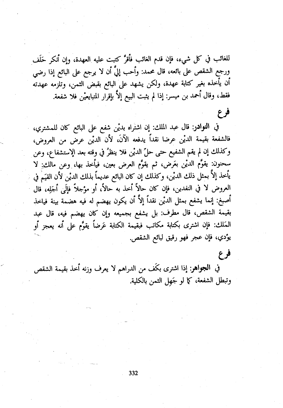 فِي النَّوَادِرِ قَالَ عَبْدُ الْمَلِكِ إِنِ اشْتَرَاهُ بِدَيْنٍ شَفَعَ عَلَى الْبَائِعِ كَانَ لِلْمُشْتَرِي فَالشُّفْعَةُ بِقِيمَةِ الدَّيْنِ عَرَضًا نَقْدًا يَدْفَعُهُ الْآنَ لِأَنَّ الدَّيْنَ عَرَضٌ مِنَ الْعُرُوضِ وَكَذَلِكَ إِنْ لَمْ يَقُمِ الشَّفِيعُ حَتَّى حَلَّ الدَّيْنُ فَلَا يَنْظُرُ فِي وَقْتِهِ بَعْدَ الِاسْتِشْفَاعِ وَعَنْ سَحْنُونٍ يُقَوَّمُ الدَّيْنُ بِعَرَضٍ ثُمَّ يُقَوَّمُ الْعَرَضُ بِعَيْنٍ فَيَأْخُذُ بِهَا وَعَنْ مَالِكٍ لَا يَأْخُذُ إِلَّا بِمِثْلِ ذَلِكَ الدَّيْنِ وَكَذَلِكَ إِنْ كَانَ الْبَائِعُ عَدِيمًا بِذَلِكَ الدَّيْنِ لِأَنَّ الْقِيَمَ فِي الْعُرُوضِ لَا فِي النفدين فَإِنْ كَانَ حَالًّا أَخَذَ بِهِ حَالًّا أَوْ مُؤَجَّلًا فَإِلَى أَجَلِهِ قَالَ أَصْبَغُ إِنَّمَا يَشْفَعُ بِمِثْلِ الدَّيْنِ نَقْدًا إِلَّا أَنْ يَكُونَ يُهْضَمُ لَهُ فِيهِ هَضْمَةً بَيِّنَةً فَيَأْخُذُ بِقِيمَةِ الشِّقْصِ قَالَ مُطَرِّفٌ بَلْ يَشْفَعُ بِجَمِيعِهِ وَإِنْ كَانَ يَهْضِمُ فِيهِ قَالَ عَبْدُ الْمَلِكِ فَإِنِ اشْتَرَى بِكِتَابَةِ مُكَاتَبٍ فَبِقِيمَةِ الْكِتَابَةِ عَرَضًا يُقَوَّمُ عَلَى أَنه يعجز أَو يُؤَدِّي فَإِن عجز فَهُوَ رَقِيقٌ لِبَائِعِ الشِّقْصِ