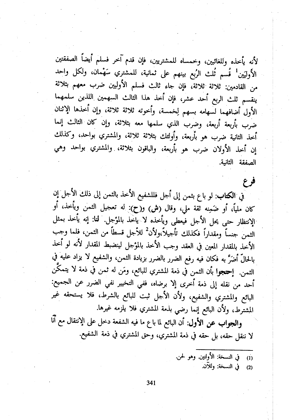 فِي الْكِتَابِ لَوْ بَاعَ بِثَمَنٍ إِلَى أَجَلٍ فَلِلشَّفِيعِ الْأَخْذُ بِالثَّمَنِ إِلَى ذَلِكَ الْأَجَلِ إِنْ كَانَ مَلِيًّا اَوْ ضمنه ثِقَة ملي وَقَالَ ش وح لَهُ تَعْجِيلُ الثَّمَنِ وَيَأْخُذُ أَوْ الِانْتِظَارُ حَتَّى يَحِلَّ الْأَجَلُ فَيُعْطَى وَيَأْخُذُهُ لَا يَأْخُذُ بِالْمُؤَجَّلِ لَنَا أَنَّهُ يَأْخُذُ بِمِثْلِ الثَّمَنِ جِنْسًا وَمِقْدَارًا فَكَذَلِكَ تَأْجِيلًا وَلِأَنَّ لِلْأَجَلِ قِسْطًا مِنَ الثَّمَنِ فَلَمَّا وَجَبَ الْأَخْذُ بِالْمِقْدَارِ الْمُعَيَّنِ فِي الْعَقْدِ وَجَبَ الْأَخْذُ بِالْمُؤَجَّلِ لِيَنْضَبِطَ الْمِقْدَارُ لِأَنَّهُ لَوْ أَخَذَ بِالْحَالِ أَضَرَّ بِهِ فَكَانَ فِيهِ رَفْعُ الضَّرَرِ بِالضَّرَرِ بِزِيَادَةِ الثَّمَنِ وَالشَّفِيعُ لَا يُزَادُ عَلَيْهِ فِي الثَّمَنِ احْتَجُّوا بِأَنَّ الثَّمَنَ فِي ذِمَّةِ الْمُشْتَرِي لِلْبَائِعِ وَمَنْ لَهُ ثَمَنٌ فِي ذِمَّةٍ لَا يَتَمَكَّنُ أَحَدٌ مِنْ نَقْلِهِ إِلَى ذِمَّةٍ أُخْرَى إِلَّا بِرِضَاهُ فَفِي التَّخْيِيرِ نَفْيُ الضَّرَرِ عَنِ الْجَمِيعِ الْبَائِعِ وَالْمُشْتَرِي وَالشَّفِيعِ وَلِأَنَّ الْأَجَلَ ثَبَتَ لِلْبَائِعِ بِالشَّرْطِ فَلَا يَسْتَحِقُّهُ غَيْرُ الْمُشْتَرِطِ وَلِأَنَّ الْبَائِعَ إِنَّمَا رَضِيَ بِذِمَّةِ الْمُشْتَرِي فَلَا يَلْزَمُهُ غَيْرُهَا وَالْجَوَابُ عَنِ الْأَوَّلِ أَنَّ الْبَائِعَ لَمَّا بَاعَ مَا فِيهِ الشُّفْعَةُ دَخَلَ عَلَى الِانْتِقَالِ مَعَ أَنَّا لَا نَنْقُلُ حَقَّهُ بَلْ حَقُّهُ فِي ذِمَّةِ الْمُشْتَرِي وَحَقُّ الْمُشْتَرِي فِي ذِمَّةِ الشَّفِيعِ