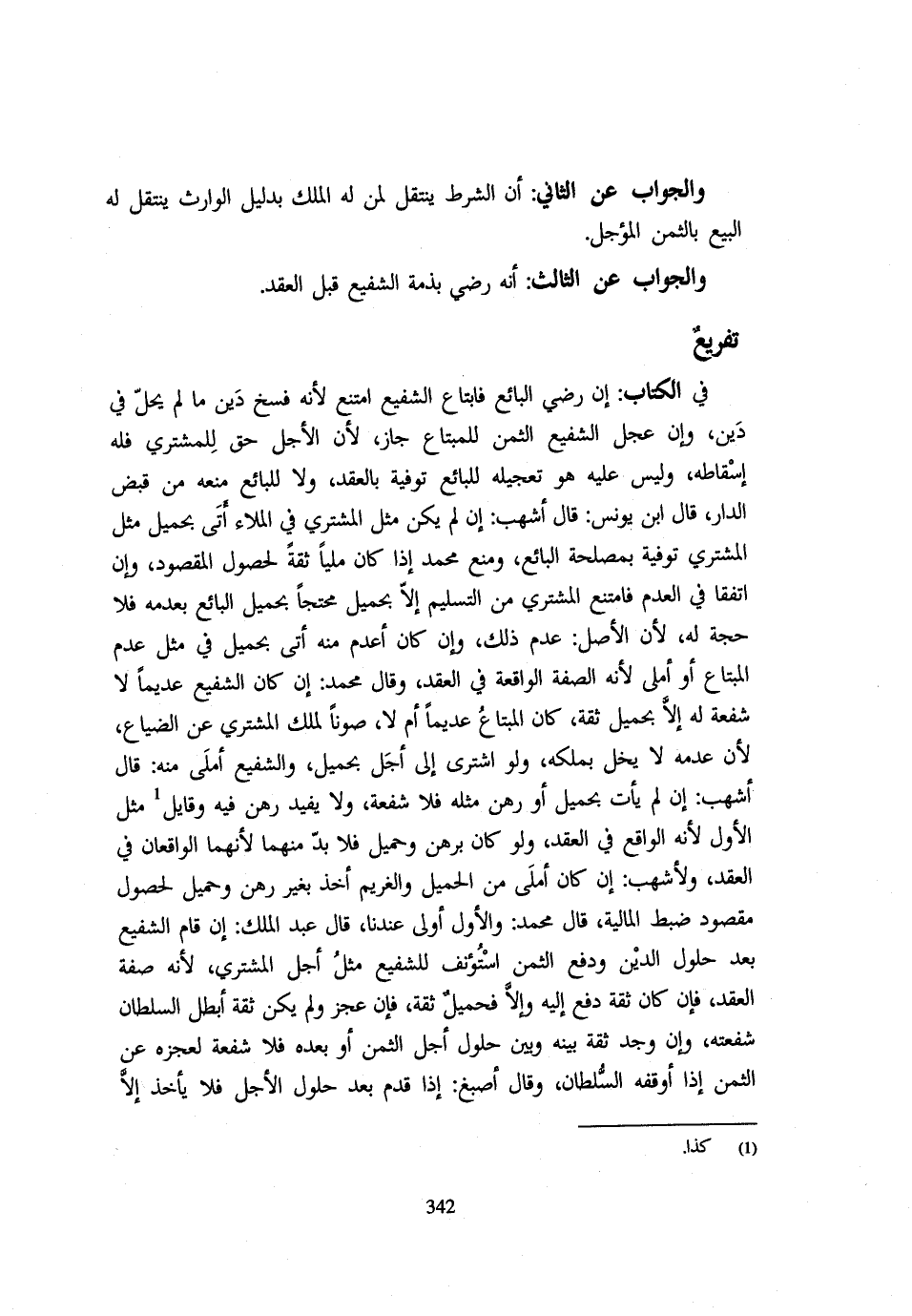 وَالْجَوَابُ عَنِ الثَّانِي أَنَّ الشَّرْطَ يَنْتَقِلُ لِمَنْ لَهُ الْمِلْكُ بِدَلِيلِ الْوَارِثِ يَنْتَقِلُ لَهُ الْبَيْعُ بِالثَّمَنِ الْمُؤَجَّلِ وَالْجَوَابُ عَنِ الثَّالِثِ أَنَّهُ رَضِيَ بِذِمَّةِ الشَّفِيعِ قَبْلَ الْعَقْدِ