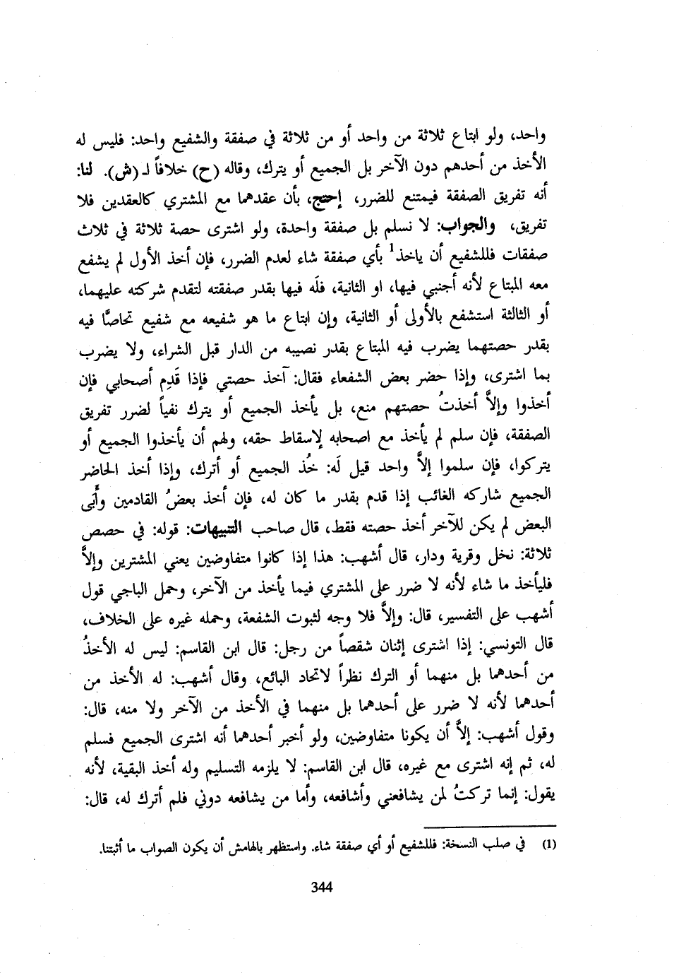 وَاحِدٌ وَلَوِ ابْتَاعَ ثَلَاثَةً مِنْ وَاحِدٍ أَوْ مِنْ ثَلَاثَةٍ فِي صَفْقَةٍ وَالشَّفِيعُ وَاحِدٌ فَلَيْسَ لَهُ الْأَخْذُ مِنْ أَحَدِهِمْ دُونَ الْآخَرِ بَلِ الْجَمِيعِ أَوْ يَتْرُكُ وَقَالَهُ ح خِلَافًا لِ ش لَنَا أَنَّهُ تَفْرِيقُ الصَّفْقَةِ فَيَمْتَنِعُ لِلضَّرَرِ احْتُجَّ بِأَنَّ عَقْدَهُمَا مَعَ الْمُشْتَرِي كَالْعَقْدَيْنِ فَلَا تَفْرِيقَ وَالْجَوَابُ لَا نُسَلِّمُ بَلْ صَفْقَةٌ وَاحِدَةٌ وَلَوِ اشْتَرَى حِصَّةَ ثَلَاثَةٍ فِي ثَلَاثِ صَفَقَاتِ فَلِلشَّفِيعِ أَنْ يَأْخُذَ بِأَيِّ صَفْقَةٍ شَاءَ لِعَدَمِ الضَّرَر فَإِن اخذ الأول لَمْ يَشْفَعْ مَعَهُ الْمُبْتَاعُ لِأَنَّهُ أَجْنَبِيٌّ فِيهَا أَوِ الثَّانِيَةَ فَلَهُ فِيهَا بِقَدْرِ صَفْقَتِهِ لِتَقَدُّمِ شَرِكَتِهِ عَلَيْهِمَا أَوِ الثَّالِثَةَ اسْتَشْفَعَ بِالْأُولَى أَوِ الثَّانِيَةِ وَإِنِ ابْتَاعَ مَا هُوَ شَفِيعُهُ مَعَ شَفِيعٍ تَحَاصَّا فِيهِ بِقَدْرِ حِصَّتِهِمَا يَضْرِبُ فِيهِ الْمُبْتَاعُ بِقَدْرِ نَصِيبِهِ مِنَ الدَّارِ قَبْلَ الشِّرَاءِ وَلَا يَضْرِبُ بِمَا اشْتَرَى وَإِذَا حَضَرَ بَعْضُ الشُّفَعَاءِ فَقَالَ آخُذُ حِصَّتِي فَإِذَا قَدِمَ أَصْحَابِي فَإِنْ أَخَذُوا وَإِلَّا أَخَذْتُ حِصَّتَهُمْ مُنِعَ بَلْ يَأْخُذُ الْجَمِيعَ أَوْ يَتْرُكُ نَفْيًا لِضَرَرِ تَفْرِيقِ الصَّفْقَةِ فَإِنْ سَلَّمَ لَمْ يَأْخُذْ مَعَ أَصْحَابِهِ لِإِسْقَاطِ حَقِّهِ وَلَهُمْ أَنْ يَأْخُذُوا الْجَمِيعَ أَوْ يتْركُوا فَإِن سلمُوا إِلَّا وَاحِد قِيلَ لَهُ خُذِ الْجَمِيعَ أَوِ اتْرُكْ وَإِذَا أَخَذَ الْحَاضِرُ الْجَمِيعَ شَارَكَهُ الْغَائِبُ إِذَا قَدِمَ بِقَدْرِ مَا كَانَ لَهُ فَإِنْ أَخَذَ بَعْضُ الْقَادِمِينَ وَأَبَى الْبَعْضُ لَمْ يَكُنْ لِلْآخَرِ أَخْذُ حِصَّتِهِ فَقَطْ قَالَ صَاحِبُ التَّنْبِيهَاتِ قَوْلُهُ فِي حِصَصٍ ثَلَاثَةٍ نَخْلٍ وَقَرْيَةٍ وَدَارٍ قَالَ أَشْهَبُ هَذَا إِذَا كَانُوا مُتَفَاوِضِينَ يَعْنِي الْمُشْتَرِينَ وَإِلَّا فَلْيَأْخُذْ مَا شَاءَ لِأَنَّهُ لَا ضَرَرَ عَلَى الْمُشْتَرِي فِيمَا يَأْخُذُ مِنَ الْآخَرِ وَحَمَلَ الْبَاجِيُّ قَوْلَ أَشْهَبَ عَلَى التَّفْسِيرِ قَالَ وَإِلَّا فَلَا وَجْهَ لِثُبُوتِ الشُّفْعَةِ وَحَمَلَهُ غَيْرُهُ عَلَى الْخِلَافِ قَالَ التُّونِسِيُّ إِذَا اشْتَرَى اثْنَانِ شِقْصًا مِنْ رَجُلٍ قَالَ ابْنُ الْقَاسِمِ لَيْسَ لَهُ الْأَخْذُ مِنْ أَحَدِهِمَا بَلْ مِنْهُمَا أَوِ التَّرْكُ نَظَرًا لِاتِّحَادِ الْبَائِعِ وَقَالَ أَشْهَبُ لَهُ الْأَخْذُ مِنْ أَحَدِهِمَا لِأَنَّهُ لَا ضَرَرَ عَلَى أَحَدِهِمَا بَلْ مِنْهُمَا فِي الْأَخْذِ مِنَ الْآخَرِ وَلَا مِنْهُ قَالَ وَقَوْلُ أَشْهَبَ إِلَّا أَنْ يَكُونَا مُتَفَاوِضَيْنِ وَلَوْ أَخْبَرَ أَحَدُهُمَا أَنَّهُ اشْتَرَى الْجَمِيعَ فَسَلَّمَ لَهُ ثُمَّ إِنَّهُ اشْتَرَى مَعَ غَيْرِهِ قَالَ ابْنُ الْقَاسِمِ لَا يَلْزَمُهُ التَّسْلِيمُ وَلَهُ أَخْذُ الْبَقِيَّةِ لِأَنَّهُ يَقُولُ إِنَّمَا تَرَكْتُ لِمَنْ يُشَافِعُنِي وَأُشَافِعُهُ وَأَمَّا مَنْ يُشَافِعُهُ دُونِي فَلَمْ أَتْرُكْ لَهُ قَالَ
