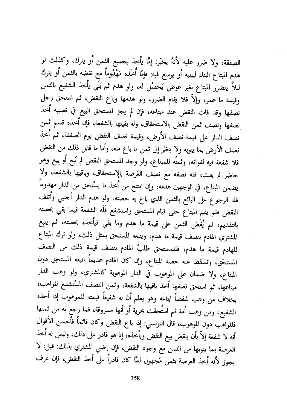 الصَّفْقَةُ وَلَا ضَرَرَ عَلَيْهِ لِأَنَّهُ يُخَيَّرُ إِمَّا يَأْخُذُ بِجَمِيعِ الثَّمَنِ أَوْ يَتْرُكُ وَكَذَلِكَ لَوْ هَدَمَ الْمُبْتَاعُ الْبِنَاءَ لِيَبْنِيَهُ أَوْ يُوَسِّعَ فِيهِ فَإِمَّا أَخَذَهُ مَهْدُومًا مَعَ نَقْضِهِ بِالثَّمَنِ أَوْ يتْرك لَيْلًا يَتَضَرَّرَ الْمُبْتَاعُ بِغَيْرِ عِوَضٍ يَحْصُلُ لَهُ وَلَوْ هَدَمَ ثُمَّ بَنَى يَأْخُذُ الشَّفِيعُ بِالثَّمَنِ وَقِيمَةِ مَا عُمِّرَ وَإِلَّا فَلَا يُقَامُ الضَّرَرُ وَلَوْ هَدَمَهَا وَبَاعَ النَّقْضَ ثُمَّ اسْتَحَقَّ رَجُلٌ نَصِفَهَا وَقَدْ فَاتَ النَّقْضُ عِنْدَ مُبْتَاعِهِ فَإِنْ لَمْ يُجِزِ الْمُسْتَحِقُّ الْبَيْعَ فِي نَصِيبِهِ أَخَذَ نِصْفَهَا وَنِصْفَ ثَمَنِ النَّقْضِ بِالِاسْتِحْقَاقِ وَلَهُ بَقِيَّتُهَا بِالشُّفْعَةِ فَإِنْ أَخَذَهُ قُسِّمَ ثَمَنُ نِصْفِ الدَّارِ عَلَى قِيمَةِ نِصْفِ الْأَرْضِ وَقِيمَةِ نِصْفِ النَّقْضِ يَوْمَ الصَّفْقَةِ ثُمَّ أَخَذَ نِصْفَ الْأَرْضِ بِمَا يَنُوبُهُ وَلَا يَنْظُرُ إِلَى ثَمَنِ مَا بَاعَ مِنْهُ وَأَمَّا مَا قَابَلَ ذَلِكَ مِنَ النَّقْضِ فَلَا شُفْعَةَ فِيهِ لِفَوَاتِهِ وَثَمَنُهُ لِلْمُبْتَاعِ وَلَوْ وَجَدَ الْمُسْتَحِقُّ النَّقْضَ لَمْ يَبِعْ أَوْ بِيعَ وَهُوَ حَاضِرٌ لَمْ يَفُتْ فَلَهُ نِصْفُهُ مَعَ نِصْفِ الْعَرْصَةِ بِالِاسْتِحْقَاقِ وَبَاقِيهَا بِالشُّفْعَةِ وَلَا يَضْمَنُ الْمُبْتَاعُ فِي الْوَجْهَيْنِ هَدْمَهُ وَإِنِ امْتَنَعَ مِنْ أَخْذِ مَا يَسْتَحِقُّ مِنَ الدَّارِ مَهْدُومًا فَلَهُ الرُّجُوعُ عَلَى الْبَائِعِ بِالثَّمَنِ الَّذِي بَاعَ بِهِ حِصَّتَهُ وَلَوْ هَدَمَ الدَّارَ أَجْنَبِيٌّ وَأَتْلَفَ النَّقْضَ فَلَمْ يَقُمِ الْمُبْتَاعَ حَتَّى قِيَامَ الْمُسْتَحِقِّ وَاسْتَشْفَعَ فَلَهُ الشُّفْعَة فِيمَا بَقِي بِحِصَّتِهِ بالتقديم ثُمَّ يَفُضُّ الثَّمَنَ عَلَى قِيمَةِ مَا هُدِمَ وَمَا بَقِيَ فَيَأْخُذُهُ بِحِصَّتِهِ ثُمَّ يَتْبَعُ الْمُشْتَرِي الْهَادِمَ بِنِصْفِ قِيمَةِ مَا هَدَمَ وَيَتْبَعَهُ الْمُسْتَحِقُّ بِمِثْلِ ذَلِكَ وَلَوْ تَرَكَ الْمُبْتَاعُ لِلْهَادِمِ قِيمَةَ مَا هَدَمَ فَلِلْمُسْتَحِقِّ طَلَبُ الْهَادِمِ بِنِصْفِ قِيمَةِ ذَلِكَ مِنَ النِّصْفِ الْمُسْتَحَقِّ وَتَسْقُطُ عَنْهُ حِصَّةُ الْمُبْتَاعِ وَإِنْ كَانَ الْهَادِمُ عَدِيمًا اتَّبَعَهُ الْمُسْتَحِقُّ دُونَ الْمُبْتَاعِ وَلَا ضَمَانَ عَلَى الْمَوْهُوبِ فِي الدَّار الْمَوْهُوبَة كالمشتري وَلَو وهب الدَّار متباعها ثُمَّ اسْتُحِقَّ نِصْفُهَا أَخَذَ بَاقِيهَا بِالشُّفْعَةِ وَثَمَنُ النِّصْفِ الْمُسْتَشْفَعِ لِلْوَاهِبِ بِخِلَافِ مَنْ وَهَبَ شِقْصًا ابْتَاعَهُ وَهُوَ يَعْلَمُ أَنَّ لَهُ شَفِيعًا قِيمَتُهُ لِلْمَوْهُوبِ إِذَا أَخَذَهُ الشَّفِيعُ وَمَنْ وَهَبَ أَمَةً ثُمَّ اسْتُحِقَّتْ بُحُرِّيَّةٍ أَوْ أَنَّهَا مَسْرُوقَةٌ فَمَا رَجَعَ بِهِ مِنْ ثَمَنِهَا فَلِلْوَاهِبِ دُونَ الْمَوْهُوبِ قَالَ التُّونِسِيُّ إِذَا بَاعَ النَّقْضَ وَكَانَ قَائِمًا فَأَحْسَنُ الْأَقْوَالِ أَنَّهُ لَا شُفْعَةَ إِلَّا بِأَنْ يَنْقُضَ بَيْعَ النَّقْضِ وَيَأْخُذَهُ إِذْ هُوَ قَادِرٌ عَلَى ذَلِكَ وَلَيْسَ لَهُ أَخْذُ الْعَرْصَةِ بِمَا يَنُوبُهَا مِنَ الثَّمَنِ مَعَ وُجُودِ النَّقْضِ فَإِنْ رَضِيَ الْمُشْتَرِي بِذَلِكَ قِيلَ لَا يَجُوزُ لِأَنَّهُ أَخَذَ الْعَرْصَةَ بِثَمَنٍ مَجْهُولٍ لَمَّا كَانَ قَادِرًا عَلَى أَخْذِ النَّقْضِ فَإِنْ عَرَفَ
