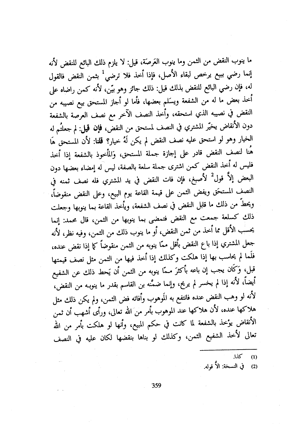 مَا يَنُوبُ النَّقْضُ مِنَ الثَّمَنِ وَمَا يَنُوبُ الْعَرْصَةَ قِيلَ لَا يَلْزَمْ ذَلِكَ الْبَائِعُ لِلنَّقْضِ لِأَنَّهُ إِنَّمَا رَضِيَ بِبَيْعٍ يُرَخَّصُ لِبَقَاءِ الْأَصْلِ فَإِذا اخذ فَلَا ترضي بِثَمَنِ النَّقْضِ فَالْقَوْلُ لَهُ فَإِنْ رَضِيَ الْبَائِعُ لِلنَّقْضِ بِذَلِكَ قِيلَ ذَلِكَ جَائِزٌ وَهُوَ بَيِّنٌ لِأَنَّهُ كَمَنْ رَاضَاهُ عَلَى أَخْذِ بَعْضِ مَا لَهُ مِنَ الشُّفْعَةِ وَيُسَلِّمُ بَعْضَهَا فَأَمَّا لَوْ أَجَازَ الْمُسْتَحِقُّ بَيْعَ نَصِيبِهِ مِنَ النَّقْضِ فِي نَصِيبِهِ الَّذِي اسْتَحَقَّهُ وَأَخَذَ النِّصْفَ الْآخَرَ مَعَ نِصْفِ الْعَرْصَةِ بِالشُّفْعَةِ دُونَ الْأَنْقَاضِ يُخَيِّرُ الْمُشْتَرِي فِي النِّصْفِ لِمُسْتَحَقٍّ مِنَ النَّقْضِ فَإِنْ قِيلَ لِمَ جَعَلْتُمْ لَهُ الْخِيَارَ وَهُوَ لَوِ اسْتُحِقَّ عَلَيْهِ نِصْفُ النَّقْضِ لَمْ يَكُنْ لَهُ خِيَارٌ قُلْنَا لِأَنَّ الْمُسْتَحِقَّ هَاهُنَا لِنِصْفِ النَّقْضِ قَادِرٌ عَلَى إِجَازَةِ جُمْلَةِ الْمُسْتَحَقِّ وَالْمَأْخُوذُ بِالشُّفْعَةِ إِذَا أُخِذَ فَلَيْسَ لَهُ أَخْذُ النَّقْضِ كَمَنِ اشْتَرَى جُمْلَةَ سِلْعَةٍ بِالصِّفَةِ لَيْسَ لَهُ إِمْضَاءُ بَعْضِهَا دُونَ الْبَعْضِ إِلَّا قَوْلٌ لِأَصْبَغَ فَإِنْ فَاتَ النَّقْضُ فِي يَدِ الْمُشْتَرِي فَلَهُ نِصْفُ ثَمَنِهِ فِي النِّصْفِ الْمُسْتَحَقِّ وَيَفُضُّ الثَّمَنَ عَلَى قِيمَةِ الْقَاعَةِ يَوْمَ الْبَيْعِ وَعَلَى النَّقْضِ مَنْقُوضًا وَيَحُطُّ مِنْ ذَلِكَ مَا قَابَلَ النَّقْضَ فِي نِصْفِ الشُّفْعَة وَيَأْخُذ بالقاعة مَا يَنُوبُهَا وَجَعَلَتُ ذَلِكَ كَسِلْعَةٍ جُمِعَتْ مَعَ النَّقْضِ فَتُمْضَى بِمَا يَنُوبُهَا مِنَ الثَّمَنِ قَالَ مُحَمَّدٌ إِنَّمَا يَحْسُبُ الْأَقَلَّ مِمَّا أَخَذَ مِنْ ثَمَنِ النَّقْضِ أَوْ مَا يَنُوبُ ذَلِكَ مِنَ الثَّمَنِ وَفِيهِ نَظَرٌ لِأَنَّهُ جَعَلَ الْمُشْتَرِي إِذَا بَاعَ النَّقْضَ بِأَقَلَّ مِمَّا يَنُوبُهُ مِنَ الثَّمَنِ مَنْقُوضًا كَمَا إِذَا نُقِضَ عِنْدَهُ فَلَمَّا لَمْ يُحَاسَبْ بِهَا إِذَا هَلَكَتْ وَكَذَلِكَ إِذَا أَخَذَ فِيهَا مِنَ الثَّمَنِ مِثْلَ نِصْفِ قِيمَتِهَا قَبْلُ وَكَانَ يَجِبُ إِنْ بَاعَهُ بِأَكْثَرِ مِمَّا يَنُوبُهُ مِنَ الثَّمَنِ أَنْ يَحُطَّ ذَلِكَ عَنِ الشَّفِيعِ أَيْضًا لِأَنَّهُ إِذَا لَمْ يَخْسَرْ لَمْ يَرْبَحْ وَإِنَّمَا ضمنه بن الْقَاسِمِ بِقَدْرِ مَا يَنُوبُهُ مِنَ النَّقْضِ لِأَنَّهُ لَوْ وَهَبَ النَّقْضَ عِنْدَهُ فَانْتَفَعَ بِهِ الْمَوْهُوبُ وَأَفَاتَهُ فَضَّ الثَّمَنَ وَلَمْ يَكُنْ ذَلِكَ مِثْلَ هَلَاكِهَا عِنْدَهُ لِأَنَّ هَلَاكَهَا عِنْدَ الْمَوْهُوبِ بِأَمْرٍ مِنَ اللَّهِ تَعَالَى وَرَأَى أَشْهَبُ أَنَّ ثَمَنَ الْأَنْقَاضِ يُؤْخَذُ بِالشُّفْعَةِ لَمَّا كَانَتْ فِي حُكْمِ الْمَبِيعِ وَإِنَّهَا لَوْ هَلَكَتْ بِأَمْرٍ مِنَ اللَّهِ تَعَالَى لَأَخَذَ الشَّفِيعُ الثَّمَنَ وَكَذَلِكَ لَوْ بَنَاهَا بِنَقْضِهَا لَكَانَ عَلَيْهِ فِي النِّصْفِ