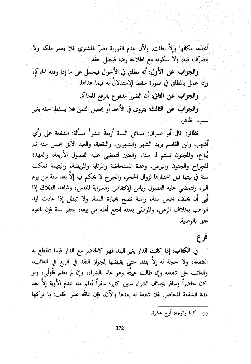 أَخَذَهَا مَكَانَهَا وَإِلَّا بَطَلَتْ وَلِأَنَّ عَدَمَ الْفَوْرِيَّةِ يضر بالمشري فَلَا يُعَمِّرُ مِلْكَهُ وَلَا يَتَصَرَّفُ فِيهِ وَلَا سُكُوتُهُ مَعَ اطِّلَاعِهِ رِضًا فَيَبْطُلُ حَقُّهُ وَالْجَوَابُ عَنِ الْأَوَّلِ أَنَّهُ مُطْلَقٌ فِي الْأَحْوَالِ فَيُحْمَلُ عَلَى مَا إِذَا وَقَفَهُ الْحَاكِمُ وَإِذَا عُمِلَ بِالْمُطْلَقِ فِي صُورَةٍ سَقَطَ الِاسْتِدْلَالُ بِهِ فِيمَا عَدَاهَا وَالْجَوَابُ عَنِ الثَّانِي أَنَّ الضَّرَرَ مَدْفُوعٌ بِالرَّفْعِ لِلْحَاكِمِ وَالْجَوَابُ عَنِ الثَّالِثِ يَتَرَوَّى فِي الْأَخْذِ أَوْ يُحَصِّلُ الثَّمَنَ فَلَا يَسْقُطُ حَقُّهُ بِغَيْرِ سَبَبٍ ظَاهِرٍ نَظَائِرُ قَالَ أَبُو عِمْرَانَ مسَائِل السّنة أَرْبَعَة عشر مَسْأَلَةُ الشُّفْعَةُ عَلَى رَأْيِ أَشْهَبَ وَابْنِ الْقَاسِمِ يَزِيدُ الشَّهْرَ وَالشَّهْرَيْنِ وَاللُّقَطَةُ وَالْعَبْدُ الْآبِقُ يُحْبَسُ سَنَةً ثُمَّ يُبَاعُ وَالْمَجْنُون تستم لَهُ سَنَةٌ وَالْعَنِّينُ لِتَمْضِيَ عَلَيْهِ الْفُصُولُ الْأَرْبَعَةُ وَالْعُهْدَةُ لِلْجِرَاحِ وَالْجُنُونِ وَالْبَرَصِ وَعِدَّةُ الْمُسْتَحَاضَةِ وَالْمُرْتَابَةِ وَالْمَرِيضَةِ وَالْيَتِيمَةُ تَمْكُثُ سَنَةً فِي بَيْتِهَا قَبْلَ اخْتِبَارِهَا لِزَوَالِ الْحَجْرِ وَالْجُرْحُ لَا يُحْكَمُ فِيهِ إِلَّا بَعْدَ سَنَةٍ مِنْ يَوْمِ الْبُرْءِ وَلِتَمْضِيَ عَلَيْهِ الْفُصُولُ وَيَأْمَنَ الِانْتِقَاضَ وَالسَّرَايَةُ لِلنَّفْسِ وَشَاهِدُ الطَّلَاقِ إِذَا أَبَى أَنْ يَحْلِفَ يُحْبَسُ سَنَةً وَالْهِبَةُ تَصِحُّ بِحِيَازَةِ السَّنَةِ وَلَا تُبْطَلُ إِذَا عَادَتْ لِيَدِ الْوَاهِبِ بِخِلَافِ الرَّهْنِ وَالْمُوصَى بِعِتْقِهِ امْتنع أَهْلُهُ مِنْ بَيْعِهِ يَنْتَظِرُ سَنَةً فَإِنْ بَاعُوهُ عَتَقَ بِالْوَصِيَّةِ