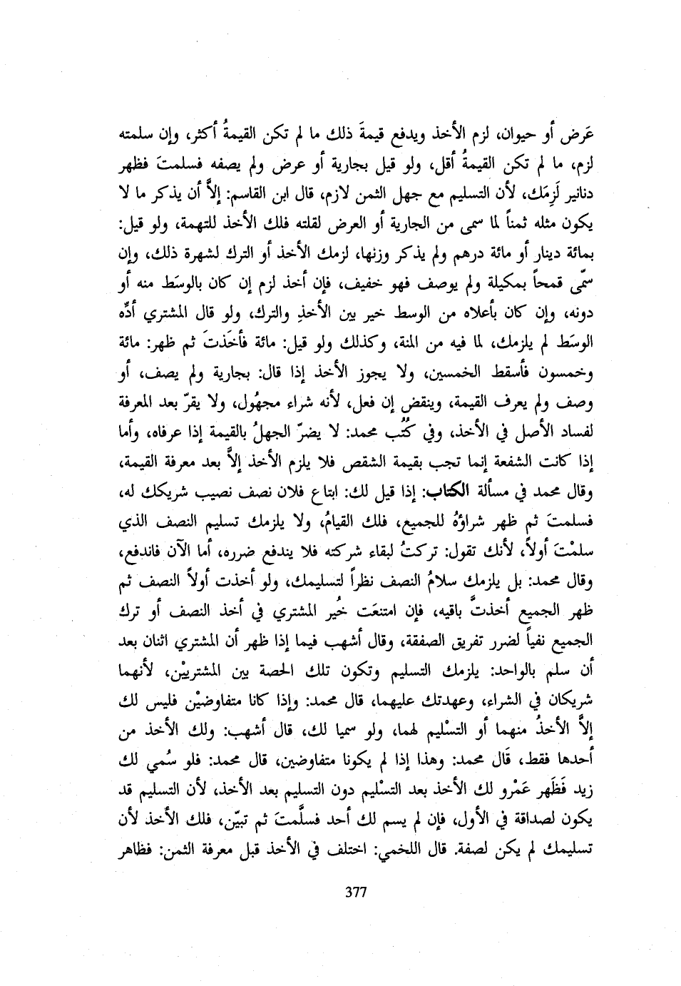 عَرَضٌ أَوْ حَيَوَانٌ لَزِمَ الْأَخْذُ وَيَدْفَعُ قِيمَةَ ذَلِكَ مَا لَمْ تَكُنِ الْقِيمَةُ أَكْثَرَ وَإِنْ سَلَّمْتَهُ لَزِمَ مَا لَمْ تَكُنِ الْقِيمَةُ أَقَلَّ وَلَوْ قِيلَ بِجَارِيَةٍ أَوْ عَرَضٍ وَلَمْ يَصِفْهُ فَسَلَّمْتَ فَظَهَرَ دَنَانِيرُ لَزِمَكَ لِأَنَّ التَّسْلِيمَ مَعَ جَهْلِ الثَّمَنِ لَازِمٌ قَالَ ابْنُ الْقَاسِمِ إِلَّا أَنْ يَذْكُرَ مَا لَا يَكُونُ مِثْلُهُ ثَمَنًا لِمَا سَمَّى مِنَ الْجَارِيَةِ أَوِ الْعَرَضِ لِقِلَّتِهِ فَلَكَ الْأَخْذُ لِلتُّهْمَةِ وَلَوْ قِيلَ بِمِائَةِ دِينَارٍ أَوْ مِائَةِ دِرْهَمٍ وَلَمْ يَذْكُرْ وَزْنَهَا لَزِمَكَ الْأَخْذُ أَوِ التَّرْكُ لِشُهْرَةِ ذَلِكَ وَإِنْ سَمَّى قَمْحًا بِمَكِيلَةٍ وَلَمْ يُوصَفْ فَهُوَ خَفِيفٌ فَإِنْ أَخَذَ لَزِمَ إِنْ كَانَ بِالْوَسَطِ مِنْهُ أَوْ دونه وان كَانَ باعلاه مِنَ الْوَسَطِ خُيِّرَ بَيْنَ الْأَخْذِ وَالتَّرْكِ وَلَوْ قَالَ الْمُشْتَرِيَ أَدِّهِ الْوَسَطَ لَمْ يَلْزَمْكَ لِمَا فِيهِ من الْمِنَّة وَكَذَلِكَ وَلَو قِيلَ مِائَةٌ فَأَخَذْتَ ثُمَّ ظَهَرَ مِائَةٌ وَخَمْسُونَ فَأَسْقَطَ الْخَمْسِينَ وَلَا يَجُوزُ الْأَخْذُ إِذَا قَالَ بِجَارِيَةٍ وَلَمْ يَصِفْ أَوْ وَصَفَ وَلَمْ يَعْرِفِ الْقِيمَةَ وَيُنْقَضْ إِنْ فَعَلَ لِأَنَّهُ شِرَاءُ مَجْهُولٍ وَلَا يُقَرُّ بَعْدَ الْمَعْرِفَةِ لِفَسَادِ الْأَصْلِ فِي الْأَخْذ وَفِي كتب مُحَمَّدٍ لَا يَضُرُّ الْجَهْلُ بِالْقِيمَةِ إِذَا عَرَفَاهُ وَأَمَّا إِذَا كَانَتِ الشُّفْعَةُ إِنَّمَا تَجِبُ بِقِيمَةِ الشِّقْصِ فَلَا يَلْزَمُ الْأَخْذُ إِلَّا بَعْدَ مَعْرِفَةِ الْقِيمَةِ وَقَالَ مُحَمَّدٌ فِي مَسْأَلَةِ الْكِتَابِ إِذَا قِيلَ لَكَ ابْتَاعَ فُلَانٌ نِصْفَ نَصِيبِ شَرِيكِكَ لَهُ فَسَلَّمْتَ ثُمَّ ظَهَرَ شِرَاؤُهُ لِلْجَمِيعِ فَلَكَ الْقِيَامُ وَلَا يَلْزَمُكَ تَسْلِيمُ النِّصْفِ الَّذِي سَلَّمْتَ أَوَّلًا لِأَنَّكَ تَقُولُ تَرَكْتَ لِبَقَاءِ شَرِكَتِهِ فَلَا يَنْدَفِعُ ضَرَرُهُ أَمَّا الْآنَ فَانْدَفَعَ وَقَالَ مُحَمَّدٌ بل يلزمك سَلام النِّصْفِ نَظَرًا لِتَسْلِيمِكَ وَلَوْ أَخَذْتَ أَوَّلًا النِّصْفَ ثُمَّ ظَهَرَ الْجَمِيعُ أَخَذْتَ بَاقِيهِ فَإِنِ امْتَنَعْتَ خُيِّرَ الْمُشْتَرِي فِي أَخْذِ النِّصْفِ أَوْ تَرْكِ الْجَمِيعِ نَفْيًا لِضَرَرِ تَفْرِيقِ الصَّفْقَةِ وَقَالَ أَشْهَبُ فِيمَا إِذَا ظَهَرَ أَنَّ الْمُشْتَرِي اثْنَانِ بَعْدَ أَنْ سَلَّمَ بِالْوَاحِدِ يَلْزَمُكَ التَّسْلِيمُ وَتَكُونُ تِلْكَ الْحِصَّةُ بَيْنَ الْمُشْتَرِيَيْنِ لِأَنَّهُمَا شَرِيكَانِ فِي الشِّرَاءِ وَعُهْدَتُكَ عَلَيْهِمَا قَالَ مُحَمَّدٌ وَإِذَا كَانَا مُتَفَاوِضَيْنِ فَلَيْسَ لَكَ إِلَّا الْأَخْذُ مِنْهُمَا أَوِ التَّسْلِيمُ لَهُمَا وَلَوْ سَمَّيَا لَكَ قَالَ أَشْهَبُ وَلَكَ الْأَخْذ من أَحدهَا فَقَطْ قَالَ مُحَمَّدٌ وَهَذَا إِذَا لَمْ يَكُونَا مُتَفَاوِضَيْنِ قَالَ مُحَمَّدٌ فَلَوْ سُمِّيَ لَكَ زَيْدٌ فَظَهَرَ عَمْرٌو لَكَ الْأَخْذُ بَعْدَ التَّسْلِيمِ دُونَ التَّسْلِيمِ بَعْدَ الْأَخْذِ لِأَنَّ التَّسْلِيمَ قَدْ يَكُونُ لِصَدَاقَةٍ فِي الْأَوَّلِ فَإِنْ لَمْ يُسَمِّ لَكَ أَحَدٌ فَسَلَّمْتَ ثُمَّ تَبَيَّنَ فَلَكَ الْأَخْذُ لِأَنَّ تَسْلِيمَكَ لَمْ يَكُنْ لِصِفَةٍ قَالَ الْلَخْمِيُّ اخْتُلِفَ فِي الْأَخْذِ قَبْلَ مَعْرِفَةِ الثَّمَنِ فَظَاهِرُ
