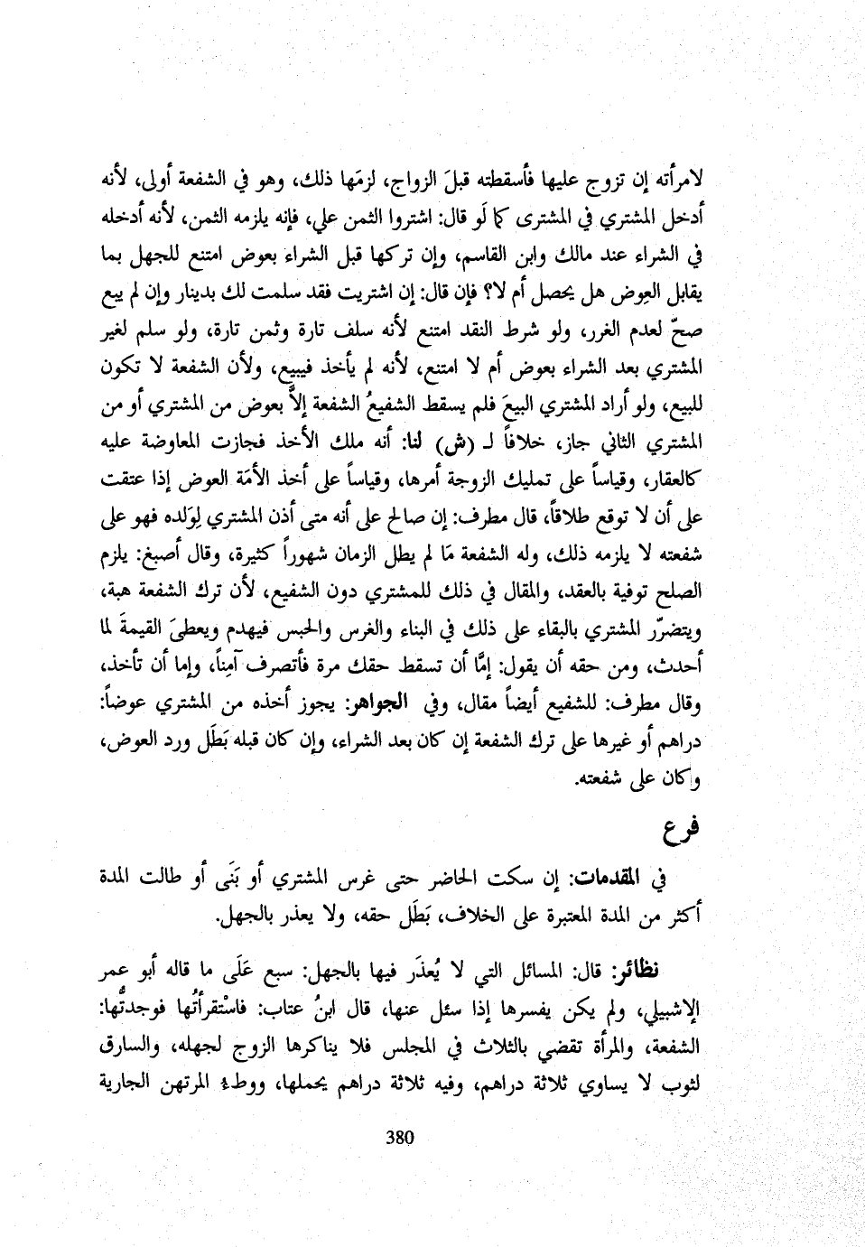فِي الْمُقَدِّمَاتِ إِنْ سَكَتَ الْحَاضِرُ حَتَّى غَرَسَ الْمُشْتَرِي أَوْ بَنَى أَوْ طَالَتِ الْمُدَّةُ أَكْثَرَ مِنَ الْمُدَّةِ الْمُعْتَبَرَةِ عَلَى الْخِلَافِ بَطَلَ حَقُّهُ وَلَا يُعْذَرُ بِالْجَهْلِ نَظَائِرُ قَالَ الْمَسَائِلُ الَّتِي لَا يُعْذَرُ فِيهَا بِالْجَهْلِ سَبْعٌ عَلَى مَا قَالَهُ أَبُو عُمَرَ الْإِشْبِيلِيُّ وَلَمْ يَكُنْ يُفَسِّرُهَا إِذَا سُئِلَ عَنْهَا قَالَ ابْنُ عَتَّابٍ فَاسْتَقْرَأْتُهَا فَوَجَدْتُهَا الشُّفْعَةَ وَالْمَرْأَةَ تَقْضِي بِالثَّلَاثِ فِي الْمَجْلِسِ فَلَا يُنَاكِرُهَا الزَّوْجُ لِجَهْلِهِ وَالسَّارِقَ لِثَوْبٍ لَا يُسَاوِي ثَلَاثَةَ دَرَاهِمَ وَفِيهِ ثَلَاثَةُ دَرَاهِمَ يَحْمِلُهَا وَوَطْءَ الْمُرْتَهِنِ الْجَارِيَةَ