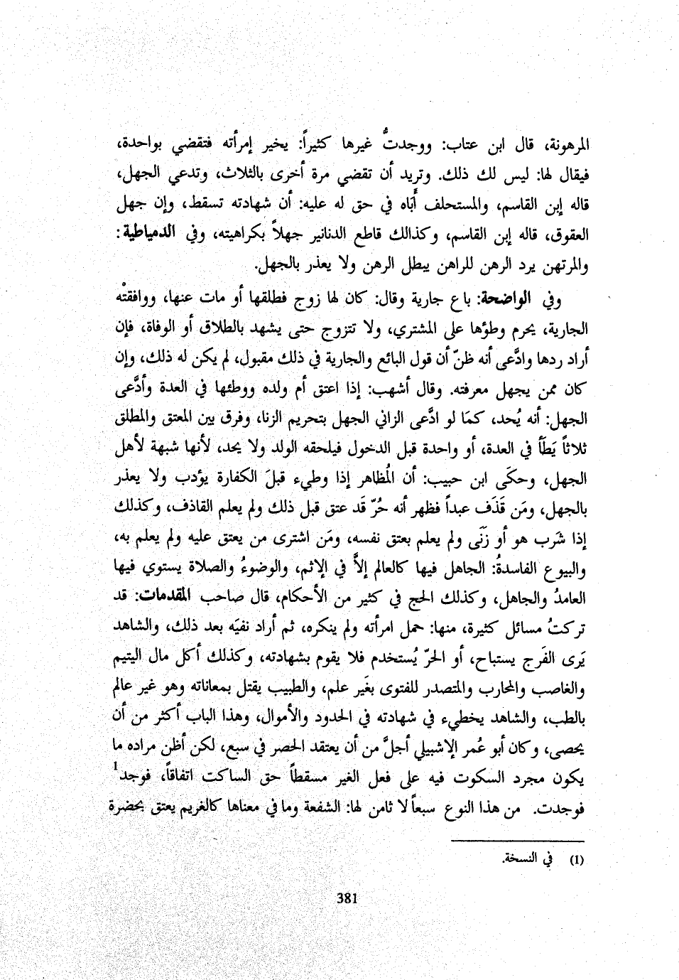 الْمَرْهُونَةَ قَالَ ابْنُ عَتَّابٍ وَوَجَدْتُ غَيْرَهَا كَثِيرًا يُخَيِّرُ امْرَأَتَهُ فَتَقْضِي بِوَاحِدَةٍ فَيُقَالُ لَهَا لَيْسَ لَكِ ذَلِكَ وَتُرِيدُ أَنْ تَقْضِيَ مَرَّةً أُخْرَى بِالثَّلَاثِ وَتَدَّعِي الْجَهْلَ قَالَهُ ابْنُ الْقَاسِمِ وَالْمُسْتَحْلِفُ أَبَاهُ فِي حَقٍّ لَهُ عَلَيْهِ أَنَّ شَهَادَتَهُ تَسْقُطُ وَإِنْ جَهِلَ الْعُقُوقَ قَالَهُ ابْنُ الْقَاسِمِ وَكَذَلِكَ قَاطِعُ الدَّنَانِيرِ جَهْلًا بِكَرَاهِيَتِهِ وَفِي الدِّمْيَاطِيَّةِ وَالْمُرْتَهِنُ يُرَدُّ الرَّهْنَ لِلرَّاهِنِ يَبْطُلُ الرَّهْنُ وَلَا يُعْذَرُ بِالْجَهْلِ وَفِي الْوَاضِحَةِ بَاعَ جَارِيَةً وَقَالَ كَانَ لَهَا زَوْجٌ فَطَلَّقَهَا أَوْ مَاتَ عَنْهَا وَوَافَقَتْهُ الْجَارِيَةُ يُحَرَّمُ وَطْؤُهَا عَلَى الْمُشْتَرِي وَلَا تَتَزَوَّجُ حَتَّى يَشْهَدَ بِالطَّلَاقِ أَوِ الْوَفَاةِ فَإِنْ أَرَادَ رَدَّهَا وَادَّعَى أَنَّهُ ظَنَّ أَنَّ قَوْلَ الْبَائِعِ وَالْجَارِيَةِ فِي ذَلِكَ مَقْبُولٌ لَمْ يَكُنْ لَهُ ذَلِكَ وَإِنْ كَانَ مِمَّنْ يُجْهَلُ مَعْرِفَتُهُ وَقَالَ أَشْهَبُ إِذَا أَعْتَقَ أُمَّ وَلَدِهِ وَوَطِئَهَا فِي الْعِدَّةِ وَادَّعَى الْجَهْلَ إِنَّهُ يُحَدُّ كَمَا لَو ادّعى الزَّانِي الْجَهْل بِتَحْرِيم الزِّنَا وَفَرَّقَ بَيْنَ الْمُعْتِقِ وَالْمُطَلِّقِ ثَلَاثًا يَطَأُ فِي الْعِدَّةِ أَوْ وَاحِدَةً قَبْلَ الدُّخُولِ فَيَلْحَقُهُ الْوَلَدُ وَلَا يُحَدُّ لِأَنَّهَا شُبْهَةٌ لِأَهْلِ الْجَهْلِ وَحَكَى ابْن حبيب أَن الْمظَاهر إِذا وطيء قَبْلَ الْكَفَّارَةِ يُؤَدَّبُ وَلَا يُعْذَرُ بِالْجَهْلِ وَمَنْ قَذَفَ عَبْدًا فَظَهَرَ أَنَّهُ حُرٌّ قَدْ عَتَقَ قَبْلَ ذَلِكَ وَلَمْ يَعْلَمِ الْقَاذِفُ وَكَذَلِكَ إِذَا شَرِبَ هُوَ أَوْ زَنَى وَلَمْ يَعْلَمْ بِعِتْقِ نَفْسِهِ وَمَنِ اشْتَرَى مَنْ يُعْتَقُ عَلَيْهِ وَلَمْ يَعْلَمْ بِهِ وَالْبُيُوعُ الْفَاسِدَةُ الْجَاهِلُ فِيهَا كَالْعَالِمِ إِلَّا فِي الْإِثْمِ وَالْوُضُوءُ وَالصَّلَاةُ يَسْتَوِي فِيهَا الْعَامِدُ وَالْجَاهِلُ وَكَذَلِكَ الْحَجُّ فِي كَثِيرٍ مِنَ الْأَحْكَامِ قَالَ صَاحِبُ الْمُقَدِّمَاتِ قَدْ تَرَكْتُ مَسَائِلَ كَثِيرَةً مِنْهَا حَمْلُ امْرَأَتِهِ وَلَمْ يُنْكِرْهُ ثُمَّ أَرَادَ نَفْيَهُ بَعْدَ ذَلِكَ وَالشَّاهِدُ يَرَى الْفَرْجَ يُسْتَبَاحُ أَوِ الْحُرُّ يُسْتَخْدَمُ فَلَا يَقُومُ بِشَهَادَتِهِ وَكَذَلِكَ اكل مَال الْيَتِيم وَالْغَاصِب الْمُحَارب وَالْمُتَصَدِّرِ لِلْفَتْوَى بِغَيْرِ عَلَمٍ وَالطَّبِيبُ يَقْتُلُ بِمُعَانَاتِهِ وَهُوَ غير عَالم بالطب وَالشَّاهِد يخطيء فِي شَهَادَتِهِ فِي الْحُدُودِ وَالْأَمْوَالِ وَهَذَا الْبَابِ أَكْثَرُ مِنْ أَنْ يُحْصَى وَكَانَ أَبُو عُمَرَ الْإِشْبِيلِيُّ أَجَلَّ مِنْ أَنْ يَعْتَقِدَ الْحَصْرَ فِي سَبْعٍ لَكِنْ أَظُنُّ مُرَادَهُ مَا يَكُونُ مُجَرَّدُ السُّكُوتِ فِيهِ عَلَى فِعْلِ الْغَيْرِ مُسْقِطًا حَقَّ السَّاكِت اتِّفَاقًا فَوجدَ فَوَجَدْتُ مِنْ هَذَا النَّوْعِ سَبْعًا لَا ثَامِنَ لَهَا الشُّفْعَةُ وَمَا فِي مَعْنَاهَا كَالْغَرِيمِ يُعْتَقُ بِحَضْرَة