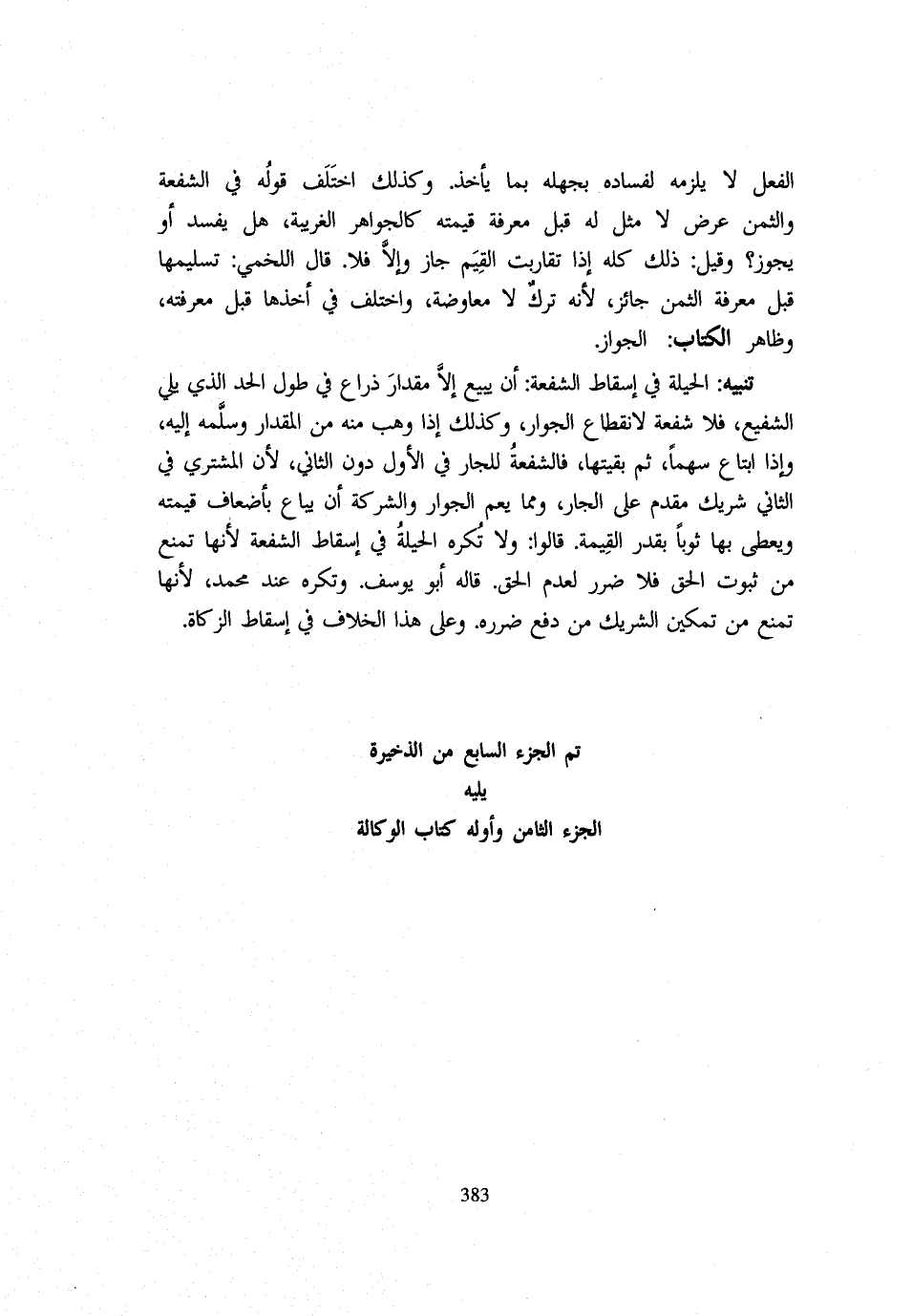 الْفِعْلَ لَا يَلْزَمُهُ لِفَسَادِهِ بِجَهْلِهِ بِمَا يَأْخُذُ وَكَذَلِكَ اخْتَلَفَ قَوْلُهُ فِي الشُّفْعَةِ وَالثَّمَنِ عَرَضٌ لَا مِثْلَ لَهُ قَبْلَ مَعْرِفَةِ قِيمَتِهِ كَالْجَوَاهِرِ الْغَرِيبَةِ هَلْ يَفْسُدُ أَوْ يَجُوزُ وَقِيلَ ذَلِكَ كُلُّهُ إِذَا تَقَارَبَتِ الْقِيَمُ جَازَ وَإِلَّا فَلَا قَالَ الْلَخْمِيُّ تَسْلِيمُهَا قَبْلَ مَعْرِفَةِ الثَّمَنِ جَائِزٌ لِأَنَّهُ تَرْكٌ لَا مُعَاوَضَةٌ وَاخْتُلِفَ فِي أَخْذِهَا قَبْلَ مَعْرِفَتِهِ وَظَاهِرُ الْكِتَابِ الْجَوَازُ تَنْبِيهٌ الْحِيلَةُ فِي إِسْقَاطِ الشُّفْعَةِ أَنْ يَبِيعَ إِلَّا مِقْدَارَ ذِرَاعٍ فِي طُولِ الْحَدِّ الَّذِي يَلِي الشَّفِيعَ فَلَا شُفْعَةَ لِانْقِطَاعِ الْجِوَارِ وَكَذَلِكَ إِذَا وَهَبَ مِنْهُ مِنَ الْمِقْدَارِ وَسَلَّمَهُ إِلَيْهِ وَإِذَا ابْتَاعَ سَهْمًا ثُمَّ بَقِيَّتَهَا فَالشُّفْعَةُ لِلْجَارِ فِي الْأَوَّلِ دُونَ الثَّانِي لِأَنَّ الْمُشْتَرِيَ فِي الثَّانِي شَرِيكٌ مُقَدَّمٌ عَلَى الْجَارِ وَمِمَّا يَعُمُّ الْجِوَارَ وَالشَّرِكَةَ أَنْ يُبَاعَ بِأَضْعَافِ قِيمَتِهِ وَيُعْطَى بِهَا ثَوْبًا بِقَدْرِ الْقِيمَةِ قَالُوا وَلَا تُكْرَهُ الْحِيلَةُ فِي إِسْقَاطِ الشُّفْعَةِ لِأَنَّهَا تَمْنَعُ مِنْ ثُبُوتِ الْحَقِّ فَلَا ضَرَرَ لِعَدَمِ الْحَقِّ قَالَهُ أَبُو يُوسُفَ وَتُكْرَهُ عِنْدَ مُحَمَّدٍ لِأَنَّهَا تَمْنَعُ مِنْ تَمْكِينِ الشَّرِيكِ مِنْ دَفْعِ ضَرَرِهِ وَعَلَى هَذَا الْخِلَافُ فِي إِسْقَاط الزَّكَاة تمّ الْجُزْء السَّابِع من الذَّخِيرَة يَلِيهِ الْجُزْء الثَّامِن واوله كتاب الْوكَالَة