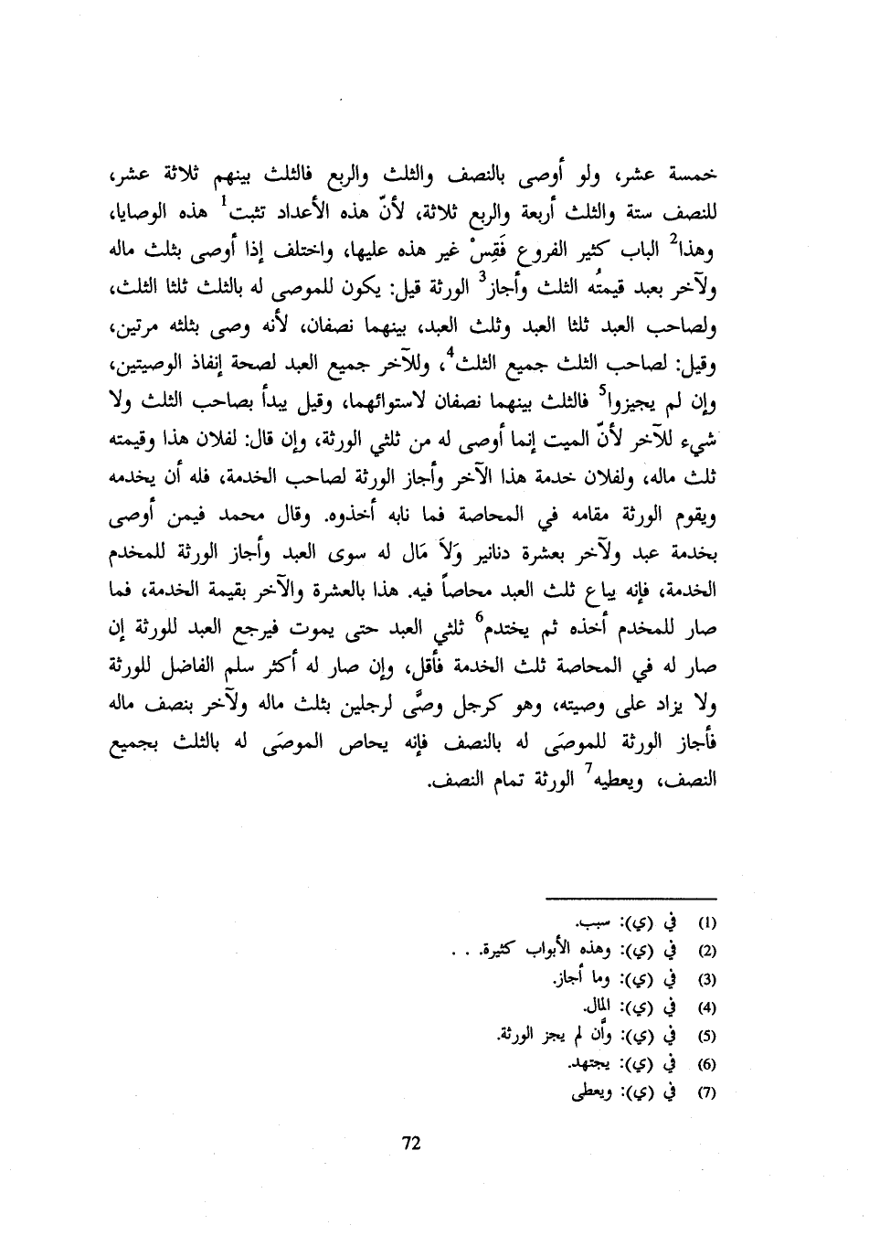 خَمْسَةَ عَشَرَ وَلَوْ أَوْصَى بِالنِّصْفِ وَالثُّلُثِ وَالرُّبُعِ فَالثُّلُثُ بَيْنَهُمْ ثَلَاثَةَ عَشَرَ لِلنِّصْفُ سِتَّةٌ وَالثُّلُثِ اربعة وَالرّبع ثَلَاثَةٌ لِأَنَّ هَذِهِ الْأَعْدَادَ تُثْبِتُ هَذِهِ الْوَصَايَا وَهَذَا الْبَابُ كَثِيرُ الْفُرُوعِ فَقِسْ غَيْرَ هَذِهِ عَلَيْهَا وَاخْتُلِفَ إِذَا أَوْصَى بِثُلُثِ مَالِهِ وَلِآخَرَ بِعَبْدٍ قِيمَتُهُ الثُّلُثُ وَأَجَازَ الْوَرَثَةُ قِيلَ يَكُونُ لِلْمُوصَى لَهُ بِالثُّلُثِ ثُلُثَا الثُّلُثِ وَلِصَاحِبِ الْعَبْدِ ثُلُثَا الْعَبْدِ وَثُلُثُ الْعَبْدِ بَيْنَهُمَا نِصْفَانِ لِأَنَّهُ وَصَّى بِثُلُثِهِ مَرَّتَيْنِ وَقِيلَ لِصَاحِبِ الثُّلُثِ جَمِيعُ الثُّلُثِ وَلِلْآخَرِ جَمِيعُ الْعَبْدِ لِصِحَّةِ إِنْفَاذِ الْوَصِيَّتَيْنِ وَإِنْ لَمْ يُجِيزُوا فَالثُّلُثُ بَيْنَهُمَا نِصْفَانِ لِاسْتِوَائِهِمَا وَقِيلَ يُبْدَأُ بِصَاحِبِ الثُّلُثِ وَلَا شَيْءَ لِلْآخَرِ لِأَنَّ الْمَيِّتَ إِنَّمَا أَوْصَى لَهُ مِنْ ثُلُثَيِ الْوَرَثَةِ وَإِنْ قَالَ لِفُلَانٍ هَذَا وَقِيمَتُهُ ثُلُثُ مَالِهِ وَلِفُلَانٌ خِدْمَةُ هَذَا الْآخَرِ وَأَجَازَ الْوَرَثَةُ لصَاحب الْخدمَة فَلهُ إِن يَخْدمه وَيقوم الْوَرَثَةُ مَقَامَهُ فِي الْمُحَاصَّةِ فَمَا نَابَهُ أَخَذُوهُ وَقَالَ مُحَمَّدٌ فِيمَنْ أَوْصَى بِخِدْمَةِ عَبْدٍ وَلِآخَرَ بِعَشَرَةِ دَنَانِيرَ وَلَا مَالَ لَهُ سِوَى الْعَبْدِ وَأَجَازَ الْوَرَثَةُ لِلْمُخْدَمِ الْخِدْمَةَ فَإِنَّهُ يُبَاعُ ثُلُثُ الْعَبْدِ مُحَاصًّا فِيهِ هَذَا بِالْعَشَرَةِ وَالْآخَرُ بِقِيمَةِ الْخِدْمَةِ فَمَا صَارَ لِلْمُخْدَمِ أَخَذُهُ ثُمَّ يَخْتَدِمُ ثُلُثَيِ الْعَبْدِ حَتَّى يَمُوتَ فَيَرْجِعُ الْعَبْدُ لِلْوَرَثَةِ إِنْ صَارَ لَهُ فِي الْمُحَاصَّةِ ثُلُثَ الْخِدْمَةِ فَأَقَلُّ وَإِنْ صَارَ لَهُ أَكْثَرُ سُلِّمَ الْفَاضِلُ لِلْوَرَثَةِ وَلَا يُزَادُ عَلَى وَصِيَّتِهِ وَهُوَ كَرَجُلٍ وَصَّى لِرَجُلَيْنِ بِثُلُثِ مَالِهِ وَلِآخَرَ بِنِصْفِ مَالِهِ فَأَجَازَ الْوَرَثَةُ لِلْمُوصَى لَهُ بِالنِّصْفِ فَإِنَّهُ يُحَاصُّ الْمُوصَى لَهُ بِالثُّلُثِ بِجَمِيعِ النِّصْفِ وَيُعْطِيهِ الْوَرَثَةُ تَمام النّصْف