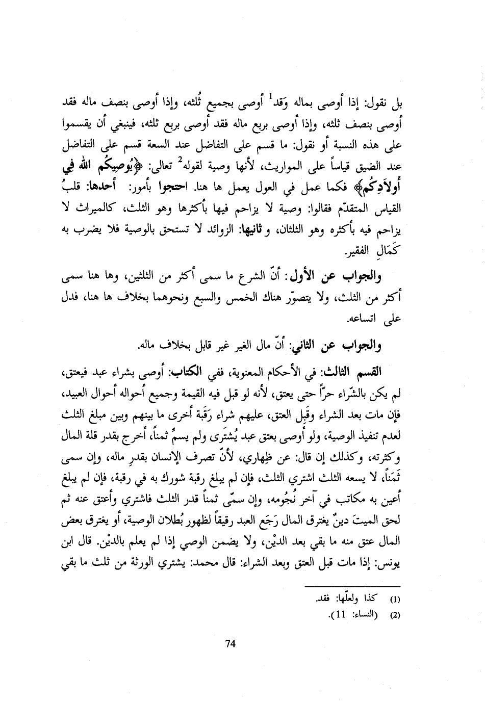 بل نقُول إِذا أوصى بِمَالِه وَقد أَوْصَى بِجَمِيعِ ثُلُثِهِ وَإِذَا أَوْصَى بِنِصْفِ مَالِهِ فَقَدْ أَوْصَى بِنِصْفِ ثُلُثِهِ وَإِذَا أَوْصَى بِرُبُعِ مَالِهِ فَقَدْ أَوْصَى بِرُبُعِ ثُلُثِهِ فَيَنْبَغِي أَنْ يُقَسَّمُوا عَلَى هَذِهِ النِّسْبَةِ أَوْ نَقُولُ مَا قُسِّمَ عَلَى التَّفَاضُلِ عِنْدَ السِّعَةِ قُسِّمَ عَلَى التَّفَاضُلِ عِنْدَ الضِّيقِ قِيَاسًا عَلَى الْمَوَارِيثِ لِأَنَّهَا وَصِيَّة لقَوْله تَعَالَى {يُوصِيكُم الله فِي أَوْلَادكُم} فَكَمَا عمل فِي الْعَوْل يعْمل هَاهُنَا احْتَجُّوا بِأُمُورٍ أَحَدُهَا قَلْبُ الْقِيَاسِ الْمُتَقَدِّمِ فَقَالُوا وَصِيَّة لَا يزاحم فِيهَا باكثرها وَهُوَ الثُّلُثَانِ وَهُوَ الثُّلُثُ كَالْمِيرَاثِ لَا يُزَاحَمُ فِيهِ بِأَكْثَرِهِ وَهُوَ الثُّلُثَانِ وَثَانِيهَا الزَّوَائِدُ لَا تُسْتَحَقُّ بِالْوَصِيَّةِ فَلَا يُضْرَبُ بِهِ كَمَالُ الْفَقِيرِ وَالْجَوَابُ عَنِ الْأَوَّلِ أَنَّ الشَّرْعَ مَا سَمَّى أَكْثَرَ مِنَ الثُّلثَيْنِ وَهَاهُنَا سَمَّى أَكْثَرَ مِنَ الثُّلُثِ وَلَا يُتَصَوَّرُ هُنَاكَ الْخمس والسبع وَنَحْوهمَا بِخِلَاف هَاهُنَا فَدلَّ على اتساعه وَالْجَوَاب عَن الثَّانِي أَنَّ مَالَ الْغَيْرِ غَيْرُ قَابِلٍ بِخِلَافِ مَاله الْقِسْمُ الثَّالِثُ فِي الْأَحْكَامِ الْمَعْنَوِيَّةِ فَفِي الْكِتَابِ أَوْصَى بِشِرَاءِ عَبْدٍ فَيُعْتَقُ لَمْ يَكُنْ بِالشِّرَاءِ حرا حَتَّى يعْتق لِأَنَّهُ لَو قبل فِيهِ الْقِيمَةَ وَجَمِيعُ أَحْوَالِهِ أَحْوَالُ الْعَبِيدِ فَإِنْ مَاتَ بَعْدَ الشِّرَاءِ وَقَبْلِ الْعِتْقِ عَلَيْهِمْ شِرَاءُ رَقَبَةٍ أُخْرَى مَا بَيْنَهُمْ وَبَيْنَ مَبْلَغِ الثُّلُثِ لِعَدَمِ تَنْفِيذِ الْوَصِيَّةِ وَلَوْ أَوْصَى بِعِتْقِ عَبْدٍ يُشْتَرَى وَلَمْ يُسَمِّ ثَمَنًا أُخْرِجَ بِقَدْرِ قِلَّةِ الْمَالِ وَكَثْرَتِهِ وَكَذَلِكَ إِنْ قَالَ عَنْ ظِهَارِي لِأَنَّ تَصَرُّفَ الْإِنْسَانِ بِقَدْرِ مَالِهِ وَإِنْ سَمَّى ثَمَنًا لَا يَسَعُهُ الثُّلُثُ اشْتُرِيَ الثُّلُثُ فَإِنْ لَمْ يَبْلُغْ رَقَبَةً شُورِكَ بِهِ فِي رَقَبَةٍ فَإِنْ لَمْ يَبْلَغْ أُعِينَ بِهِ مُكَاتَبٌ فِي آخِرِ نُجُومِهِ وَإِنْ سَمَّى ثَمَنًا قُدِّرَ الثُّلُثُ فَاشْتُرِيَ وَأُعْتِقَ عَنْهُ ثُمَّ لَحِقَ الْمَيِّتَ دَيْنٌ يَغْتَرِقُ الْمَالَ رَجَعَ الْعَبْدُ رَقِيقًا لِظُهُورِ بُطْلَانِ الْوَصِيَّةِ أَوْ يَغْتَرِقُ بَعْضَ الْمَالِ عَتَقَ مِنْهُ مَا بَقِيَ بَعْدَ الدَّيْنِ وَلَا يَضْمَنُ الْوَصِيُّ إِذَا لَمْ يَعْلَمْ بِالدَّيْنِ قَالَ ابْنُ يُونُسَ إِذَا مَاتَ قَبْلَ الْعِتْقِ وَبَعْدَ الشِّرَاءِ قَالَ مُحَمَّدٌ يَشْتَرِي الْوَرَثَةُ مِنْ ثُلُثِ مَا بَقِيَ
