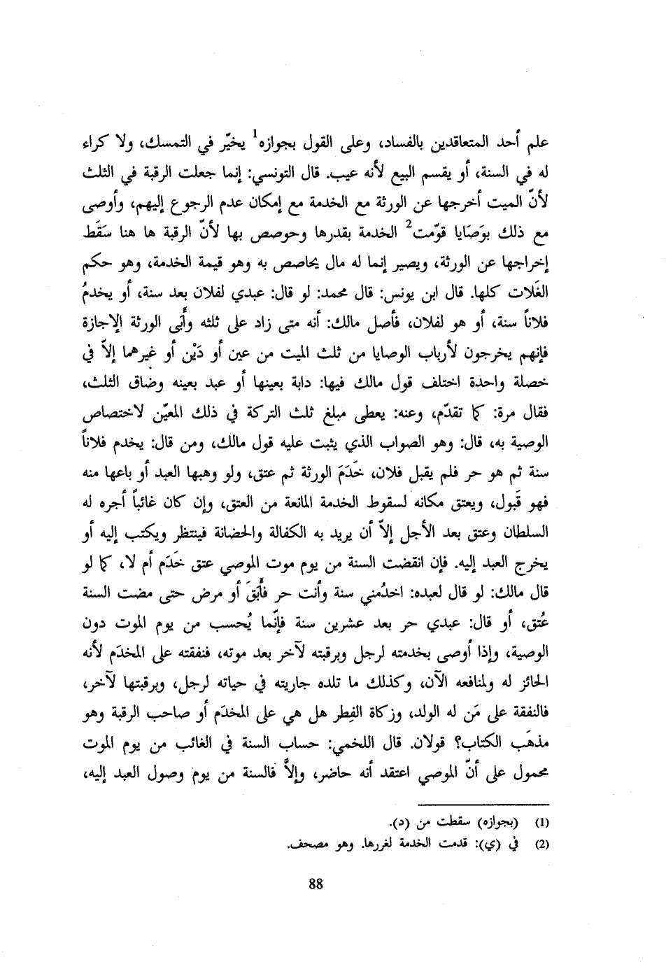 عِلْمِ أَحَدِ الْمُتَعَاقِدَيْنِ بِالْفَسَادِ وَعَلَى الْقَوْلِ بِجَوَازِهِ يُخَيَّرُ فِي التَّمَسُّكِ وَلَا كِرَاءَ لَهُ فِي السَّنَةِ أَوْ يُقَسَّمُ الْبَيْعُ لِأَنَّهُ عَيْبٌ قَالَ التُّونُسِيُّ إِنَّمَا جُعِلَتِ الرَّقَبَةُ فِي الثُّلُثِ لِأَنَّ الْمَيِّتَ أَخْرَجَهَا عَنِ الْوَرَثَةِ مَعَ الْخِدْمَةِ مَعَ إِمْكَانِ عَدَمِ الرُّجُوعِ إِلَيْهِمْ وَأَوْصَى مَعَ ذَلِكَ بِوَصَايَا قَوِّمَتِ الْخِدْمَةُ بِقَدْرِهَا وَحُوصِصَ بِهَا لِأَنَّ الرَّقَبَة هَاهُنَا سقط إخْرَاجهَا عَن الْوَرَثَة وَيصير إِنَّمَا لَهُ مَال يحاصص بِهِ وَهُوَ قِيمَةُ الْخِدْمَةِ وَهُوَ حُكْمُ الْغَلَّاتِ كُلِّهَا قَالَ ابْنُ يُونُسَ قَالَ مُحَمَّدٌ لَوْ قَالَ عَبْدِي لِفُلَانٍ بَعْدَ سَنَةٍ أَوْ يَخْدِمُ فُلَانًا سَنَةً أَوْ هُوَ لِفُلَانٍ فَأَصْلُ مَالِكٍ أَنَّهُ مَتَى زَادَ عَلَى ثُلُثِهِ وَأَبَى الْوَرَثَةُ الْإِجَازَةَ فَإِنَّهُمْ يُخْرِجُونَ لِأَرْبَابِ الْوَصَايَا مِنْ ثُلُثِ الْمَيِّتِ مِنْ عَيْنٍ أَوْ دَيْنٍ أَوْ غَيْرِهِمَا إِلَّا فِي خَصْلَةٍ وَاحِدَةٍ اخْتَلَفَ قَوْلُ مَالِكٍ فِيهَا دَابَّةٌ بِعَيْنِهَا أَوْ عَبْدٌ بِعَيْنِهِ وَضَاقَ الثُّلُثُ فَقَالَ مَرَّةً كَمَا تَقَدَّمَ وَعَنْهُ يُعْطَى مَبْلَغَ ثُلُثِ التَّرِكَةِ فِي ذَلِكَ الْمُعَيَّنِ لِاخْتِصَاصِ الْوَصِيَّةِ بِهِ قَالَ وَهُوَ الصَّوَابُ الَّذِي يَثْبُتُ عَلَيْهِ قَوْلُ مَالِكٍ وَمَنْ قَالَ يَخْدِمُ فُلَانًا سَنَةً ثُمَّ هُوَ حُرٌّ فَلَمْ يَقْبَلْ فُلَانٌ خَدَمَ الْوَرَثَةَ ثُمَّ عَتَقَ وَلَوْ وَهَبَهَا الْعَبْدَ أَوْ بَاعَهَا مِنْهُ فَهُوَ قَبُولٌ وَيُعْتَقُ مَكَانَهُ لِسُقُوطِ الْخِدْمَةِ الْمَانِعَةِ مِنَ الْعِتْقِ وَإِنْ كَانَ غَائِبًا أَجَّرَهُ لَهُ السُّلْطَانُ وَعَتَقَ بَعْدَ الْأَجَلِ إِلَّا أَن يُرِيد فِي الْكَفَالَةِ وَالْحَضَانَةِ فَيُنْتَظَرُ وَيُكْتَبُ إِلَيْهِ أَوْ يَخْرُجُ الْعَبْدُ إِلَيْهِ فَإِنِ انْقَضَتِ السَّنَةُ مِنْ يَوْمِ مَوْتِ الْمُوصِي عَتَقَ خَدَمَ أَمْ لَا كَمَا لَوْ قَالَ مَالِكٌ لَوْ قَالَ لِعَبْدِهِ اخْدِمْنِي سنه وَأَنت حرفأبق أَوْ مَرِضَ حَتَّى مَضَتِ السَّنَةُ عَتَقَ أَوْ قَالَ عَبْدِي حُرٌّ بَعْدَ عِشْرِينَ سَنَةً فَإِنَّمَا يُحْسَبُ مِنْ يَوْمِ الْمَوْتِ دُونَ الْوَصِيَّةِ وَإِذَا أَوْصَى بِخِدْمَتِهِ لِرَجُلٍ وَبِرَقَبَتِهِ لِآخَرَ بَعْدَ مَوْتِهِ فَنَفَقَتُهُ عَلَى الْمُخْدَمِ لِأَنَّهُ الْحَائِزُ لَهُ وَلِمَنَافِعِهِ الْآنَ وَكَذَلِكَ مَا تَلِدُهُ جَارِيَتُهُ فِي حَيَاتِهِ لِرَجُلٍ وَبِرَقَبَتِهَا لِآخَرَ فَالنَّفَقَةُ عَلَى مَنْ لَهُ الْوَلَدُ وَزَكَاةُ الْفِطْرِ هَلْ هِيَ عَلَى الْمُخْدَمِ أَوْ صَاحِبِ الرَّقَبَةِ وَهُوَ مَذْهَبُ الْكِتَابِ قَوْلَانِ قَالَ اللَّخْمِيُّ حِسَابُ السَّنَةِ فِي الْغَائِبِ مِنْ يَوْم الْمَوْت مَحْمُول على أَن المموصي اعْتَقَدَ أَنَّهُ حَاضِرٌ وَإِلَّا فَالسَّنَةُ مِنْ يَوْمِ وُصُولِ الْعَبْدِ إِلَيْهِ