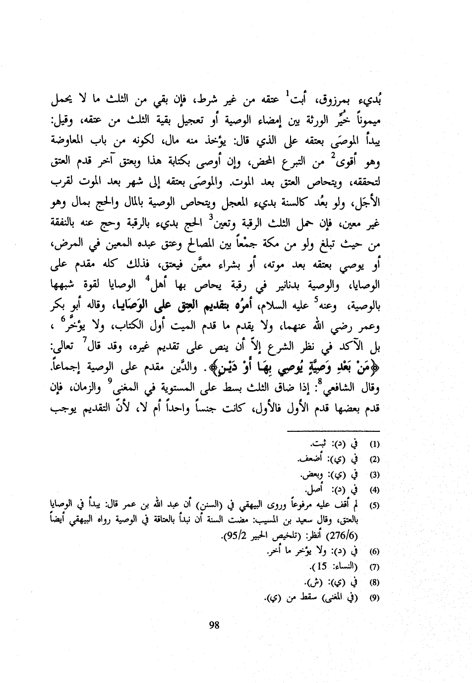 بديء بمرزوق أَبَت عِتْقَهُ مِنْ غَيْرِ شَرْطٍ فَإِنْ بَقِيَ مِنَ الثُّلُثِ مَا لَا يَحْمِلُ مَيْمُونًا خُيِّرَ الْوَرَثَةُ بَيْنَ إِمْضَاءِ الْوَصِيَّةِ أَوْ تَعْجِيلِ بَقِيَّةِ الثُّلُثِ مِنْ عِتْقِهِ وَقِيلَ يَبْدَأُ الْمُوصَى بِعِتْقِهِ عَلَى الَّذِي قَالَ يُؤْخَذُ مِنْهُ مَالٌ لِكَوْنِهِ مِنْ بَابِ الْمُعَاوَضَةِ وَهُوَ أَقْوَى مِنَ التَّبَرُّعِ الْمَحْضِ وَإِنْ أَوْصَى بِكِتَابَةِ هَذَا وَبِعِتْقِ آخِرَ قُدِّمَ الْعِتْقُ لِتَحَقُّقِهِ وَيُتَحَاصُّ الْعِتْقُ بَعْدَ الْمَوْتِ وَالْمُوصَى بِعِتْقِهِ إِلَى شهر بَعْدَ الْمَوْتِ لِقُرْبِ الْأَجَلِ وَلَوْ بَعُدَ كَالسَّنَةِ بديء الْمُعَجل وَيُتَحَاصُّ الْوَصِيَّةُ بِالْمَالِ وَالْحَجِّ بِمَالٍ وَهُوَ غَيْرُ مُعَيَّنٍ فَإِنْ حَمَلَ الثُّلُثُ الرَّقَبَةَ وَتَعَيَّنَ الْحَجُّ بديء بِالرَّقَبَةِ وَحُجَّ عَنْهُ بِالنَّفَقَةِ مِنْ حَيْثُ تَبْلُغُ وَلَو مِنْ مَكَّةَ جَمْعًا بَيْنَ الْمَصَالِحِ وَعَتَقَ عَبْدُهُ الْمُعَيَّنُ فِي الْمَرَضِ أَوْ يُوصِي بِعِتْقِهِ بَعْدَ مَوْتِهِ أَوْ بِشِرَاءٍ مُعَيَّنٍ فَيُعْتَقُ فَذَلِكَ كُلُّهُ مُقَدَّمٌ عَلَى الْوَصَايَا وَالْوَصِيَّةُ بِدَنَانِيرَ فِي رَقَبَةٍ يُحَاصُّ بِهَا أَهْلُ الْوَصَايَا لِقُوَّةِ شَبَهِهَا بِالْوَصِيَّةِ وَعنهُ - صَلَّى اللَّهُ عَلَيْهِ وَسَلَّم َ - أَمْرُهُ بِتَقْدِيمِ الْعِتْقِ عَلَى الْوَصَايَا وَقَالَهُ أَبُو بَكْرٍ وَعُمَرُ رَضِيَ اللَّهُ عَنْهُمَا وَلَا يُقَدَّمُ مَا قَدَّمَ الْمَيِّتُ أَوَّلَ الْكِتَابِ وَلَا يُؤَخَّرُ بَلِ الْآكَدُ فِي نَظَرِ الشَّرْعِ إِلَّا أَنْ ينص على تقدين غَيْرِهِ وَقَدْ قَالَ تَعَالَى {مِنْ بَعْدِ وَصِيَّةٍ يُوصِي بِهَا أَوْ دين} وَالدّين مقدم على الْوَصِيَّة اجماعاً وَقَالَ الشَّافِعِي إِذَا ضَاقَ الثُّلُثُ بَسَطَ عَلَى الْمُسْتَوِيَةِ فِي الْمُغْنِي وَالزَّمَانِ فَإِنْ قَدَّمَ بَعْضَهَا قَدَّمَ الْأَوَّلَ فَالْأَوَّلَ كَانَتْ جِنْسًا وَاحِدًا أَمْ لَا لِأَنَّ التَّقْدِيم يُوجب