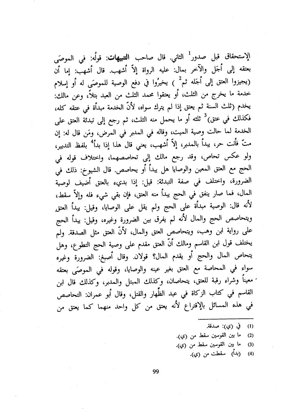 الِاسْتِحْقَاقَ قَبْلَ صُدُورِ الثَّانِي قَالَ صَاحِبُ التَّنْبِيهَاتِ قَوْلُهُ فِي الْمُوصَى بِعِتْقِهِ إِلَى أَجَلٍ وَالْآخَرِ بِمَال عَلَيْهِ الرواه وَإِلَّا أَشْهَبَ قَالَ أَشْهَبُ إِمَّا أَنْ يُجِيزُوا الْعِتْقَ إِلَى أَجَلِهِ ثُمَّ يُخَيَّرُوا فِي دَفْعِ الْوَصِيَّةِ لِلْمُوصَى لَهُ أَوْ إِسْلَامِ خِدْمَةِ مَا يَخْرُجُ من الثُّلُث أَو يعتقوا مُحَمَّد الثُّلُثَ مِنَ الْعَبْدِ بَتْلًا وَعَنْ مَالِكٍ يَخْدِمُ ثُلُثَ السَّنَةِ ثُمَّ يُعْتَقُ إِذَا لَمْ يَتْرُكْ سِوَاهُ لِأَنَّ الْخِدْمَةَ مَبْدَأَةٌ فِي عِتْقِهِ كُلِّهِ فَكَذَلِكَ فِي عِتْقِ ثُلُثِهِ أَوْ مَا يُحْمَلُ مِنْهُ الثُّلُثُ ثُمَّ رَجَعَ إِلَى تَبْدِئَةِ الْعِتْقِ عَلَى الْخِدْمَةِ لَمَّا حَالَتْ وَصِيَّةُ الْمَيِّتِ وَقَالَهُ فِي الْمُدَبَّرِ فِي الْمَرَضِ وَمَنْ قَالَ لَهُ إِن مت فَأَنت فحر يُبْدَأُ بِالْمُدَبَّرِ إِلَّا أَشْهَبَ يَعْنِي قَالَ هَذَا إِذَا بَدَأَ بِلَفْظِ التَّدْبِيرِ وَلَوْ عَكَسَ تَحَاصَّ وَقَدْ رَجَعَ مَالِكٌ إِلَى تَحَاصُصِهِمَا وَاخْتِلَافُ قَوْلِهِ فِي الْحَجِّ مَعَ الْعِتْقِ الْمُعَيَّنِ وَالْوَصَايَا هَلْ يَبْدَأُ أَوْ يُحَاصِصُ قَالَ الشُّيُوخُ ذَلِكَ فِي الضَّرُورَة وَاخْتلف فِي صفة التبدئه قيل إِذا بديء بِالْعِتْقِ أُضِيفَ لِوَصِيَّةِ الْمَالِ فَمَا صَارَ يُنْفَقُ فِي الْحَجِّ يُبْدَأُ مِنْهُ الْعِتْقُ فَإِنْ بَقِيَ شَيْءٌ فَلَهُ وَإِلَّا سَقَطَ لِأَنَّهُ قَالَ الْوَصِيَّةُ مُبَدَّأَةٌ عَلَى الْحَجِّ وَلَمْ يَقُلْ عَلَى الْوَصَايَا وَقِيلَ يُبْدَأُ الْعِتْقُ وَيُتَحَاصَصُ الْحَجُّ وَالْمَالُ لِأَنَّهُ لم يفرق بَين الضَّرُورَة وَغَيْرِهِ وَقِيلَ يَبْدَأُ الْحَجَّ عَلَى رِوَايَةِ ابْنِ وَهْبٍ وَيَتَحَاصَصُ الْعِتْقَ وَالْمَالَ لِأَنَّ الْعِتْقَ مِثْلُ الصَّدَقَةِ وَلِمَ يَخْتَلِفْ قَوْلُ ابْنِ الْقَاسِمِ وَمَالِكٍ أَن يعْتق مُقَدَّمٌ عَلَى وَصِيَّةِ الْحَجِّ التَّطَوُّعِ وَهَلْ يُتَحَاصُّ المَال وَالْحج إِن يقدم المَال قولأن وَقَالَ اصبغ الضَّرُورَة وَغَيْرُهُ سَوَاءٌ فِي الْمُحَاصَّةِ مَعَ الْعِتْقِ بِغَيْرِ عَيْنِهِ وَالْوَصَايَا وَقَوْلُهُ فِي الْمُوصَى بِعِتْقِهِ مُعَيَّنًا وَشِرَاءُ رَقَبَةٍ لِلْعِتْقِ يَتَحَاصَّانِ وَكَذَلِكَ الْمُبَتَّلُ وَالْمُدَبَّرُ وَكَذَلِكَ قَالَ ابْنُ الْقَاسِمِ فِي كِتَابِ الزَّكَاةِ فِي عَبْدِ الظِّهَارِ وَالْقَتْلِ وَقَالَ أَبُو عِمْرَانَ التَّحَاصُصُ فِي هَذِهِ الْمَسَائِلِ بِالِاقْتِرَاعِ لِأَنَّهُ يُعْتَقُ مِنْ كُلِّ وَاحِدٍ مِنْهُمَا كَمَا يُعْتَقُ مِنَ