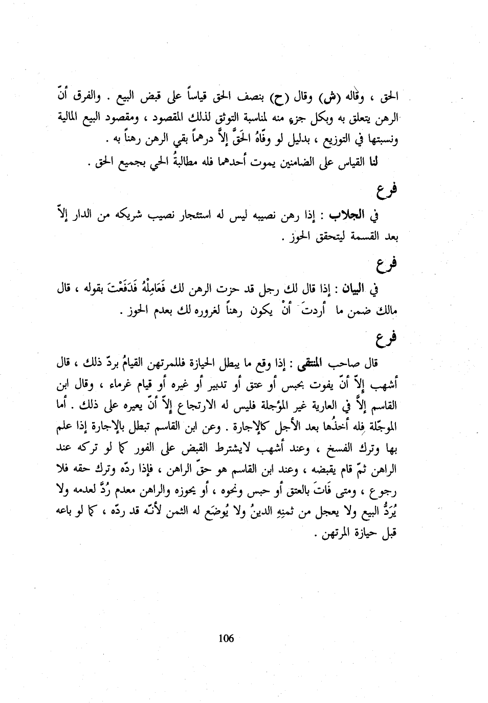 فِي الْجَلَّابِ: إِذَا رَهَنَ نَصِيبُهُ لَيْسَ لَهُ اسْتِئْجَارُ نَصِيبِ شَرِيكِهِ مِنَ الدَّارِ إِلَّا بَعْدَ الْقِسْمَةِ لِيَتَحَقَّقَ الْحَوْزُ