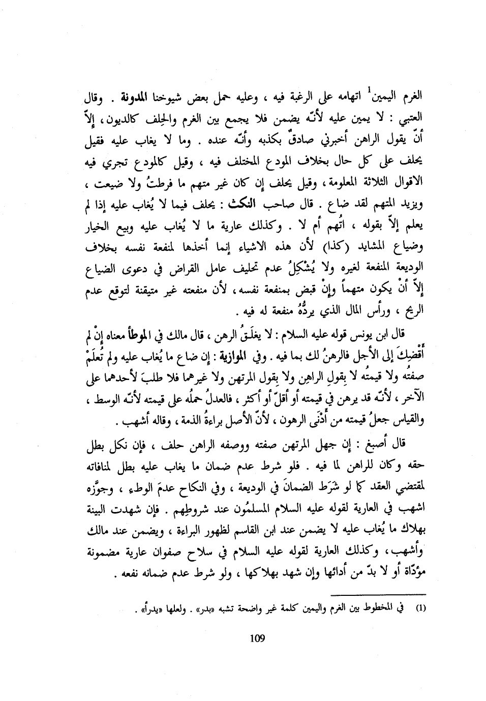 الْغرم الْيَمِينَ اتِّهَامَهُ عَلَى الرَّغْبَةِ فِيهِ وَعَلَيْهِ حَمَلَ بعض شيوخيا الْمُدَوَّنَةَ وَقَالَ الْعُتْبِيُّ: لَا يَمِينَ عَلَيْهِ لِأَنَّهُ يُضَمَّنُ فَلَا يُجْمَعُ بَيْنَ الْغُرْمِ وَالْحَلِفِ كَالدُّيُونِ إِلَّا أَنْ يَقُولَ الرَّاهِنُ أَخْبَرَنِي صادقٌ بِكَذِبِهِ وَأَنه عِنْده وَمَا لايغاب عَلَيْهِ فَقِيلَ يَحْلِفُ عَلَى كُلِّ حَالٍ بِخِلَافِ الْمُودَعِ الْمُخْتَلَفِ فِيهِ وَقِيلَ كَالْمُودَعِ تَجْرِي فِيهِ الْأَقْوَالُ الثَّلَاثَةُ الْمَعْلُومَةُ وَقِيلَ يَحْلِفُ إِنْ كَانَ غَيْرَ مُتَّهَمٍ مَا فَرَّطْتُ وَلَا ضَيَّعْتُ وَيَزِيدُ الْمُتَّهم لقد ضَاعَ قَالَ صَاحب النكث: يحلف فِيمَا لايُغاب عَلَيْهِ إِذَا لَمْ يُعْلَمْ إِلَّا بِقَوْلِهِ اتُهم أَمْ لَا وَكَذَلِكَ عَارِيَةُ مَا لَا يُغاب عَلَيْهِ وَبيع الْخِيَار وضياع المشايد ((كَذَا) لِأَنَّ هَذِهِ الْأَشْيَاءَ إِنَّمَا أَخَذَهَا لِمَنْفَعَةِ نَفْسِهِ بِخِلَافِ الْوَدِيعَةِ الْمَنْفَعَةِ لِغَيْرِهِ وَلَا يُشكل عَدَمُ تَحْلِيفِ عَامِلِ الْقِرَاضِ فِي دَعْوَى الضَّيَاعِ إِلَّا أَن يكون مُتَّهمًا وَإِن قبض بِمَنْفَعَة نَفْسِهِ لِأَنَّ مَنْفَعَتَهُ غَيْرُ مُتَيَقَّنَةٍ لِتَوَقُّعِ عَدَمِ الرِّبْح وَرَأس المَال الَّذِي يردُّه مَنْفَعَةَ لَهُ فِيهِ قَالَ ابْنُ يُونُسَ قَوْلُهُ - صَلَّى اللَّهُ عَلَيْهِ وَسَلَّم َ -: لَا يغلَق الرَّهْنُ قَالَ مَالِكٌ فِي الْمُوَطَّأِ مَعْنَاهُ إِنْ لَمْ أقضِك إِلَى الْأَجَلِ فَالرَّهْنُ لَكَ بِمَا فِيهِ وَفِي الْمُوَازِيَةِ: إِنْ ضَاعَ مَا يُغاب عَلَيْهِ وَلَمْ تُعلم صِفَتُهُ وَلَا قِيمَتُهُ لَا بِقَوْلِ الرَّاهِنِ وَلَا بِقَوْلِ الْمُرْتَهِنِ وَلَا غَيْرِهِمَا فَلَا طَلَبَ لِأَحَدِهِمَا عَلَى الْآخَرِ لِأَنَّهُ قَدْ يُرْهَنُ فِي قِيمَتِهِ أَوْ أَقَلَّ أَوْ أَكْثَرَ فَالْعَدْلُ حَمْلُهُ عَلَى قِيمَتِهِ لِأَنَّهُ الْوَسَطُ وَالْقِيَاسُ جعلُ قِيمَتِهِ مِنْ أَدْنَى الرُّهُونِ لِأَنَّ الْأَصْلَ بَرَاءَةُ الذِّمَّةِ وَقَالَهُ أَشْهَبُ قَالَ أَصْبَغُ: إِنْ جَهِلَ الْمُرْتَهِنُ صِفَتَهُ وَوَصَفَهُ الرَّاهِنُ حَلَفَ فَإِنْ نَكَلَ بَطَلَ حَقُّهُ وَكَانَ لِلرَّاهِنِ لما فِيهِ فَلَوْ شَرَطَ عَدَمَ ضَمَانِ مَا يُغَابُ عَلَيْهِ بَطَلَ لِمُنَافَاتِهِ لِمُقْتَضَى الْعَقْدِ كَمَا لَوْ شَرط الضَّمَانَ فِي الْوَدِيعَةِ وَفِي النِّكَاحِ عَدَمَ الْوَطْء وجوَّزه أَشهب فِي الْعَارِية لقولة - صَلَّى اللَّهُ عَلَيْهِ وَسَلَّم َ - الْمُسْلِمُونَ عِنْدَ شُرُوطِهِمْ فَإِنْ شَهِدَتِ الْبَيِّنَةُ بِهَلَاكِ مَا يُغاب عَلَيْهِ لايضمن عِنْدَ ابْنِ الْقَاسِمِ لِظُهُورِ الْبَرَاءَةِ وَيَضْمَنُ عِنْدَ مَالِكٍ وَأَشْهَبَ وَكَذَلِكَ الْعَارِيَةُ لِقَوْلِهِ عَلَيْهِ السَّلَامُ فِي سِلَاحِ صَفْوَانَ عَارِيَةٌ مَضْمُونَةٌ مُؤَدَّاةٌ أَوْ لَا بُدَّ مِنْ أَدَائِهَا وَإِنْ شَهِدَ بِهَلَاكِهَا وَلَوْ شَرَطَ عَدَمَ ضَمَانِهِ نَفْعَهُ