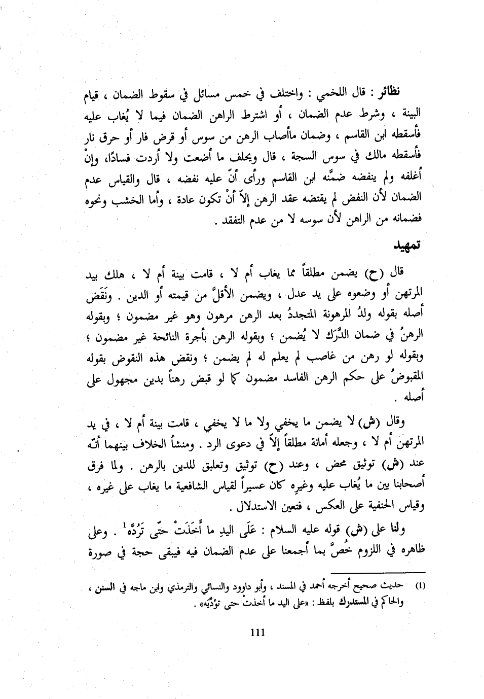 نَظَائِرٌ: قَالَ اللَّخْمِيُّ: وَاخْتُلِفَ فِي خَمْسِ مَسَائِلَ فِي سُقُوط الضَّمَان قيام الْبَيِّنَةِ وَشَرْطِ عَدَمِ الضَّمَانِ أَوِ اشْتَرَطَ الرَّاهِنُ الضَّمَانِ فِيمَا لَا يُغاب عَلَيْهِ فَأَسْقَطَهُ ابْنُ الْقَاسِمِ وَضَمَانِ مَا أَصَابَ الرَّهْنَ مِنْ سُوسٍ أَوْ قَرْضِ فَأْرٍ أَوْ حَرْقِ نَارٍ فَأَسْقَطَهُ مَالِكٌ فِي سُوسِ السَّجَّةِ قَالَ وَيَحْلِفُ مَا أضعت وَلَا أردْت فَسَادًا وَإِن أغلفه وَلم ينفضه ضمنه ابْن الْقَاسِم وَأرى أَنَّ عَلَيْهِ نَفْضَهُ قَالَ وَالْقِيَاسُ عَدَمُ الضَّمَانِ لِأَنَّ النَّفْضَ لَمْ يَقْتَضِهِ عَقْدُ الرَّهْنِ إِلَّا أَنْ تَكُونَ عَادَةً وَأَمَّا الْخَشَبُ وَنَحْوُهُ فَضَمَانُهُ مِنَ الرَّاهِنِ لِأَنَّ سُوسَهُ لَا مِنْ عَدَمِ التَّفَقُّدِ تَمْهِيدٌ قَالَ (ح) يَضْمَنُ مُطْلَقًا مِمَّا يُغَاب أَمْ لَا قَامَتْ بَيِّنَةٌ أَمْ لَا هَلَكَ بِيَدِ الْمُرْتَهِنِ أَوْ وَضَعُوهُ عَلَى يَدِ عَدْلٍ وَيَضْمَنُ الْأَقَلَّ مَنْ قِيمَتِهِ أَوِ الدَّيْنَ وَنَقَضَ أَصْلَهُ بِقَوْلِهِ وَلَدُ الْمَرْهُونَةِ الْمُتَجَدِّدُ بَعْدَ الرَّهْنِ مَرْهُونٌ وَهُوَ غَيْرُ مَضْمُونٍ وَبِقَوْلِهِ الرَّهْنُ فِي ضَمَانِ الدَّرَكِ لَا يُضمن وَبِقَوْلِهِ الرَّهْنُ بِأُجْرَةِ النَّائِحَةِ غَيْرُ مَضْمُونٍ وَبِقَوْلِهِ لَوْ رَهَنَ مِنْ غَاصِب لم يعلم لَهُ لَمْ يَضْمَنْ وَنَقَضَ هَذِهِ النُّقُوضَ بِقَوْلِهِ الْمَقْبُوضُ عَلَى حُكْمِ الرَّهْنِ الْفَاسِدِ مَضْمُونٌ كَمَا لَوْ قَبَضَ رَهْنًا بِدَيْنٍ مَجْهُولٍ عَلَى أَصْلِهِ وَقَالَ (ش) لَا يَضْمَنُ مَا يَخْفَى وَلَا مَا لَا يَخْفَى قَامَتْ بَيِّنَةٌ أَمْ لَا فِي يَدِ الْمُرْتَهِنِ أَمْ لَا وَجَعَلَهُ أَمَانَةً مُطْلَقًا إِلَّا فِي دَعْوَى الرَّدِّ وَمَنْشَأُ الْخِلَافِ بَيْنَهُمَا أَنَّهُ عِنْدَ (ش) تَوْثِيقٌ مَحْضٌ وَعِنْدَ (ح) تَوْثِيقٌ وَتَعْلِيقٌ لِلدَّيْنِ بِالرَّهْنِ وَلَمَّا فَرَّقَ أَصْحَابُنَا بَيْنَ مَا يُغاب عَلَيْهِ وَغَيْرِهِ كَانَ عَسِيرًا لِقِيَاسِ الشَّافِعِيَّةِ مَا يُغَابُ عَلَى غَيْرِهِ وَقِيَاسُ الْحَنَفِيَّةِ عَلَى الْعَكْسِ فَتَعَيَّنَ الِاسْتِدْلَالُ وَلَنَا عَلَى (ش) قَوْلُهُ عَلَيْهِ السَّلَامُ: عَلَى الْيَدِ مَا أَخَذَتْ حَتَّى ترُدَّه وَعَلَى ظَاهِرِهِ فِي اللُّزُومِ خُصَّ بِمَا أَجْمَعْنَا عَلَى عَدَمِ الضَّمَانِ فِيهِ فَيَبْقَى حُجَّةً فِي صُورَة