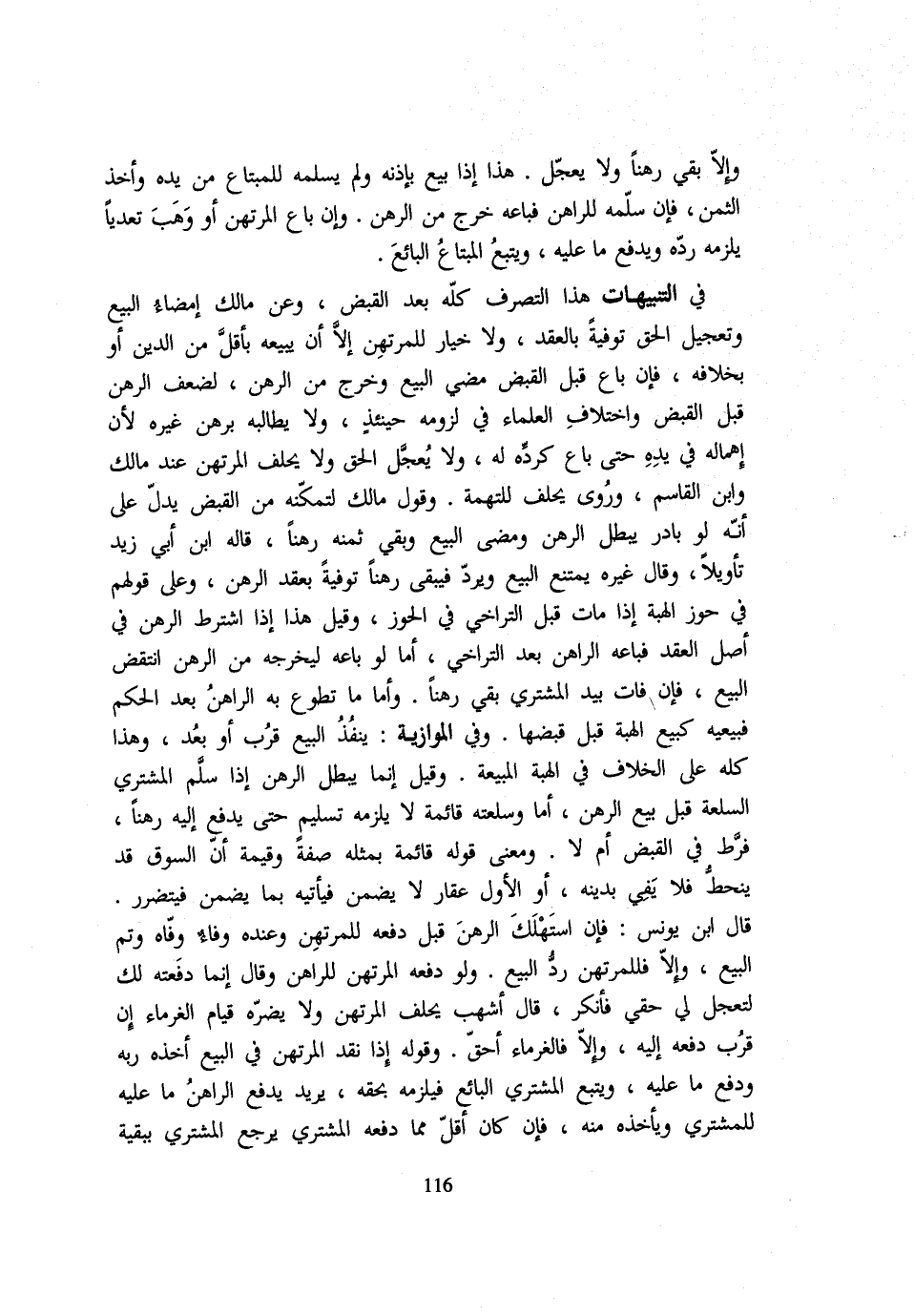 وَإِلَّا بَقِيَ رَهْنًا وَلَا يُعَجَّلُ هَذَا إِذَا بِيعَ بِإِذْنِهِ وَلَمْ يُسَلِّمْهُ لِلْمُبْتَاعِ مِنْ يَدِهِ وَأَخَذَ الثَّمَنَ فَإِنْ سَلَّمَهُ لِلرَّاهِنِ فَبَاعَهُ خَرَجَ مِنَ الرَّهْنِ وَإِنْ بَاعَ الْمُرْتَهِنُ أَوْ وَهَبَ تَعَدِّيًا يَلْزَمُهُ رَدُّهُ وَيَدْفَعُ مَا عَلَيْهِ وَيَتَّبِعُ الْمُبْتَاعُ الْبَائِعَ فِي التَّنْبِيهَاتِ: هَذَا التَّصَرُّفُ كُلُّهُ بَعْدَ الْقَبْضِ وَعَنْ مَالِكٍ إِمْضَاءُ الْبَيْعِ وَتَعْجِيلُ الْحَقِّ تَوْفِيَةً بِالْعَقْدِ وَلَا خِيَارَ لِلْمُرْتَهِنِ إِلَّا أَنْ يَبِيعَهُ بِأَقَلَّ مِنَ الدَّيْنِ أَوْ بِخِلَافِهِ فَإِنْ بَاعَ قَبْلَ الْقَبْضِ مَضَى الْبَيْعُ وَخَرَجَ مِنَ الرَّهْنِ لِضَعْفِ الرَّهْنِ قَبْلَ الْقَبْضِ وَاخْتِلَافِ الْعُلَمَاءِ فِي لُزُومِهِ حينئذٍ وَلَا يُطَالِبُهُ بِرَهْنِ غَيْرِهِ لِأَنَّ إِهْمَالَهُ فِي يَدِهِ حَتَّى بَاعَ كَرَدِّهِ لَهُ وَلَا يُعجَّل الْحَقُّ وَلَا يَحْلِفُ الْمُرْتَهِنُ عِنْدَ مَالِكٍ وَابْنِ الْقَاسِمِ وَرُوِيَ يَحْلِفُ للتُهمة وَقَوْلُ مَالِكٍ لِتَمَكُّنِهِ مِنَ الْقَبْضِ يَدُلُّ على أَنه لَو بَادر يَبْطُلِ الرَّهْنُ وَمَضَى الْبَيْعُ وَبَقِيَ ثَمَنُهُ رَهْنًا قَالَهُ ابْنُ أَبِي زَيْدٍ تَأْوِيلًا وَقَالَ غَيْرُهُ يَمْتَنِعُ الْبَيْعُ وَيُرَدُّ فَيَبْقَى رَهْنًا توفيةُ بِعَقْدِ الرَّهْن وعَلى قَوْلِهِمْ فِي حَوْزِ الْهِبَةِ إِذَا مَاتَ قَبْلَ التَّرَاخِي فِي الْحَوْزِ وَقِيلَ هَذَا إِذَا اشْتَرَطَ الرَّهْنَ فِي أَصْلِ الْعَقْدِ فَبَاعَهُ الرَّاهِنُ بَعْدَ التَّرَاخِي أَمَّا لَوْ بَاعَهُ لِيُخْرِجَهُ مِنَ الرَّهْنِ انْتَقَضَ الْبَيْعُ فَإِنْ فَاتَ بِيَدِ الْمُشْتَرِي بَقِيَ رَهْنًا وَأَمَّا مَا تَطَوَّعَ بِهِ الرَّاهِنُ بَعْدَ الْحُكْمِ فَبَيْعُهُ كَبَيْعِ الْهِبَةِ قَبْلَ قَبْضِهَا وَفِي الْمُوَازِيَةِ: ينفُذُ الْبَيْعُ قَرُبَ أَوْ بَعُدَ وَهَذَا كُلُّهُ عَلَى الْخِلَافِ فِي الْهِبَةِ الْمَبِيعَةِ وَقِيلَ إِنَّمَا يَبْطُلُ الرَّهْنُ إِذَا سلَّم الْمُشْتَرِي السِّلْعَةَ قَبْلَ بَيْعِ الرَّهْنِ أَمَّا وَسِلْعَتُهُ قَائِمَةٌ لَا يَلْزَمُهُ تَسْلِيمٌ حَتَّى يَدْفَعَ إِلَيْهِ رَهْنًا فرَّط فِي الْقَبْضِ أَمْ لَا وَمَعْنَى قَوْلِهِ قَائِمَةً بِمِثْلِهِ صِفَةً وَقِيمَةً أَنَّ السُّوقَ قَدْ ينحطُّ فَلَا يَفِي بِدَيْنِهِ أَوِ الْأَوَّلُ عَقَارٌ لَا يُضْمَنُ فيأتيه بِمَا يضمن فيضرر قَالَ ابْنُ يُونُسَ: فَإِنِ اسْتَهْلَكَ الرَّهْنَ قَبْلَ دَفْعِهِ لِلْمُرْتَهِنِ وَعِنْدَهُ وفاءٌ وَفَّاهُ وَتَمَّ الْبَيْعُ وَإِلَّا فَلِلْمُرْتَهِنِ ردُّ الْبَيْعِ وَلَوْ دَفَعَهُ الْمُرْتَهِنُ لِلرَّاهِنِ وَقَالَ إِنَّمَا دَفَعْتُهُ لَكَ لِتُعَجِّلَ لِي حَقِّي فَأَنْكَرَ قَالَ أَشْهَبُ يَحْلِفُ الْمُرْتَهِنُ وَلَا يَضُرُّهُ قِيَامُ الْغُرَمَاءِ إِنْ قَرُبَ دَفْعُهُ إِلَيْهِ وَإِلَّا فالغرماء أَحَق وَقَوله إِذا نقد الْمُرْتَهِنُ فِي الْبَيْعِ أَخَذَهُ رَبُّهُ وَدَفَعَ مَا عَلَيْهِ وَيُتْبِعُ الْمُشْتَرِي الْبَائِعَ فَيُلْزِمُهُ بِحَقِّهِ يُرِيدُ يَدْفَعُ الرَّاهِنُ مَا عَلَيْهِ لِلْمُشْتَرِي وَيَأْخُذُهُ مِنْهُ فَإِنْ كَانَ أَقَلَّ مِمَّا دَفَعَهُ الْمُشْتَرِي يَرْجِعُ المُشْتَرِي بِبَقِيَّة