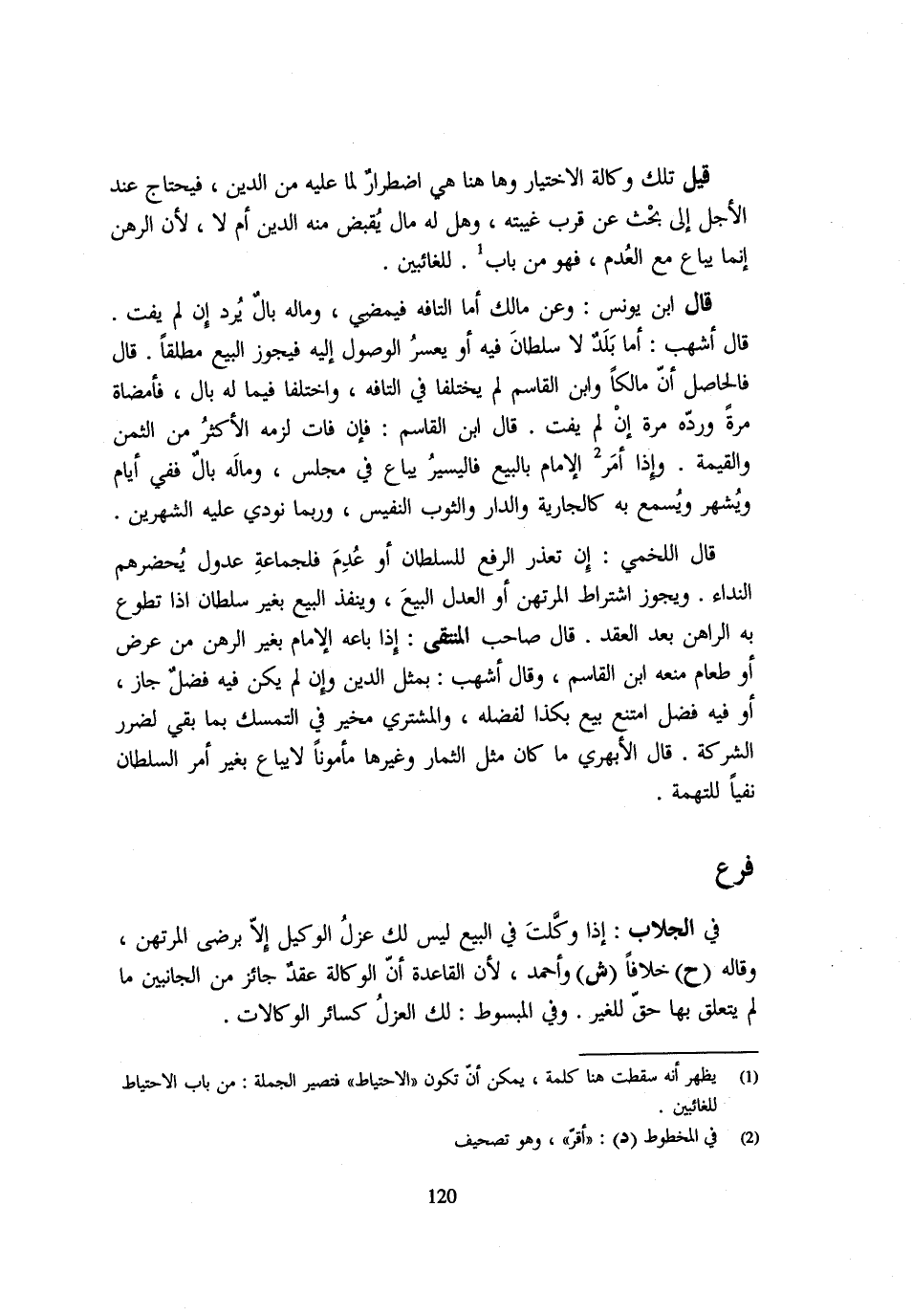 قيل تِلْكَ وكَالَة الِاخْتِيَار وَهَا هُنَا هِيَ اضطرارٌ لِمَا عَلَيْهِ مِنَ الدَّيْنِ فَيَحْتَاجُ عِنْدَ الْأَجَلِ إِلَى بَحْثٍ عَنْ قُرْبِ غَيْبَتِهِ وَهَلْ لَهُ مَالٌ يُقبض مِنْهُ الدَّيْنُ أَمْ لَا لِأَنَّ الرَّهْنَ إِنَّمَا يُبَاعُ مَعَ الْعَدَمِ فَهُوَ من بَاب للغائبين قَالَ ابْنُ يُونُسَ: وَعَنْ مَالِكٍ أَمَّا التَّافِهُ فيمضي وَمَاله بالٌ يُرد إِنْ لَمْ يَفُتْ قَالَ أَشْهَبُ: أَمَّا بَلَدٌ لَا سُلْطَانَ فِيهِ أَوْ يَعْسُرُ الْوُصُولُ إِلَيْهِ فَيَجُوزُ الْبَيْعُ مُطْلَقًا قَالَ فَالْحَاصِلُ أَنَّ مَالِكًا وَابْنَ الْقَاسِمِ لَمْ يَخْتَلِفَا فِي التَّافِهِ وَاخْتَلَفَا فِيمَا لَهُ بَالٌ فَأَمْضَاهُ مَرَّةً وَرَدَّهُ مَرَّةً إِنْ لَمْ يَفُتْ قَالَ ابْنُ الْقَاسِمِ فَإِنْ فَاتَ لَزِمَهُ الْأَكْثَرُ مِنَ الثَّمَنِ وَالْقيمَة وَإِذا أَمر الإِمَام بِالْبيعِ فاليسير بياع فِي الْمجْلس وَمَاله بَالٌ فَفِي أَيَّامٍ وَيُشْهَرُ وَيُسْمَعُ بِهِ كَالْجَارِيَةِ وَالدَّار وَالثَّوْب والنفيس وَرُبَّمَا نُودِيَ عَلَيْهِ الشَّهْرَيْنِ قَالَ اللَّخْمِيُّ إِنَّ تَعَذَّرَ الرَّفْعُ لِلسُّلْطَانِ أَوْ عُدِمَ فَلِجَمَاعَةٍ عُدُولٍ يَحْضُرُهُمُ النِّدَاءُ وَيَجُوزُ اشْتِرَاطُ الْمُرْتَهِنِ أَوِ الْعَدْلِ الْبَيْعَ وَيَنْفُذُ الْبَيْعُ بِغَيْرِ سُلْطَانٍ إِذَا تَطَوَّعَ بِهِ الرَّاهِنُ بَعْدَ الْعَقْدِ قَالَ صَاحِبُ الْمُنْتَقَى إِذَا بَاعَهُ الْإِمَامُ بِغَيْرِ الرَّهْنِ مِنْ عَرْضٍ أَوْ طَعَامٍ مَنَعَهُ ابْنُ الْقَاسِمِ وَقَالَ أَشْهَبُ: بِمِثْلِ الدَّيْنِ وَإِنْ لَمْ يَكُنْ فِيهِ فضلٌ جَازَ أَو فِيهِ فضل امْتنع بيع بِكَذَا لفضله وَالْمُشْتَرِي مُخَيَّرٌ فِي التَّمَسُّكِ بِمَا بَقِيَ لِضَرَرِ الشَّرِكَةِ قَالَ الْأَبْهَرِيُّ مَا كَانَ مِثْلَ الثِّمَارِ وَغَيْرِهَا مَأْمُونًا لَا يُبَاعُ بِغَيْرِ أَمْرِ السُّلْطَانِ نَفْيًا لِلتُّهْمَةِ
