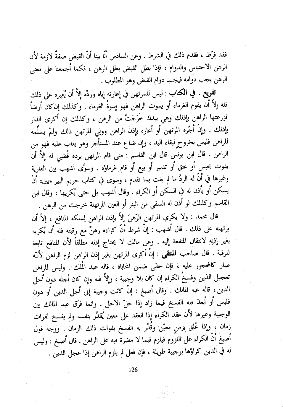 فَقَدْ فَرَّطَ فَقَدَّمَ ذَلِكَ فِي الشَّرْطِ وَعَنِ السَّادِسِ أَنَّا بَيَّنَّا أَنَّ الْقَبْضَ صِفَةٌ لَازِمَةٌ لِأَنَّ الرَّهْنَ الِاحْتِبَاسُ وَالدَّوَامُ فَإِذَا بَطَلَ الْقَبْضُ بَطَلَ الرَّهْنُ فَكَمَا أَجْمَعْنَا عَلَى مَعْنَى الرَّهْنِ يَجِبُ دَوَامُهُ فَيَجِبُ دَوَامُ الْقَبْضِ وَهُوَ الْمَطْلُوبُ تَفْرِيغ فِي الْكِتَابِ: لَيْسَ لِلْمُرْتَهِنِ فِي إِعَارَتِهِ إِيَّاهُ وَرَدِّهِ إِلَّا أَنْ يُعِيرَهُ عَلَى ذَلِكَ فَلَهُ إِلَّا أَنْ يَقُومَ الْغُرَمَاءُ أَوْ يَمُوتَ الرَّاهِنُ فَهُوَ أُسْوَةُ الْغُرَمَاءِ وَكَذَلِكَ إِنْ كَانَ أَرْضًا فزرعتها الرَّاهِنُ بِإِذْنِكَ وَهِيَ بِيَدِكَ خَرَجَتْ مِنَ الرَّهْنِ وَكَذَلِكَ إِنْ أَكْرَى الدَّارِ بِإِذْنِكَ وَإِنَّ أَجَّرَهُ الْمُرْتَهِنُ أَوْ أَعَارَهُ بِإِذْنِ الرَّاهِنِ وَوَلِيَ الْمُرْتَهِنُ ذَلِكَ وَلَمْ يُسَلِّمْهُ لِلرَّاهِنِ فَلَيْسَ بِخُرُوجٍ لِبَقَاءِ الْيَدِ وَإِنْ ضَاعَ عِنْدَ الْمُسْتَأْجِرِ وَهُوَ يُغَابُ عَلَيْهِ فَهُوَ مِنَ الرَّاهِنِ قَالَ ابْنُ يُونُسَ قَالَ ابْنُ الْقَاسِمِ: مَتَى قَامَ الْمُرْتَهِنُ بِرَدِّهِ قُضِيَ لَهُ إِلَّا أَنْ يَفُوتَ بِحَبْسٍ أَوْ عِتْقٍ أَوْ تَدْبِيرٍ أَوْ بَيْعٍ أَوْ قَامَ غرماؤه وسى أَشْهَبُ بَيْنَ الْعَارِيَةِ وَغَيْرِهَا فِي أَنَّ لَهُ الرَّدَّ مَا لَمْ يَفُتْ بِمَا تَقَدَّمَ وَسَوَّى فِي كتاب حَرِيم البير " بَيْنَ " أَنْ يَسْكُنَ أَوْ يَأْذَنَ لَهُ فِي السَّكَنِ أَوِ الْكِرَاءِ وَقَالَ أَشْهَبُ بَلْ حَتَّى يَكْرِيَهَا وَقَالَ ابْنُ الْقَاسِمِ وَكَذَلِكَ لَوْ أَذِنَ لَهُ السَّقْيَ مِنَ الْبِئْرِ أَوِ الْعَيْنِ الْمُرْتَهِنَةِ خَرَجَتْ مِنَ الرَّهْنِ قَالَ مُحَمَّدٌ: وَلَا يَكْرِي الْمُرْتَهِنُ الرَّهْنَ إِلَّا بِإِذْنِ الرَّاهِنِ لِمِلْكِهِ الْمَنَافِعَ إِلَّا أَنْ يَرْتَهِنَهُ عَلَى ذَلِكَ قَالَ أَشْهَبُ: إِنْ شَرَطَ أَنَّ كِرَاءَهُ رَهْنٌ مَعَ رَقَبَتِهِ فَلَهُ أَنْ يَكْرِيَهُ بِغَيْرِ إِذْنِهِ لِانْتِقَالِ الْمَنْفَعَةِ إِلَيْهِ وَعَنْ مَالِكٍ لَا يَحْتَاجُ إِذْنَهُ مُطْلَقًا لِأَنَّ الْمَنَافِعَ تَابِعَةٌ لِلرَّقَبَةِ قَالَ صَاحِبُ الْمُنْتَقَى: إِنْ أَكْرَى الْمُرْتَهِنُ بِغَيْرِ إِذْنِ الرَّاهِنِ لَزِمَ الرَّاهِنُ لِأَنَّهُ صَارَ كَالْمَحْجُورِ عَلَيْهِ فَإِنْ حَابَى ضَمِنَ الْمُحَابَاةَ قَالَهُ عَبْدُ الْمَلِكِ وَلَيْسَ لِلرَّاهِنِ تَعْجِيلُ الدَّيْنِ وَفَسْخِ الْكِرَاءِ إِنْ كَانَ بِلَا وَجِيبَةٍ وَإِلَّا فَلَهُ وَإِنْ كَانَ أَجَّلَهُ دُونَ أَجَلِ الدّين قَالَه عبد الْمَالِك وَقَالَ أَصْبَغُ: إِنْ كَانَتْ وَجِيبَةٌ إِلَى أَجَلِ الدّين أَو دون فَلَيْسَ أَو أبعد فَلَهُ الْفَسْخُ فِيمَا زَادَ إِذَا حَلَّ الْأَجَلُ وَإِنَّمَا فرق عبد الْمَالِك بَيْنَ الْوَجِيبَةِ وَغَيْرِهَا لِأَنَّ عَقْدَ الْكِرَاءِ إِذَا انْعَقَد على مُعَيَّنٍ يُقَدَّرُ بِنَفْسِهِ وَلَمْ يُفْسَخْ لِفَوَاتِ زَمَانٍ وَإِذَا عُلِّقَ بِزَمَنٍ مُعَيَّنٍ وَقُدِّرَ بِهِ انْفَسَخَ بِفَوَاتِ ذَلِكَ الزَّمَانِ وَوَجْهُ قَوْلِ أَصْبَغَ أَنَّ الْكِرَاء على اللُّزُوم فَيلْزم فميا لَا مَضَرَّةَ فِيهِ عَلَى الرَّاهِنِ. قَالَ أَصْبَغُ: وَلَيْسَ لَهُ فِي الدَّيْنِ كِرَاؤُهَا بِوَجِيبَةٍ طَوِيلَةٍ فَإِنْ فَعَلَ لَمْ يَلْزَمِ الرَّاهِنُ إِذَا عُجِّلَ الدّين