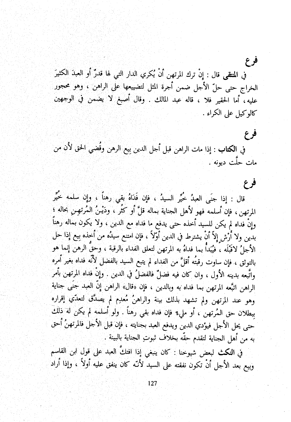 فِي الْمُنْتَقَى قَالَ: إِنْ تَرَكَ الْمُرْتَهِنُ أَنْ يُكْرِيَ الدَّارَ الَّتِي لَهَا قَدْرٌ أَوِ الْعَبْدَ الْكَثِيرَ الْخَرَاجِ حَتَّى حَلَّ الْأَجَلُ ضَمِنَ أُجْرَةَ الْمِثْلِ لِتَضْيِيعِهَا عَلَى الرَّاهِنِ وَهُوَ مَحْجُورٌ عَلَيْهِ أما الحقير فَلَا قَالَه عبد الْمَالِك وَقَالَ أَصْبَغُ لَا يَضْمَنُ فِي الْوَجْهَيْنِ كَالْوَكِيلِ عَلَى الْكِرَاءِ