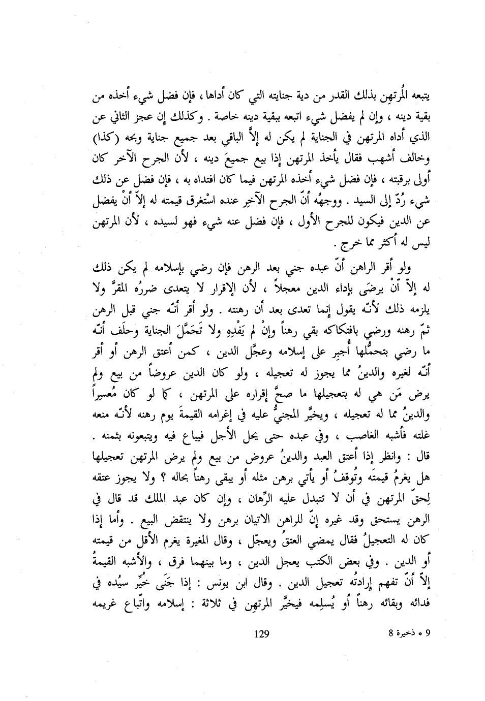 يَتْبَعْهُ الْمُرْتَهِنُ بِذَلِكَ الْقَدْرِ مِنْ دِيَةِ جِنَايَتِهِ الَّتِي كَانَ أَدَّاهَا فَإِنَ فَضَلَ شَيْءٌ أَخَذَهُ مِنْ بَقِيَّةِ دَيْنِهِ وَإِنْ لَمْ يَفْضُلْ شَيْءٌ أَتْبَعَهُ بِبَقِيَّةِ دَيْنِهِ خَاصَّةً وَكَذَلِكَ إِنْ عَجَزَ الثَّانِي عَنِ الَّذِي أَدَّاهُ الْمُرْتَهِنُ فِي الْجِنَايَةِ لَمْ يَكُنْ لَهُ إِلَّا الْبَاقِي بَعْدَ جَمِيعِ جِنَايَة وبحه (كَذَا) وَخَالَفَ أَشْهَبُ فَقَالَ يَأْخُذُ الْمُرْتَهِنُ إِذَا بِيعَ جَمِيعُ دَيْنِهِ لِأَنَّ الْجُرْحَ الْآخَرَ كَانَ أَوْلَى بِرَقَبَتِهِ فَإِنْ فَضَلَ شَيْءٌ أَخَذَهُ الْمُرْتَهِنُ فِيمَا كَانَ افْتَدَاهُ بِهِ فَإِنْ فَضَلَ عَنْ ذَلِكَ شَيْءٌ رُدّ إِلَى السَّيِّدِ وَوَجْهُهُ أَنَّ الْجُرْحَ الْآخَرَ عِنْدَهُ اسْتَغْرَقَ قِيمَتَهُ لَهُ إِلَّا أَنْ يَفْضُلَ عَنِ الدَّيْنِ فَيَكُونَ لِلْجُرْحِ الْأَوَّلِ فَإِنْ فَضَلَ عَنْهُ شَيْءٌ فَهُوَ لِسَيِّدِهِ لِأَنَّ الْمُرْتَهِنَ لَيْسَ لَهُ أَكْثَرُ مِمَّا خَرَجَ وَلَوْ أَقَرَّ الرَّاهِنُ أَنَّ عَبْدَهُ جَنَى بَعْدَ الرَّهْنِ فَإِنْ رَضِيَ بِإِسْلَامِهِ لَمْ يَكُنْ ذَلِكَ لَهُ إِلَّا أَنْ يَرْضَى بِأَدَاءِ الدَّيْنِ مُعَجَّلًا لِأَنَّ الْإِقْرَارَ لَا يَتَعَدَّى ضَرَرُهُ المقرَّ وَلَا يَلْزَمُهُ ذَلِكَ لِأَنَّهُ يَقُولُ إِنَّمَا تَعَدَّى بَعْدَ أَنْ رَهَنْتُهُ وَلَوْ أَقَرَّ أَنَّهُ جَنَى قَبْلَ الرَّهْنِ ثُمَّ رَهَنَهُ وَرَضِيَ بِافْتِكَاكِهِ بَقِيَ رَهْنًا وَإِنْ لَمْ يُفِدْهُ وَلَا تحمَّل الْجِنَايَةَ وَحَلَفَ أَنَّهُ مَا رَضِيَ بِتَحَمُّلِهَا أُجبر عَلَى إِسْلَامِهِ وَعُجِّلَ الدَّيْنُ كَمَنْ أَعْتَقَ الرَّهْنَ أَوْ أَقَرَّ أَنَّهُ لِغَيْرِهِ وَالدَّيْنُ مِمَّا يَجُوزُ لَهُ تَعْجِيلُهُ وَلَوْ كَانَ الدَّيْنُ عُرُوضًا مِنْ بَيْعٍ وَلَمْ يَرْضَ مَنْ هِيَ لَهُ بتعجيلها مَا صَحَّ إِقْرَاره عَلَى الْمُرْتَهِنِ كَمَا لَوْ كَانَ مُعْسِرًا وَالدَّيْنُ مِمَّا لَهُ تَعْجِيلُهُ وَيُخَيَّرُ الْمَجْنِيُّ عَلَيْهِ فِي إِغْرَامِهِ الْقِيمَةَ يَوْمَ رَهْنِهِ لِأَنَّهُ مَنَعَهُ غَلَّتَهُ فأشهب الْغَاصِبَ وَفِي عَبْدِهِ حَتَّى يَحِلَّ الْأَجَلُ فَيُبَاعَ فِيهِ ويتبعونه بِثمنِهِ قَالَ وَانْظُر إِذا اعْتِقْ الْعَبْدُ وَالدَّيْنُ عُرُوضٌ مِنْ بَيْعٍ وَلَمْ يَرْضَ الْمُرْتَهِنُ تَعْجِيلَهَا هَلْ يُغَرَّمُ قِيمَتَهُ وَتُوقَفُ أَوْ يَأْتِي بِرَهْنٍ مِثْلِهِ أَوْ يَبْقَى رَهْنًا بِحَالِهِ؟ وَلَا يَجُوزُ عِتْقُهُ لِحَقِّ الْمُرْتَهِنِ فِي أَنْ لَا تَتَبَدَّلَ عَلَيْهِ الرِّهَانُ وَإِنْ كَانَ عَبْدُ الْملك قد قَالَ فِي الرَّهْن يسْتَحق وَقد غَيْرُهُ إِنَّ لِلرَّاهِنِ الْإِتْيَانَ بِرَهْنٍ وَلَا يُنْتَقَضُ الْبَيْعُ وَأَمَّا إِذَا كَانَ لَهُ التَّعْجِيلُ فَقَالَ يَمْضِي الْعِتْقُ وَيُعَجَّلُ وَقَالَ الْمُغِيرَةُ يُغَرَّمُ الْأَقَلَّ مِنْ قِيمَتِهِ أَوِ الدَّيْنَ وَفِي بَعْضِ الْكُتُبِ يُعَجَّلُ الدَّيْنُ وَمَا بَيْنَهُمَا فَرْقٌ وَالْأَشْبَهُ الْقِيمَةُ إِلَّا أَنْ تُفْهِمَ إِرَادَتُهُ تَعْجِيلَ الدَّيْنِ وَقَالَ ابْنُ يُونُسَ: إِذَا جَنَى خُيِّرَ سَيِّدُهُ فِي فِدَائِهِ وَبَقَائِهِ رَهْنًا أَوْ يُسَلِّمُهُ فَيُخَيَّرُ الْمُرْتَهِنُ فِي ثَلَاثَة: إِسْلَامه وَاتِّبَاع غَرِيمه