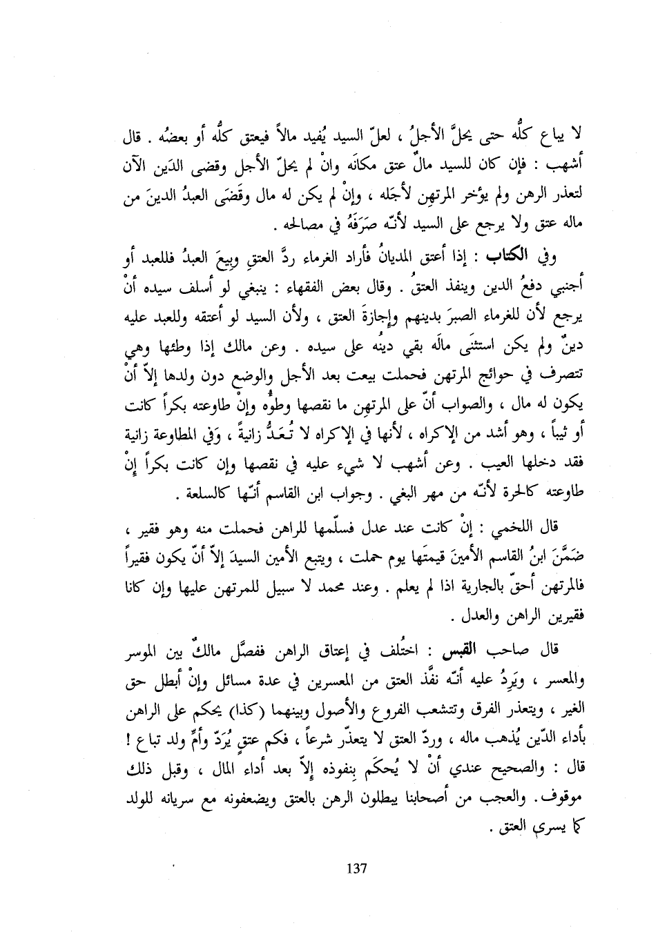 لَا يُبَاعُ كُلُّهُ حَتَّى يَحِلَّ الْأَجَلُ لَعَلَّ السَّيِّدَ يُفِيدُ مَالًا فَيُعْتَقُ كُلُّهُ أَوْ بَعْضُهُ قَالَ أَشْهَبُ: فَإِنْ كَانَ لِلسَّيِّدِ مَالٌ عَتَقَ مَكَانَهُ وَإِن لم يحل الْأَجَل وَقضى الدي الْآن لتعذر الرَّهْن وَلم يُؤَخر الْمُرْتَهن لِأَجْلِهِ وَإِنْ لَمْ يَكُنْ لَهُ مَالٌ وَقَضَى الْعَبْدُ الدَّيْنَ مِنْ مَالِهِ عَتَقَ وَلَا يَرْجِعُ عَلَى السَّيِّدِ لِأَنَّهُ صَرَفَهُ فِي مَصَالِحِهِ وَفِي الْكِتَابِ: إِذَا أَعْتَقَ الْمِدْيَانُ فَأَرَادَ الْغُرَمَاءُ رَدَّ الْعتْق وَبيع العَبْد فللعبد أَوْ أَجْنَبِيٍّ دَفْعُ الدَّيْنِ وَيَنْفُذُ الْعِتْقُ وَقَالَ بَعْضُ الْفُقَهَاءِ: يَنْبَغِي لَوْ أَسْلَفَ سَيِّدُهُ أَنْ يَرْجِعَ لِأَنَّ لِلْغُرَمَاءِ الصَّبْرَ بِدَيْنِهِمْ وَإِجَازَةَ الْعِتْقِ وَلِأَنَّ السَّيِّدَ لَوْ أَعْتَقَهُ وَلِلْعَبْدِ عَلَيْهِ دَيْنٌ وَلَمْ يَكُنِ اسْتَثْنَى مَالَهُ بَقِيَ دَيْنُهُ عَلَى سَيِّدِهِ وَعَنْ مَالِكٍ إِذَا وَطِئَهَا وَهِيَ تَتَصَرَّفُ فِي حَوَائِجِ الْمُرْتَهِنِ فَحَمَلَتْ بِيعَتْ بَعْدَ الْأَجَلِ وَالْوَضْعِ دُونَ وَلَدِهَا إِلَّا أَنْ يَكُونَ لَهُ مَالٌ وَالصَّوَابُ أَنَّ عَلَى الْمُرْتَهِنِ مَا نَقَصَهَا وطوه وَإِنْ طَاوَعَتْهُ بِكْرًا كَانَتْ أَوْ ثَيِّبًا وَهُوَ أَشَدُّ مِنَ الْإِكْرَاهِ لِأَنَّهَا فِي الْإِكْرَاهِ لَا تُعَدُّ زَانِيَةً وَفِي الْمُطَاوَعَةِ زَانِيَةً فَقَدْ دَخَلَهَا الْعَيْبُ وَعَنْ أَشْهَبَ لَا شَيْءَ عَلَيْهِ فِي نَقْصِهَا وَإِنْ كَانَتْ بِكْرًا إِنْ طَاوَعَتْهُ كَالْحُرَّةِ لِأَنَّهُ مِنْ مَهْرِ الْبَغِيِّ وَجَوَابُ ابْنُ الْقَاسِمِ أَنَّهَا كَالسِّلْعَةِ قَالَ اللَّخْمِيُّ: إِنْ كَانَتْ عِنْدَ عَدْلٍ فَسَلَّمَهَا لِلرَّاهِنِ فَحَمَلَتْ مِنْهُ وَهُوَ فَقِيرٌ ضَمَّنَ ابْنُ الْقَاسِمِ الْأَمِينَ قِيمَتَهَا يَوْمَ حَمَلَتْ وَيَتْبَعُ الْأَمِينُ السَّيِّدَ إِلَّا أَنْ يَكُونَ فَقِيرًا فالمرتهن أَحَق بالجارية إِذْ لَمْ يَعْلَمْ وَعِنْدَ مُحَمَّدٍ لَا سَبِيلَ لِلْمُرْتَهِنِ عَلَيْهَا وَإِنْ كَانَا فَقِيرَيْنِ الرَّاهِنُ وَالْعَدْلُ قَالَ صَاحِبُ الْقَبَسِ: اخْتُلِفَ فِي إِعْتَاقِ الرَّاهِنِ فَفَصَلَ مَالِكٌ بَيْنَ الْمُوسِرِ وَالْمُعْسِرِ وَيَرُدُّ عَلَيْهِ أَنَّهُ نَفَّذَ الْعِتْقَ مِنَ الْمُعْسِرِينَ فِي عِدَّةِ مَسَائِلَ وَإِنْ أَبْطَلَ حَقَّ الْغَيْرِ وَيَتَعَذَّرُ الْفَرْقُ وَتَتَشَعَّبُ الْفُرُوع وَالْأُصُول وَبَينهمَا (كَذَا) يُحْكَمُ عَلَى الرَّاهِنِ بِأَدَاءِ الدَّيْنِ يُذْهِبُ مَالَهُ وَرَدُّ الْعِتْقِ لَا يَتَعَذَّرُ شَرْعًا فَكَمْ عِتْقٍ يُرَدُّ وَأُمُّ وَلَدٍ تُبَاعُ! قَالَ: وَالصَّحِيحُ عِنْدِي أَن لَا يُحْكَمَ بِنُفُوذِهِ إِلَّا بَعْدَ أَدَاءِ الْمَالِ وَقَبْلَ ذَلِكَ مَوْقُوفٌ وَالْعَجَبُ مِنْ أَصْحَابِنَا يُبْطِلُونَ الرَّهْنَ بِالْعِتْقِ ويضعفونه مَعَ سريانه للْوَلَد كَمَا يسري الْعتْق