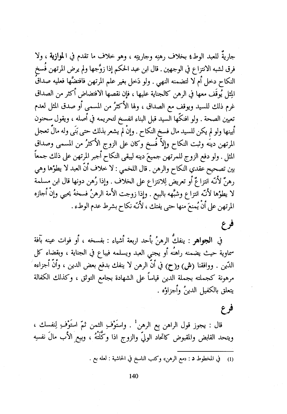جَارِيَةٌ لِلْعَبْدِ الْوَطْءُ بِخِلَافِ رَهْنِهِ وَجَارِيَتِهِ وَهُوَ خِلَافُ مَا تَقَدَّمَ فِي الْمُوَازِيَةِ وَلَا فَرْقَ لِشِبْهِ الِانْتِزَاعِ فِي الْوَجْهَيْنِ قَالَ ابْنُ عَبْدِ الحكم إِذْ زَوَّجَهَا وَلَمْ يَرْضَ الْمُرْتَهِنُ فُسِخَ النِّكَاحُ دَخَلَ أَمْ لَا لِتَضَمُّنِهِ النَّهْيَ وَلَوْ دَخَلَ بِغَيْرِ علم الْمُرْتَهن فاقتضها فَعَلَيْهِ صَدَاقُ الْمِثْلِ يُوقَفُ مَعَهَا فِي الرَّهْنِ كَالْجِنَايَةِ عَلَيْهَا فَإِنْ نَقَصَهَا الِافْتِضَاضُ أَكْثَرَ مِنَ الصَّدَاقِ غُرِّمَ ذَلِكَ لِلسَّيِّدِ وَيُوقَفُ مَعَ الصَّدَاقِ وَلها الْأَكْثَر من الْمُسَمّى أَو صدق الْمثل لعدم تعْيين الصِّحَّة وَلَو افنكها السَّيِّدُ قَبْلَ الْبِنَاءِ انْفَسَخَ لِتَحْرِيمِهِ فِي أَصْلِهِ وَيَقُولُ سَحْنُونٌ أُبِينُهَا وَلَوْ لَمْ يَكُنْ لِلسَّيِّدِ مَالٌ فُسِخَ النِّكَاحُ وَإِنْ لَمْ يَشْعُرْ بِذَلِكَ حَتَّى بَنَى وَلَهُ مَالٌ تَعَجَّلَ الْمُرْتَهِنُ دَيْنَهُ وَثَبَتَ النِّكَاحُ وَإِلَّا فَسَخَ وَكَانَ عَلَى الزَّوْجِ الْأَكْثَر مِنَ الْمُسَمَّى وَصَدَاقُ الْمِثْلِ وَلَوْ دَفَعَ الزَّوْجُ لِلْمُرْتَهِنِ جَمِيعَ دَيْنِهِ لِيَبْقَى النِّكَاحُ أُجْبِرَ الْمُرْتَهِنُ عَلَى ذَلِكَ جَمْعًا بَيْنَ تَصْحِيحِ عَقْدَيِ النِّكَاحِ وَالرَّهْنِ قَالَ اللَّخْمِيُّ: لَا خِلَافَ أَنَّ الْعَبْدَ لَا يَطَؤُهَا وَهِيَ رَهْنٌ لِأَنَّهُ انْتِزَاعٌ أَوْ تَعْرِيضٌ لِلِانْتِزَاعِ عَلَى الْخِلَافِ وَإِذَا رُهِنَ دُونَهَا قَالَ ابْنُ مَسْلَمَةَ لَا يَطَؤُهَا لِأَنَّهُ انْتِزَاعٌ وَشَبَّهَهُ بِالْبَيْعِ وَإِذَا زُوِّجَتِ الْأَمَةُ الرَّهْنُ فَسَخَهُ يَحْيَى وَإِنْ أَجَازَهُ الْمُرْتَهِنُ عَلَى أَنْ يُمْنَعَ مِنْهَا حَتَّى يَفْتَك لِأَنَّهُ نِكَاحٌ بِشَرْطِ عَدَمِ الْوَطْءِ