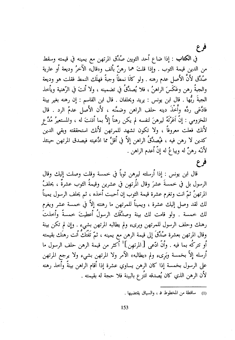 فِي الْكِتَابِ: إِذَا ضَاعَ أَحَدُ الثَّوْبَيْنِ صدق الْمُرْتَهن مَعَ يمنيه فِي قِيمَتِهِ وَسَقَطَ مِنَ الدَّيْنِ قِيمَةُ الثَّوْبِ وَإِذا قلت هما رهن بِأَلف و " قَالَ " الْآخَرُ وَدِيعَةٌ أَوْ عَارِيَةٌ صُدِّقَ لِأَنَّ الْأَصْلَ عَدَمُ رَهْنِهِ وَلَوْ كَانَا نَمَطًا وَجُبَّةً فَهَلَكَ النَّمَطُ فَقُلْتَ هُوَ وَدِيعَةٌ وَالْجُبَّةُ رَهْنٌ وَعَكَسَ الرَّاهِنُ فَلَا يُصَدَّقُ فِي تَضْمِينِهِ وَلَا أَنْتَ فِي الرَّهِينَةِ وَيَأْخُذُ الْجُبَّةَ رَبُّهَا قَالَ ابْنُ يُونُس: يُرِيد ويحلفان قَالَ ابْن يُونُس: إِنْ رَهَنَهُ بِغَيْرِ بَيِّنَةٍ فَادَّعَى رَدَّهُ وَأَخَذَ دَيْنَهُ حَلَفَ الرَّاهِنُ وَضَمِنَهُ لِأَنَّ الْأَصْلَ عَدَمُ الرَّد قَالَ المَخْزُومِي: إِن أعرته ليرهن نَفسه لَمْ يَكُنْ رَهْنًا إِلَّا بِمَا أَذِنْتَ لَهُ وَالْمُسْتَعِيرُ مُدَّعٍ لِأَنَّكَ فَعَلْتَ مَعْرُوفًا وَلَا تَكُونُ تشهد للْمُرْتَهن لِأَن اسْتَحْقَقْتَهُ وَبَقِيَ الدَّيْنُ كَدَيْنٍ لَا رَهْنَ فِيهِ فَيُصَدَّقُ الرَّاهِنُ إِلَّا فِي أَقَلَّ مِمَّا ادَّعَيْتَهُ فَيصدق الْمُرْتَهن حِينَئِذٍ لِأَنَّهُ رهن لَهُ وَيُبَاعُ لَهُ إِنْ أُعْدِمَ الرَّاهِنُ