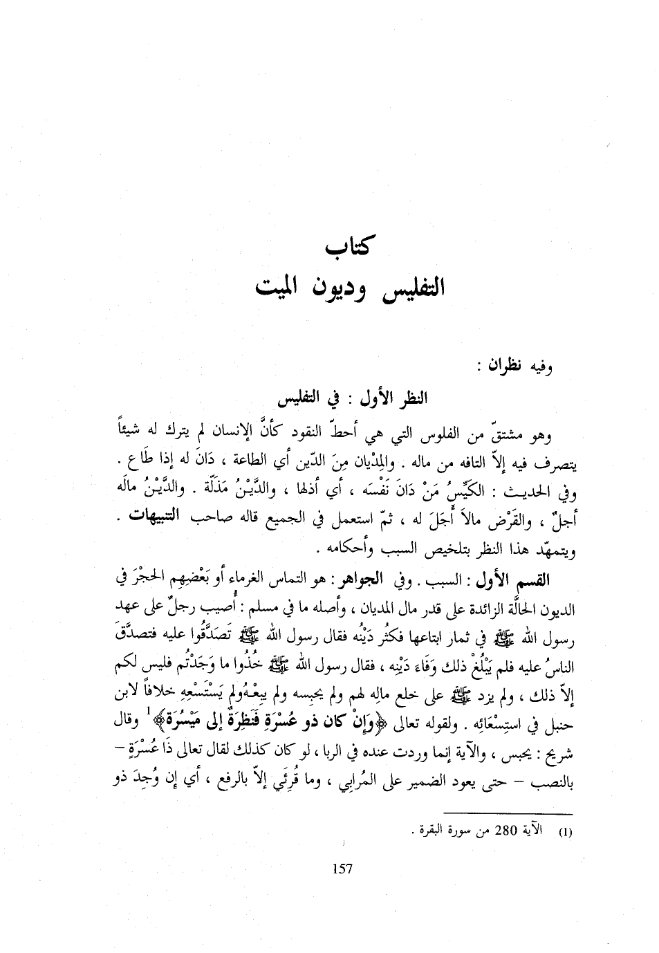 وَفِيهِ نَظَرَانِ: النَّظَرُ الْأَوَّلُ: فِي التَّفْلِيسِ وَهُوَ مُشْتَقٌّ مِنَ الْفُلُوسِ الَّتِي هِيَ أَحَطُّ النُّقُودِ كَأَنَّ الْإِنْسَانَ لَمْ يَتْرُكْ لَهُ شَيْئًا يَتَصَرَّفُ فِيهِ إِلَّا التَّافِهَ مِنْ مَالِهِ والمِديان مِنَ الدَّيْنِ أَيِ الطَّاعَةُ دَانَ لَهُ إِذَا طَاعَ وَفِي الْحَدِيثِ: الكَيّس مَنْ دانَ نَفْسَهُ أَيْ أَذَلَّهَا والدَّين مَذَلَّةٌ والدَّين مَاله أجل وَالْقَرْض مَالا أَجَلَ لَهُ ثُمَّ اسْتُعْمِلَ فِي الْجَمِيعِ قَالَهُ صَاحب التَّنْبِيهَات ويتمهد هَذَا النّظر بتلخيص السَّبَبِ وَأَحْكَامِهِ الْقِسْمُ الْأَوَّلُ: السَّبَبُ وَفِي الْجَوَاهِرِ هُوَ الْتِمَاسُ الْغُرَمَاءِ أَوْ بَعْضِهِمُ الْحَجْرَ فِي الدُّيُونِ الْحَالَّةِ الزَّائِدَةِ عَلَى قَدْرِ مَالِ الْمِدْيَانِ وَأَصْلُهُ مَا فِي مُسْلِمٍ: أُصيب رجلٌ عَلَى عَهْدِ رَسُولِ اللَّهِ - صَلَّى اللَّهُ عَلَيْهِ وَسَلَّم َ - فِي ثِمَارٍ ابْتَاعَهَا فكثُر دينُه فَقَالَ رَسُولُ اللَّهِ - صَلَّى اللَّهُ عَلَيْهِ وَسَلَّم َ - تصدَّقوا عَلَيْهِ فتصدَّق النَّاسُ عَلَيْهِ فَلَمْ يَبْلُغْ ذَلِكَ وَفَاءَ دَينه فَقَالَ رَسُولُ اللَّهِ - صَلَّى اللَّهُ عَلَيْهِ وَسَلَّم َ - خُذوا مَا وَجدتُم فَلَيْسَ لَكُمْ إِلَّا ذَلِكَ وَلم يزدْ - صَلَّى اللَّهُ عَلَيْهِ وَسَلَّم َ - عَلَى خَلْعِ مَالِهِ لَهُمْ وَلَمْ يحبِسه وَلَمْ يَبِعْهُ وَلَمْ يَسْتَسْعِهِ خِلَافًا لِابْنِ حَنْبَلٍ فِي اسْتِسْعَائِهِ وَلِقَوْلِهِ تَعَالَى {وَإِنْ كَانَ ذُو عُسْرَةٍ فنظرة إِلَى ميسرَة} وَقَالَ شُرَيْحٌ: يُحْبَسُ وَالْآيَةُ إِنَّمَا وَرَدَتْ عِنْدَهُ فِي الرِّبَا لَو كَانَ كَذَلِكَ لَقَالَ تَعَالَى ذَا عُسرةٍ - بِالنَّصْبِ - حَتَّى يعود الضَّمِير على المُرابي وَمَا قُرئي إِلَّا بِالرَّفْع أَي إِن وُجد ذُو