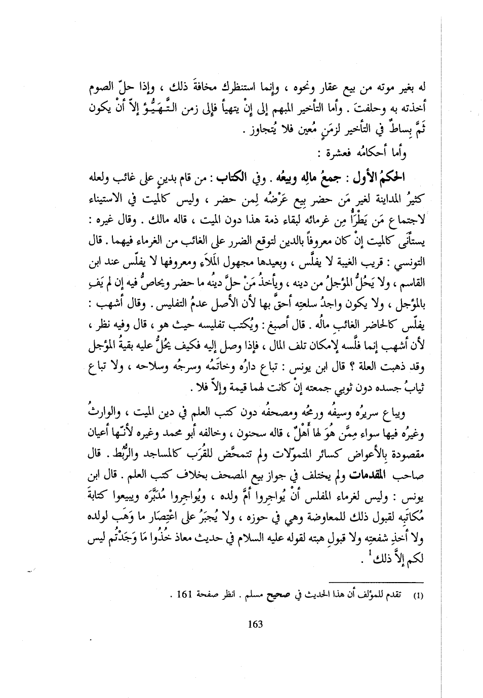 لَهُ بِغَيْرِ مَوْتِهِ مِنْ بَيْعِ عَقَارٍ وَنَحْوِهِ وَإِنَّمَا اسْتَنْظَرَكَ مَخَافَةَ ذَلِكَ وَإِذَا حَلَّ الصَّوْمُ أَخَذْتَهُ بِهِ وَحَلَفْتَ وَأَمَّا التَّأْخِيرُ الْمُبْهَمُ إِلَى أَنْ يَتَهَيَّأَ فَإِلَى زَمَنِ التَّهَيُّؤِ إِلَّا أَنْ يَكُونَ ثَمَّ بِسَاطٌ فِي التَّأْخِيرِ لِزَمَنِ مُعَيَّنٍ فَلَا يتَجَاوَز وَأَمَّا أَحْكَامُهُ فَعَشَرَةٌ: الْحُكْمُ الْأَوَّلُ: جَمْعُ مَالِهِ وَبَيْعُهُ وَفِي الْكِتَابِ مَنْ قَامَ بِدَيْنٍ عَلَى غَائِبٍ وَلَعَلَّهُ كَثِيرُ الْمُدَايَنَةِ لِغَيْرِ مَنْ حَضَرَ بِيعَ عَرْضُهُ لِمَنْ حَضَرَ وَلَيْسَ كَالْمَيِّتِ فِي الِاسْتِينَاءِ لِاجْتِمَاعِ مَنْ يَطْرَأُ مِنْ غُرَمَائِهِ لِبَقَاءِ ذِمَّةِ هَذَا دُونَ الْمَيِّتِ قَالَهُ مَالِكٌ وَقَالَ غَيْرُهُ يَسْتَأْنِي كَالْمَيِّتِ إِنْ كَانَ مَعْرُوفًا بِالدَّيْنِ لِتَوَقُّعِ الضَّرَرِ عَلَى الْغَائِبِ مِنَ الْغُرَمَاءِ فِيهِمَا قَالَ التُّونُسِيُّ قَرِيبُ الْغَيْبَةِ لَا يُفَلَّسُ وَبِعِيدُهَا مَجْهُولُ الْمَلَاءِ وَمَعْرُوفُهَا لَا يُفَلَّسُ عِنْدَ ابْنِ الْقَاسِمِ وَلَا يَحِلُّ الْمُؤَجَّلُ مِنْ دَيْنِهِ وَيَأْخُذُ مَنْ حَلَّ دَيْنُهُ مَا حَضَرَ وَيُحَاصُّ فِيهِ إِنْ لَمْ يَفِ بِالْمُؤَجَّلِ وَلَا يَكُونُ وَاجِدُ سِلْعَتِهِ أَحَقَّ بِهَا لِأَنَّ الْأَصْلَ عَدَمُ التَّفْلِيسِ وَقَالَ أَشْهَبُ يُفَلَّسُ كَالْحَاضِرِ الْغَائِبِ مَالُهُ قَالَ أَصْبَغُ وَيُكْتَبُ تَفْلِيسُهُ حَيْثُ هُوَ قَالَ وَفِيهِ نَظَرٌ لِأَنَّ أَشْهَبَ إِنَّمَا فَلَّسَهُ لِإِمْكَانِ تَلَفِ الْمَالِ فَإِذَا وَصَلَ إِلَيْهِ فَكَيْفَ يَحِلُّ عَلَيْهِ بَقِيَّةُ الْمُؤَجَّلِ وَقَدْ ذَهَبَتِ الْعِلَّةُ؟ قَالَ ابْنُ يُونُس: تبَاع دَاره وخاتمه وَسَرْجُهُ وَسِلَاحُهُ وَلَا تُبَاعُ ثِيَابُ جَسَدِهِ دُونَ ثَوْبَيْ جُمُعَتِهِ إِنْ كَانَتْ لَهُمَا قِيمَةٌ وَإِلَّا فَلَا وَيُبَاعُ سَرِيرُهُ وَسَيْفُهُ وَرُمْحُهُ وَمُصْحَفُهُ دُونَ كتب الْعلم فِي دين الْمَيِّت وَالْوَارِث غَيره فِيهَا سَوَاءٌ مِمَّنْ هُوَ لَهَا أَهْلٌ قَالَهُ سُحْنُونٌ وَخَالَفَهُ أَبُو مُحَمَّدٍ وَغَيْرُهُ لِأَنَّهَا أَعْيَانٌ مَقْصُودَةٌ بِالْأَعْوَاضِ كَسَائِرِ الْمُتَمَوَّلَاتِ وَلَمْ تَتَمَحَّضْ لِلْقُرْبِ كَالْمَسَاجِدِ وَالرُّبُطِ قَالَ صَاحِبُ الْمُقَدِّمَاتِ وَلَمْ يُخْتَلَفْ فِي جَوَازِ بِيعِ الْمُصْحَفِ بِخِلَافِ كُتُبِ الْعِلْمِ قَالَ ابْنُ يُونُسَ: وَلَيْسَ لِغُرَمَاءِ الْمُفُلَّسِ أَنْ يواجروا أم وَلَده ويواجروا مُدَبَّرَهُ وَيَبِيعُوا كِتَابَةَ مُكَاتَبِهِ لِقَبُولِ ذَلِكَ لِلْمُعَارَضَةِ وَهِيَ فِي حَوْزِهِ وَلَا يُجْبَرُ عَلَى اعْتِصَارِ مَا وهب لوَلَده وَلَا أَخذه شُفْعَتِهِ وَلَا قَبُولِ هِبَتِهِ لِقَوْلِهِ عَلَيْهِ السَّلَامُ فِي حَدِيثِ مُعَاذٍ " خُذُوا مَا وَجَدْتُمْ لَيْسَ لَكُمْ إِلَّا ذَلِكَ "