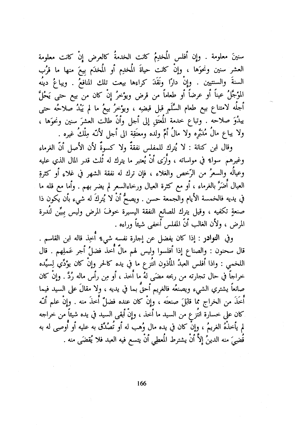 سِنِينَ مَعْلُومَةً وَإِنْ أَفْلَسَ المُخدم كَانَتِ الْخِدْمَةُ كَالْعَرَضِ إِنْ كَانَتْ مَعْلُومَةَ الْعَشْرِ سِنِينَ وَنَحْوِهَا وَإِنْ كَانَتْ حَيَاةُ المُخدم أَوِ المُخدَم بِيعَ مِنْهَا مَا قُرْبَ السَّنَةِ وَالسَّنَتَيْنِ وَإِنْ دَارًا وَنَقَدَ كِرَاءَهَا بِيعَتْ تِلْكَ الْمَنَافِعُ وَيُبَاعُ دينُه المؤجَّل عينا أوعرضاً أَوْ طَعَامًا مِنْ قَرْضٍ وَيُؤَخَّرُ إِنْ كَانَ مِنْ بَيْعٍ حَتَّى يحُل أَجْلُهُ لِامْتِنَاعِ بَيْعِ طَعَامِ السَّلم قَبْلَ قَبْضِهِ وَيُؤَخَّرُ بَيْعُ مَا لَمْ يبدُ صَلَاحُهُ حَتَّى يَبْدُوَ صَلَاحُهُ وَتُبَاعُ خِدْمَةُ المُعتق إِلَى أَجَلٍ وَإِنْ طَالَتِ الْعَشْرَ سِنِينَ وَنَحْوِهَا وَلَا يُبَاعُ مَالُ مُدبره وَلَا مَالُ أمِّ وَلَدِهِ وَمُعْتَقِهِ إِلَى أَجَلٍ لِأَنَّهُ مِلْكُ غَيْرِهِ وَقَالَ ابْنُ كِنَانَةَ: لَا يُترك لِلْمُفْلِسِ نَفَقَةٌ وَلَا كِسْوَةٌ لِأَنَّ الْأَصْلَ أَنَّ الْغُرَمَاءَ وَغَيْرَهُمْ سَوَاءٌ فِي مُوَاسَاتِهِ وَأَرَى أَنْ يُعتبر مَا يَتْرُكُ لَهُ ثُلُثَ قَدْرِ الْمَالِ الَّذِي عَلَيْهِ وَعِيَالُهُ وَالسِّعْرُ مِنَ الرُّخْصِ وَالْغَلَاءِ فَإِنْ تُرِكَ لَهُ نَفَقَةُ الشَّهْرِ فِي غَلَاءٍ أَوْ كَثْرَةِ الْعِيَالِ أضرَّ بِالْغُرَمَاءِ أَوْ مَعَ كَثْرَةِ الْعِيَالِ وَرَخَاءِ السِّعْرِ لَمْ يَضُرَّ بِهِمْ وَأَمَّا مَعَ قِلَّةِ مَا فِي يَدَيْهِ فَالْخَمْسَةُ الْأَيَّامِ وَالْجُمُعَةُ حَسَنٌ ويصحُّ أَنْ لَا يُترك لَهُ شَيْءٌ بِأَنْ يَكُونَ ذَا صنعةٍ تَكْفِيهِ وَقِيلَ يُتْرَكُ لِلصَّانِعِ النَّفَقَةُ الْيَسِيرَةُ خَوْفَ الْمَرَضِ وَلَيْسَ بِبَيِّنٍ لُندرة الْمَرَضِ وَلِأَنَّ الْغَالِبَ أَنَّ الْمُفَلَّسَ أَخْفَى شَيْئًا وَرَاءَهُ وَفِي النَّوَادِرِ: إِذَا كَانَ يَفْضُلُ عَنْ إِجَارَةِ نَفْسِهِ شَيْءٌ أُخذ قَالَه ابْن الْقَاسِم قَالَ سَحْنُون: والصناع إِن أَفْلَسُوا وَلَيْسَ لَهُمْ مَالٌ أُخذ فَضْلُ أَجْرِ عَمَلِهِمْ قَالَ اللَّخْمِيُّ: وَإِذَا أَفْلَسَ الْعَبْدُ الْمَأْذُونُ انتُزع مَا فِي يَدِهِ كَالْحُرِّ وَإِنْ كَانَ يُؤَدِّي لِسَيِّدِهِ خَرَاجًا فِي حَالِ تِجَارَتِهِ مِنْ رِبْحِهِ مَضَى لَهُ مَا أَخَذَ أَوْ مِنْ رَأْسِ مَالِهِ رُدَّ وَإِنْ كَانَ صَانِعًا يَشْتَرِي الشَّيْءَ وَيَصْنَعُهُ فَالْغَرِيمُ أَحَقُّ بِمَا فِي يَدَيْهِ وَلَا مَقَالَ عَلَى السَّيِّدِ فِيمَا أُخِذَ مِنَ الْخَرَاجِ مِمَّا قَابَلَ صَنْعَتَهُ وَإِنْ كَانَ عِنْدَهُ فضلٌ أُخِذَ مِنْهُ وَإِنْ عُلِمَ أَنَّهُ كَانَ عَلَى خَسَارَةٍ انتُزع مِنَ السَّيِّدِ مَا أَخَذَ وَإِنْ أَبْقَى السَّيِّدُ فِي يَدِهِ شَيْئًا مِنْ خَرَاجِهِ لَمْ يَأْخُذْهُ الْغَرِيمُ وَإِنْ كَانَ فِي يَدِهِ مَالٌ وُهب لَهُ أَوْ تُصُدِّق بِهِ عَلَيْهِ أَوْ أُوصي لَهُ بِهِ قُضي مِنْهُ الدَّيْنُ إِلَّا أَنْ يَشْتَرِطَ المُعطي أَنْ يَتَّسِعَ فِيهِ الْعَبْدُ فَلَا يُقضى مِنْهُ