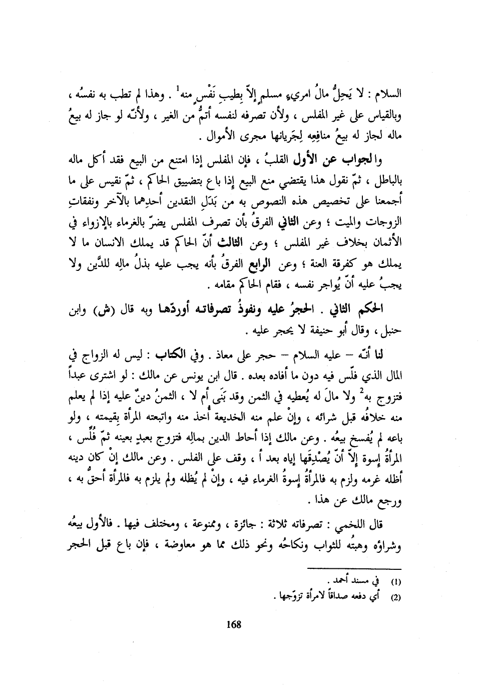 السَّلَامُ لَا يَحِلُّ مَالُ امْرِئٍ مُسْلِمٍ إِلَّا بِطِيبِ نفسٍ مِنْهُ " وَهَذَا لَمْ تَطِبْ بِهِ نَفْسُهُ وَبِالْقِيَاسِ عَلَى غَيْرِ الْمُفَلَّسِ وَلِأَنَّ تَصَرُّفَهُ لِنَفْسِهِ أتمُّ مِنَ الْغَيْرِ وَلِأَنَّهُ لَوْ جَازَ لَهُ بَيْعُ مَالِهِ لَجَازَ لَهُ بَيْعُ مَنَافِعِهِ لجريانها مجْرى الْأَمْوَال وَالْجَوَاب عَن الْأَوَّلِ الْقَلْبُ فَإِنَّ الْمُفَلَّسَ إِذَا امْتَنَعَ مِنَ الْبَيْعِ فَقَدْ أَكَلَ مَالَهُ بِالْبَاطِلِ ثُمَّ نَقُولُ هَذَا يَقْتَضِي مَنْعَ الْبَيْعِ إِذَا بَاعَ بِتَضْيِيقِ الْحَاكِمِ ثُمَّ نَقِيسُ عَلَى مَا أَجْمَعْنَا عَلَى تَخْصِيصِ هَذِهِ النُّصُوصِ بِهِ مِنْ بدلِ النَّقْدَيْنِ أَحَدِهِمَا بِالْآخَرِ وَنَفَقَاتِ الزَّوْجَاتِ وَالْمَيِّتِ وَعَنِ الثَّانِي الْفَرْقُ بِأَنَّ تَصَرُّفَ الْمُفَلَّسِ يَضُرُّ بِالْغُرَمَاءِ بِالْإِزْوَاءِ فِي الْأَثْمَانِ بِخِلَافِ غَيْرِ الْمُفَلَّسِ وَعَنِ الثَّالِثِ أَنَّ الْحَاكِمَ قَدْ يَمْلِكُ الْإِنْسَانُ مَا لَا يَمْلِكُ هُوَ كَفُرْقَةِ الْعُنَّةِ وَعَنِ الرَّابِعِ الْفَرْقُ بِأَنَّهُ يَجِبُ عَلَيْهِ بَذْلُ مَالِهِ لِلدَّيْنِ وَلَا يجب عَلَيْهِ أَن يُواجر نَفْسَهُ فَقَامَ الْحَاكِمُ مَقَامَهُ الْحُكْمُ الثَّانِي: الحجرُ عَلَيْهِ ونفوذ تَصَرُّفَاته أوردهَا وَبِه قَالَ (ش) وَابْن حَنْبَل وَقَالَ أَبُو حنيفَة لَا يحْجر عَلَيْهِ لنا أَنه - صَلَّى اللَّهُ عَلَيْهِ وَسَلَّم َ - حَجَرَ عَلَى مُعَاذٍ وَفِي الْكِتَابِ: لَيْسَ لَهُ الزواج فِي الْمَالِ الَّذِي فُلِّسَ فِيهِ دُونَ مَا أَفَادَهُ بَعْدَهُ قَالَ ابْنُ يُونُسَ عَنْ مَالِكٍ: لَوِ اشْتَرَى عَبْدًا فَتَزَوَّجَ بِهِ وَلَا مَالَ لَهُ يُعطيه فِي الثَّمَنِ وَقَدْ بَنَى أَمْ لَا الثَّمَنُ دينٌ عَلَيْهِ إِذَا لَمْ يُعْلَمْ مِنْهُ خِلَافُهُ قَبْلَ شِرَائِهِ وَإِنْ عُلِمَ مِنْهُ الْخَدِيعَةُ أُخذ مِنْهُ وَاتَّبَعَتْهُ الْمَرْأَةُ بِقِيمَتِهِ وَلَوْ بَاعَهُ لَمْ يُفسخ بَيْعُهُ وَعَنْ مَالِكٍ إِذَا أَحَاطَ الدَّيْنُ بِمَالِهِ فَتَزَوَّجَ بعبدٍ بِعَيْنِهِ ثُمَّ فُلِّس الْمَرْأَةُ إِسْوَةٌ إِلَّا أَنْ يُصدقها إِيَّاهُ بَعْدَ أَنْ وَقَفَ عَلَى الْفَلَسِ وَعَنْ مَالِكٍ إِنْ كَانَ دَيْنُهُ أَظَلَّهُ غُرْمُهُ وَلَزِمَ بِهِ فَالْمَرْأَةُ أُسْوَةُ الْغُرَمَاءِ فِيهِ وَإِنْ لَمْ يُظله وَلَمْ يُلْزَمْ بِهِ فَالْمَرْأَةُ أَحَقُّ بِهِ وَرَجَعَ مَالِكٌ عَنْ هَذَا قَالَ اللَّخْمِيُّ: تَصَرُّفَاتُهُ ثَلَاثَةٌ: جَائِزَةٌ وممنوعة ومختلف فِيهَا فَالْأول بَيْعُهُ وَشِرَاؤُهُ وَهِبَتُهُ لِلثَّوَابِ وَنِكَاحُهُ وَنَحْوُ ذَلِكَ مِمَّا هُوَ مُعَاوَضَةٌ فَإِنْ بَاعَ قَبْلَ الْحَجْرِ