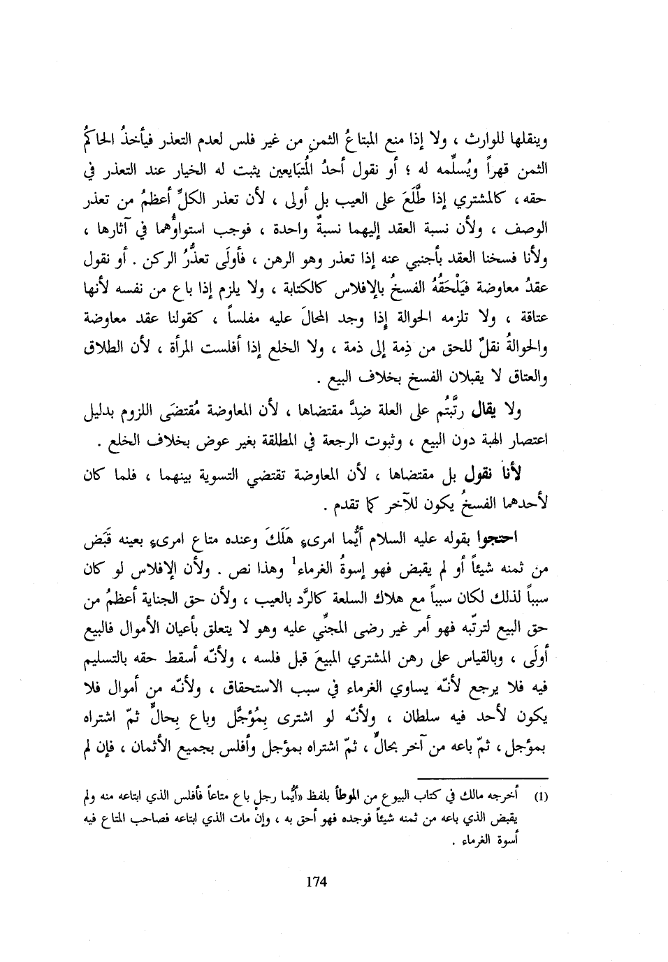 وَيَنْقُلُهَا لِلْوَارِثِ وَلَا إِذَا مَنَعَ الْمُبْتَاعُ الثَّمَنَ مِنْ غَيْرِ فَلَسٍ لِعَدَمِ التَّعَذُّرِ فَيَأْخُذُ الْحَاكِمُ الثَّمَنَ قَهْرًا ويُسلِّمه لَهُ أَوْ نَقُولُ أَحَدُ المُتبايعين يَثْبُتُ لَهُ الْخِيَارُ عِنْدَ التَّعَذُّرِ فِي حَقِّهِ كالمشتري إِذا طَّلَعَ عَلَى الْعَيْبِ بَلْ أَوْلَى لِأَنَّ تَعَذُّرَ الْكُلِّ أَعْظَمُ مِنْ تَعَذُّرِ الْوَصْفِ وَلِأَنَّ نِسْبَةَ الْعَقْدِ إِلَيْهِمَا نسبةٌ وَاحِدَةٌ فَوَجَبَ اسْتِوَاؤُهُمَا فِي آثَارِهَا وَلِأَنَّا فَسَخْنَا الْعَقْدَ بِأَجْنَبِيٍّ عَنْهُ إِذَا تَعَذَّرَ وَهُوَ الرَّهْنُ فَأَوْلَى تعذُّرُ الرُّكْنِ أَوْ نَقُولُ عَقْدُ مُعَاوَضَةٍ فيلحقُهُ الْفَسْخُ بِالْإِفْلَاسِ كَالْكِتَابَةِ وَلَا يَلْزَمُ إِذَا بَاعَ مِنْ نَفْسِهِ لِأَنَّهَا عَتَاقَةٌ وَلَا تَلْزَمُهُ الْحَوَالَةُ إِذَا وَجَدَ الْمُحَالَ عَلَيْهِ مُفَلَّسًا كَقَوْلِنَا عَقْدُ مُعَاوَضَةٍ وَالْحَوَالَةُ نَقْلٌ لِلْحَقِّ مِنْ ذِمَّةٍ إِلَى ذِمَّةٍ وَلَا الْخُلْعَ إِذَا أَفْلَسَتِ الْمَرْأَةُ لِأَنَّ الطَّلَاقَ وَالْعَتَاقَ لَا يَقْبَلَانِ الْفَسْخَ بِخِلَافِ الْبَيْعِ وَلَا يُقَالُ رتَّبتم عَلَى الْعِلَّةِ ضدَّ مُقْتَضَاهَا لِأَنَّ الْمُعَاوَضَةَ مُقتضى اللُّزُومِ بِدَلِيلِ اعْتِصَارِ الْهِبَةِ دُونَ الْبَيْعِ وَثُبُوتِ الرَّجْعَةِ فِي الْمُطَلَّقَةِ بِغَيْرِ عِوَضٍ بِخِلَافِ الْخُلْعِ لِأَنَّا نَقُولُ بَلْ مُقْتَضَاهَا لِأَنَّ الْمُعَاوَضَةَ تَقْتَضِي التَّسْوِيَةَ بَيْنَهُمَا فَلَمَّا كَانَ لِأَحَدِهِمَا الْفَسْخُ يَكُونُ لِلْآخَرِ كَمَا تَقَدَّمَ احْتَجُّوا بِقَوْلِهِ - صَلَّى اللَّهُ عَلَيْهِ وَسَلَّم َ - أيُّما امرئٍ هَلَكَ وَعِنْدَهُ مَتَاعُ امْرِئٍ بِعَيْنِهِ قَبَضَ مِنْ ثَمَنِهِ شَيْئًا أَوْ لَمْ يَقْبِضْ فَهُوَ أُسْوَةُ الْغُرَمَاءِ وَهَذَا نَصٌّ وَلِأَنَّ الْإِفْلَاسَ لَوْ كَانَ سَبَبًا لِذَلِكَ لَكَانَ سَبَبًا مَعَ هَلَاكِ السِّلْعَةِ كالرَّد بِالْعَيْبِ وَلِأَنَّ حَقَّ الْجِنَايَةِ أَعْظَمُ مِنْ حَقِّ الْبَيْعِ لِتَرَتُّبِهِ فَهُوَ أَمْرٌ غير رَضِي المجِّني عَلَيْهِ وَهُوَ لَا يَتَعَلَّقُ بِأَعْيَانِ الْأَمْوَالِ فَالْبَيْعُ أَوْلَى وَبِالْقِيَاسِ عَلَى رَهْنِ الْمُشْتَرِيِ الْمَبِيعَ قَبْلَ فَلَسِهِ وَلِأَنَّهُ أَسْقَطَ حَقَّهُ بِالتَّسْلِيمِ فِيهِ فَلَا يَرْجِعُ لِأَنَّهُ يُسَاوِي الْغُرَمَاءَ فِي سَبَبِ الِاسْتِحْقَاق وَلِأَنَّهُ من أَمْوَال فَلَا يَكُونُ لِأَحَدٍ فِيهِ سُلْطَانٌ وَلِأَنَّهُ لَوِ اشْتَرَى بِمُؤَجَّلٍ وَبَاعَ بحالٍّ ثُمَّ اشْتَرَاهُ بِمُؤَجَّلٍ ثُمَّ بَاعَهُ مِنْ آخَرَ بِحَالٍّ ثُمَّ اشْتَرَاهُ بِمُؤَجَّلٍ وَأَفْلَسَ بِجَمِيعِ الْأَثْمَانِ فَإِنْ لَمْ