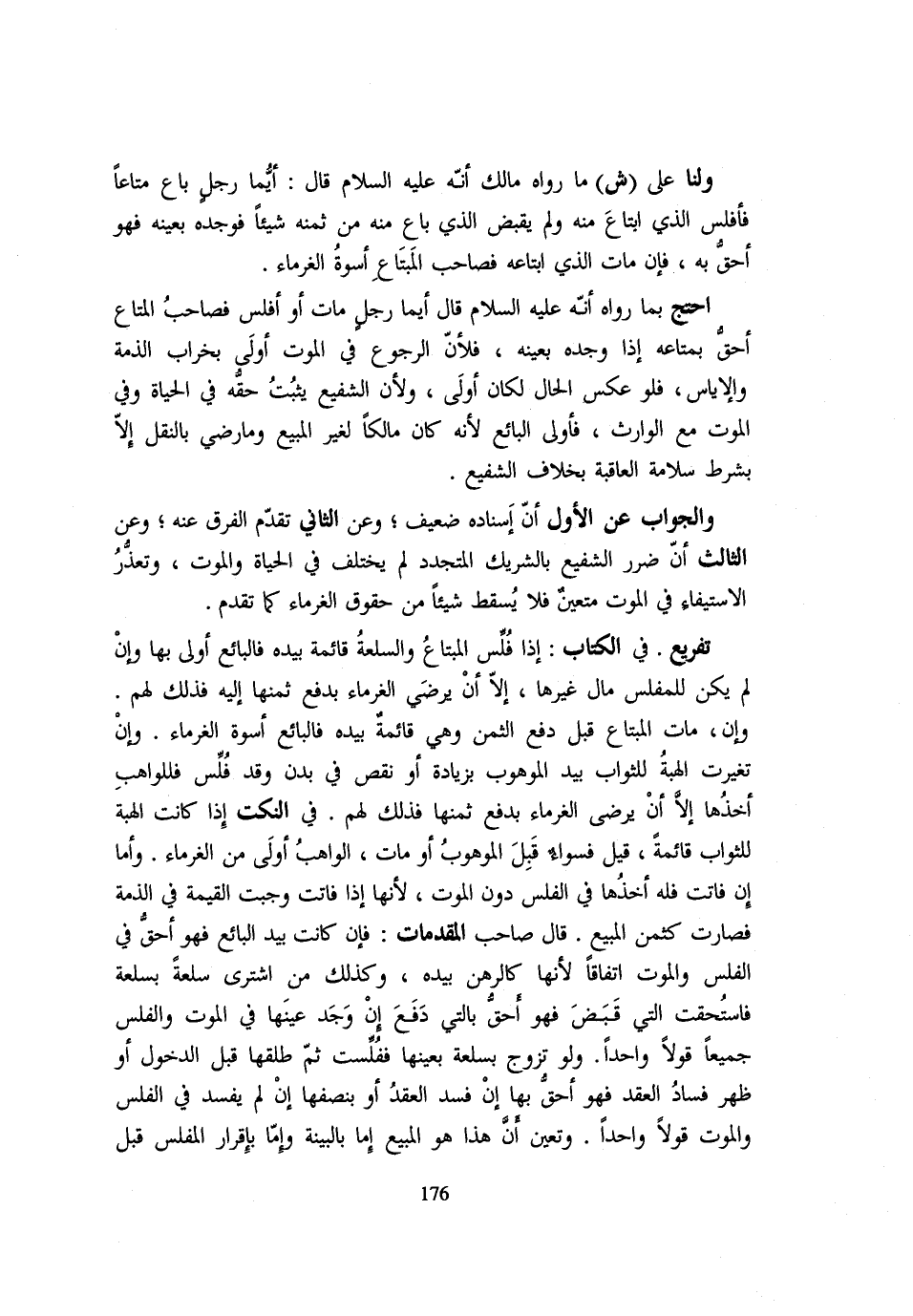وَلَنَا عَلَى (ش) مَا رَوَاهُ مَالِكٌ أَنَّهُ - صَلَّى اللَّهُ عَلَيْهِ وَسَلَّم َ - قَالَ: أيُّما رجلٍ بَاعَ مَتَاعًا فَأَفْلَسَ الَّذِي ابْتَاعَ مِنْهُ وَلَمْ يَقْبِضِ الَّذِي بَاعَ مِنْهُ مِنْ ثَمَنِهِ شَيْئًا فَوَجَدَهُ بِعَيْنِهِ فَهُوَ أحقُّ بِهِ فَإِن مَاتَ الَّذِي ابتاعه فَصَاحب الْمُبْتَاع أُسْوَة الْغُرَمَاء احْتج بِمَا رَوَاهُ أَنه - صَلَّى اللَّهُ عَلَيْهِ وَسَلَّم َ - قَالَ أَيُّمَا رجلٍ مَاتَ أَوْ أَفْلَسَ فَصَاحِبُ الْمَتَاع أحقُّ بمتاعه إِذا وجده بِعَيْنِه فَلِأَن الرُّجُوعَ فِي الْمَوْتِ أَوْلَى بِخَرَابِ الذِّمَّةِ وَالْإِيَاسِ فَلَوْ عُكِسَ الْحَالُ لَكَانَ أَوْلَى وَلِأَنَّ الشَّفِيعَ يَثْبُتُ حَقُّهُ فِي الْحَيَاةِ وَفِي الْمَوْتِ مَعَ الْوَارِثِ فَأَوْلَى الْبَائِعُ لِأَنَّهُ كَانَ مَالِكًا لِغَيْرِ الْمَبِيعِ وَمَا رَضِيَ بِالنَّقْلِ إِلَّا بِشَرْطِ سَلَامَةِ الْعَاقِبَةِ بِخِلَافِ الشَّفِيعِ وَالْجَوَابُ عَنِ الْأَوَّلِ أَنَّ إِسْنَادَهُ ضَعِيفٌ وَعَنِ الثَّانِي تَقَدَّمَ الْفَرْقُ عَنْهُ وَعَن الثَّالِث أَن ضَرَر الشَّفِيع بالشريك والمتجدد لَمْ يَخْتَلِفْ فِي الْحَيَاةِ وَالْمَوْتِ وَتَعَذُّرَ الِاسْتِيفَاءِ فِي الْمَوْتِ مُتَعَيَّنٌ فَلَا يُسْقِطُ شَيْئًا مِنْ حُقُوقِ الْغُرَمَاءِ كَمَا تَقَدَّمَ تَفْرِيعٌ فِي الْكِتَابِ: إِذا فلس الْمُبْتَاع وَالسِّلْعَةُ قَائِمَةٌ بِيَدِهِ فَالْبَائِعُ أَوْلَى بِهَا وَإِنْ لَمْ يَكُنْ لِلْمُفْلِسِ مَالٌ غَيْرُهَا إِلَّا أَنْ يَرْضَى الْغُرَمَاءُ بِدَفْعِ ثَمَنِهَا إِلَيْهِ فَذَلِكَ لَهُمْ وَإِنْ مَاتَ الْمُبْتَاعُ قَبْلَ دَفْعِ الثَّمَنِ وَهِيَ قَائِمَةٌ بِيَدِهِ فَالْبَائِعُ أُسْوَةُ الْغُرَمَاءِ وَإِنْ تَغَيَّرَتِ الْهِبَةُ لِلثَّوَابِ بِيَدِ الْمَوْهُوبِ بِزِيَادَةٍ أَوْ نَقْصٍ فِي بَدَنٍ وَقَدْ فُلِّسَ فَلِلْوَاهِبِ أَخْذُهَا إِلَّا أَنْ يَرْضَى الْغُرَمَاءُ بِدَفْعِ ثَمَنِهَا فَذَلِكَ لَهُمْ فِي النُّكَتِ إِذَا كَانَتِ الْهِبَةُ لِلثَّوَابِ قَائِمَةً قِيلَ فَسَوَاءٌ قَبِلَ الْمَوْهُوبُ أَوْ مَاتَ الْوَاهِبُ أَوْلَى مِنَ الْغُرَمَاءِ وَأَمَّا إِنْ فَاتَتْ فَلَهُ أَخْذُهَا فِي الْفَلَسِ دُونَ الْمَوْتِ لِأَنَّهَا إِذَا فَاتَتْ وَجَبَتِ الْقِيمَةُ فِي الذِّمَّةِ فَصَارَتْ كَثَمَنِ الْمَبِيعِ قَالَ صَاحِبُ الْمُقَدِّمَاتِ: فَإِنْ كَانَتْ بِيَدِ الْبَائِعِ فَهُوَ أَحَقُّ فِي الْفَلَسِ وَالْمَوْتِ اتِّفَاقًا لِأَنَّهَا كَالرَّهْنِ بِيَدِهِ وَكَذَلِكَ مَنِ اشْتَرَى سِلْعَةً بِسِلْعَةٍ فَاسْتَحَقَّتِ الَّتِي قَبَضَ فَهُوَ أَحَقُّ بَالَتِي دفع بِالدفع إِنْ وَجَدَ عَيْنَهَا فِي الْمَوْتِ وَالْفَلَسِ جَمِيعًا قَوْلًا وَاحِدًا وَلَوْ تَزَوَّجَ بِسِلْعَةٍ بِعَيْنِهَا فَفُلِّسَتْ ثُمَّ طَلَّقَهَا قَبْلَ الدُّخُولِ أَوْ ظَهَرَ فَسَادُ الْعَقْدِ فَهُوَ أَحَقُّ بِهَا إِنْ فَسَدَ الْعَقْدُ أَوْ بِنِصْفِهَا إِنْ لَمْ يَفْسُدْ فِي الْفَلَسِ وَالْمَوْتِ قَوْلًا وَاحِدًا وَتَعَيَّنَ أَنَّ هَذَا هُوَ الْمَبِيعُ إِمَّا بِالْبَيِّنَةِ وَإِمَّا بِإِقْرَارِ الْمُفَلَّسِ قَبْلَ