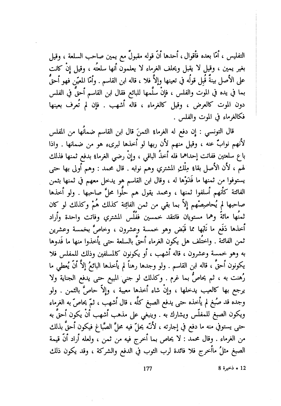 التَّفْلِيس أما بعده فأقوال أَحدهَا أَنَّ قَوْلَهُ مَقْبُولٌ مَعَ يَمِينِ صَاحِبِ السِّلْعَةِ وَقِيلَ بِغَيْرِ يَمِينٍ وَقِيلَ لَا يُقْبَلُ وَيَحْلِفُ الْغُرَمَاءُ لَا يَعْلَمُونَ أَنَّهَا سِلْعَتُهُ وَقِيلَ إِنْ كَانَتْ عَلَى الْأَصْلِ بَيِّنَةٌ قُبِلَ قَوْلُهُ فِي تَعَيُّنِهَا وَإِلَّا فَلَا قَالَهُ ابْنُ الْقَاسِمِ وَأَمَّا الْمُعَيِّنُ فَهُوَ أَحَقُّ بِمَا فِي يَدِهِ فِي الْمَوْتِ وَالْفَلَسِ فَإِنْ سَلَّمَهَا لِلْبَائِعِ فَقَالَ ابْنُ الْقَاسِمِ أَحَقُّ فِي الْفَلَسِ دُونَ الْمَوْتِ كَالْعَرَضِ وَقِيلَ كَالْغُرَمَاءِ قَالَهُ أَشْهَبُ فَإِنْ لَمْ تُعْرَفْ بِعَيْنِهَا فَكَالْغُرَمَاءِ فِي الْمَوْتِ وَالْفَلَسِ قَالَ التُّونُسِيُّ: إِنْ دَفَعَ لَهُ الْغُرَمَاءُ الثَّمَنَ قَالَ ابْنُ الْقَاسِمِ: ضَمَانُهَا مِنَ الْمُفَلَّسِ لِأَنَّهُمْ نُوَّابٌ عَنْهُ وَقِيلَ مِنْهُمْ لِأَنَّ رَبَّهَا لَوْ أَخَذَهَا لَبَرِئَ هُوَ مِنْ ضَمَانِهَا وَإِذَا بَاعَ سِلْعَتَيْنِ فَفَاتَتْ إِحْدَاهَا فَلَهُ أَخْذُ الْبَاقِي وَإِنْ رَضِيَ الْغُرَمَاءُ بِدَفْعِ ثَمَنِهَا فَذَلِكَ لَهُمْ لِأَنَّ الْأَصْلَ بَقَاءُ مِلْكِ الْمُشْتَرِي وَهُمْ نُوَّابُهُ قَالَ مُحَمَّدٌ: وَهُم أَوْلَى بِهَا حَتَّى يَسْتَوْفُوا مِنْ ثَمَنِهَا مَا فَدَوْهَا لَهُ وَقَالَ ابْنُ الْقَاسِمِ هُوَ يَدْخُلُ مَعَهُمْ فِي ثمنهَا بِثمن الْفَائِتَةِ كَأَنَّهُمْ أَسْلَفُوا ثَمَنَهَا وَمُحَمَّدٌ يَقُولُ هُمْ حلُّوا محلَّ صَاحِبِهَا وَلَوْ أَخَذَهَا صَاحِبُهَا لَمْ يُحاصِصهم إِلَّا بِمَا بَقِيَ مِنْ ثَمَنِ الْفَائِتَةِ كَذَلِكَ هُمْ وَكَذَلِكَ لَوْ كَانَ ثَمَنُهَا مِائَةً وَهُمَا مُسْتَوَيَانِ فَانْتَقَدَ خَمْسِينَ فَفُلِّسَ الْمُشْتَرِي وَفَاتَتْ وَاحِدَةٌ وَأَرَادَ أَخْذَهَا دَفَعَ مَا نَابَهَا مِمَّا قبض وَهُوَ خَمْسَة وَعِشْرُونَ وخاص بِخَمْسَةٍ وَعِشْرِينَ ثَمَنِ الْفَائِتَةِ وَاخْتُلِفَ هَلْ يَكُونُ الْغُرَمَاءُ أَحَقَّ بِالسِّلْعَةِ حَتَّى يَأْخُذُوا مِنْهَا مَا فَدَوْهَا بِهِ وَهُوَ خَمْسَةٌ وَعِشْرُونَ قَالَهُ أَشْهَبُ أَوْ يَكُونُونَ كَالْمُسَلِّفِينَ وَذَلِكَ لِلْمُفْلِسِ فَلَا يَكُونُونَ أَحَقَّ قَالَهُ ابْنُ الْقَاسِمِ وَلَوْ وَجَدَهَا رَهْنًا لَمْ يَأْخُذْهَا الْبَائِعُ إِلَّا أَنْ يُعطي مَا رُهنت بِهِ ثُمَّ يحاصُّ بِمَا غَرِمَ وَكَذَلِكَ لَوْ جَنَى الْمَبِيعَ حَتَّى يَدْفَعَ الْجِنَايَةَ وَلَا يَرْجِعَ بِهَا كَالْعَيْبِ يُدْخُلُهَا وَإِنْ شَاءَ أَخَذَهَا مَعِيبَةً وَإِلَّا حاصَّ بِالثَّمَنِ وَلَوْ وَجَدَهُ قَدْ صُبغ لَمْ يَأْخُذْهُ حَتَّى يَدْفَعَ الصَّبْغَ كُلَّهُ قَالَ أَشْهَبُ: ثُمَّ يُحَاصُّ بِهِ الْغُرَمَاءَ وَيَكُونُ الصَّبْغُ لِلْمُفْلِسِ وَيُشَارِكُ بِهِ وَيَنْبَغِي عَلَى مَذْهَبِ أَشْهَبَ أَنْ يَكُونَ أَحَقَّ بِهِ حَتَّى يَسْتَوْفِيَ مِنْهُ مَا دَفَعَ فِي إِجَارَتِهِ لِأَنَّهُ يَحِلُّ فِيهِ مَحَلَّ الصَّبَّاغِ فَيَكُونُ أَحَقَّ بِذَلِكَ مِنَ الْغُرَمَاءِ وَقَالَ مُحَمَّدٌ: لَا يُحَاصَّ بِمَا أَخْرَجَ فِيهِ مِنْ ثَمَنٍ وَلَعَلَّهُ أَرَادَ أَنَّ قِيمَةَ الصَّبْغِ مِثْلَ مَا أَخْرَجَ فَلَا فَائِدَةَ لِرَبِّ الثَّوْبِ فِي الدَّفْعِ وَالشَّرِكَةِ وَقَدْ يَكُونُ ذَلِكَ