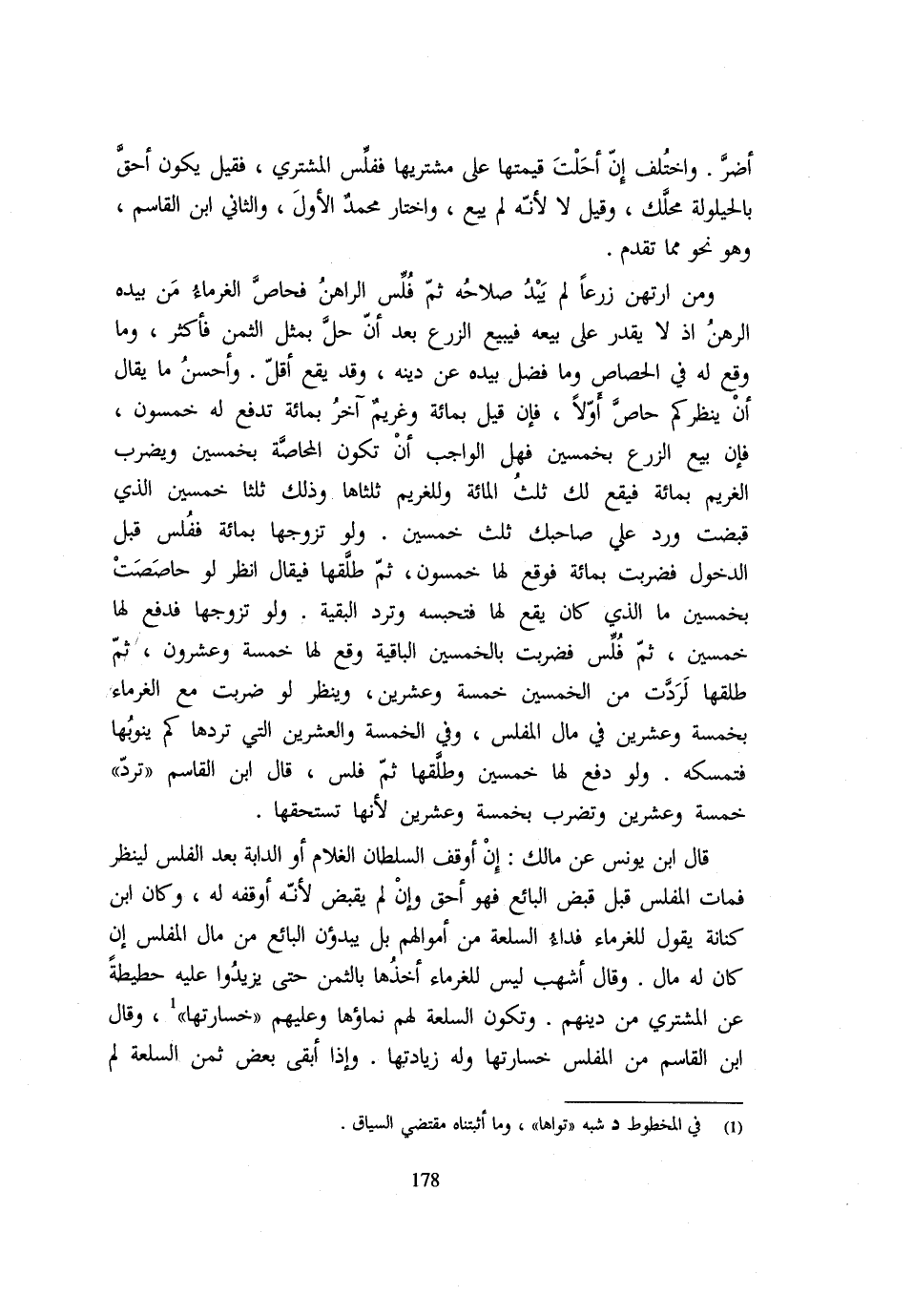 أضرَّ وَاخْتُلِفَ إِنْ أَحَلْتَ قِيمَتَهَا عَلَى مُشْتَرِيهَا ففلِّس الْمُشْتَرِي فَقِيلَ يَكُونُ أحقَّ بِالْحَيْلُولَةِ محلَّك وَقِيلَ لَا لِأَنَّهُ لَمْ يَبِعْ وَاخْتَارَ مُحَمَّدٌ الأول وَالثَّانِي وَابْن الْقَاسِمِ وَهُوَ نَحْوٌ مِمَّا تَقَدَّمَ وَمَنِ ارْتَهَنَ زَرْعًا لَمْ يَبدُ صَلَاحُهُ ثُمَّ فُلِّس الرَّاهِنُ فحاصَّ الْغُرَمَاءُ مَنْ بِيَدِهِ الرَّهْنُ إِذْ لَا يَقْدِرُ عَلَى بَيْعِهِ فَيَبِيعُ الزَّرْعَ بَعْدَ أَنْ حلَّ بِمِثْلِ الثَّمَنِ فَأَكْثَرَ وَمَا وَقَعَ لَهُ فِي الْحِصَاصِ وَمَا فَضَلَ بِيَدِهِ عَنْ دَيْنِهِ وَقَدْ يَقَعُ أَقَلَّ وَأَحْسَنُ مَا يُقَالُ أَنْ ينظركم حاصَّ أَوَّلًا فَإِنْ قِيلَ بِمِائَةٍ وغريمٌ آخَرُ بِمِائَةٍ تُدْفَعُ لَهُ خَمْسُونَ فَإِنْ بِيعَ الزَّرْعُ بِخَمْسِينَ فَهَلِ الْوَاجِبُ أَنْ تَكُونَ الْمُحَاصَّةُ بِخَمْسِينَ وَيُضْرَبَ الْغَرِيمُ بِمِائَةٍ فَيَقَعَ لَكَ ثُلُثُ الْمِائَةِ وَلِلْغَرِيمِ ثُلُثَاهَا وَذَلِكَ ثُلُثَا خَمْسِينَ الَّذِي قَبَضْتَ ورد على صَاحبك ثلث الْخمسين وَلَوْ تَزَوَّجَهَا بِمِائَةٍ ففُلس قَبْلَ الدُّخُولِ فَضَرَبَتْ بِمِائَةٍ فَوَقَعَ لَهَا خَمْسُونَ ثُمَّ طلَّقها فَيُقَالُ انْظُرْ لَوْ حَاصَصْتَ بِخَمْسِينَ مَا الَّذِي كَانَ يَقَعُ لَهَا فَتَحْسَبُهُ وَتَرُدُّ الْبَقِيَّةَ وَلَوْ تَزَوَّجَهَا فَدَفَعَ لَهَا خَمْسِينَ ثُمَّ فُلِّس فَضَرَبَتْ بِالْخَمْسِينَ الْبَاقِيَةِ وَقَعَ لَهَا خَمْسَةٌ وَعِشْرُونَ ثُمَّ طَلَّقَهَا لرَدًّت مِنَ الْخَمْسِينَ خَمْسَةً وَعِشْرِينَ وَيَنْظُرُ لَوْ ضَرَبَتْ مَعَ الْغُرَمَاءِ بِخَمْسَةٍ وَعِشْرِينَ فِي مَالِ الْمُفَلَّسِ وَفِي الْخَمْسَةِ وَالْعِشْرِينَ الَّتِي تَرُدُّهَا كَمْ ينوبُها فَتُمْسِكُهُ وَلَوْ دَفَعَ لَهَا خَمْسِينَ وطلَّقها ثُمَّ فُلِّسَ قَالَ ابْنُ الْقَاسِمِ " تَرُدُّ " خَمْسَةً وَعِشْرِينَ وَتَضْرِبُ بِخَمْسَةٍ وَعِشْرِينَ لِأَنَّهَا تَسْتَحِقُّهَا قَالَ ابْنُ يُونُسَ عَنْ مَالِكٍ: إِنْ أَوْقَفَ السُّلْطَانُ الْغُلَامَ أَوِ الدَّابَّةَ بَعْدَ الْفَلَسِ لِيَنْظُرَ فَمَاتَ الْمُفَلَّسُ قَبْلَ قَبْضِ الْبَائِعِ فَهُوَ أَحَقُّ وَإِنْ لم يقبض لِأَنَّهُ أوقفهُ بِهِ وَكَانَ ابْن كنَانَة يَقُول للْغُرَمَاء فدَاء السّلْعَة من أَمْوَالهم بل يبدؤن الْبَائِعَ مِنْ مَالِ الْمُفَلَّسِ إِنْ كَانَ لَهُ مَالٌ وَقَالَ أَشْهَبُ: لَيْسَ لِلْغُرَمَاءِ أَخْذُهَا بِالثَّمَنِ حَتَّى يَزِيدُوا عَلَيْهِ حَطِيطَةً عَنِ الْمُشْتَرِي مِنْ دَيْنِهِمْ وَتَكُونُ السِّلْعَةُ لَهُمْ نَمَاؤُهَا وَعَلَيْهِمْ " خَسَارَتُهَا " وَقَالَ ابْنُ الْقَاسِمِ مِنَ الْمُفَلَّسِ خَسَارَتُهَا وَلَهُ زِيَادَتُهَا وَإِذَا أَبْقَى بَعْضَ ثَمَنِ السِّلْعَةِ لَمْ