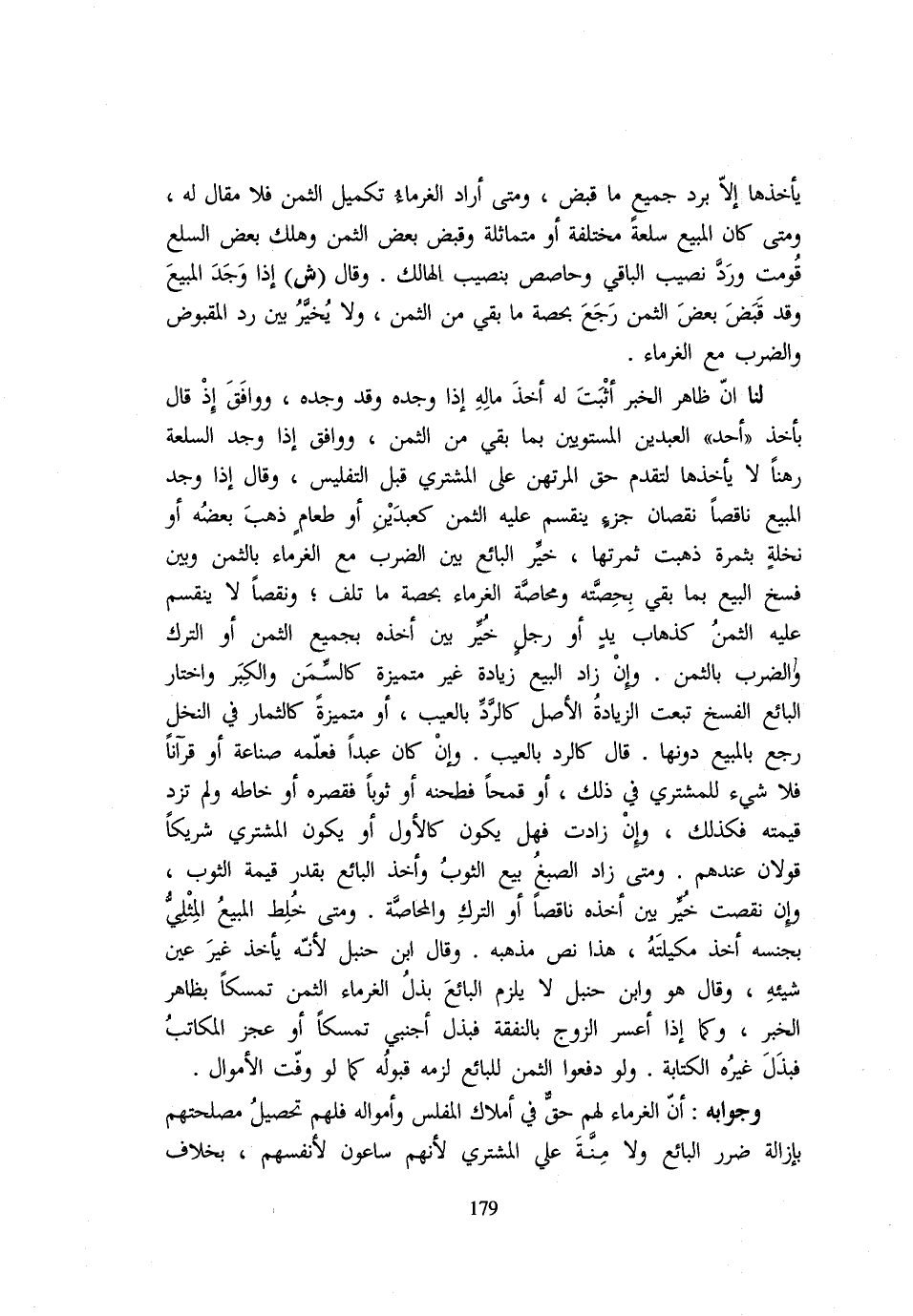 يَأْخُذْهَا إِلَّا بِرَدِّ جَمِيعِ مَا قَبَضَ وَمَتَى أَرَادَ الْغُرَمَاءُ تَكْمِيلَ الثَّمَنِ فَلَا مَقَالَ لَهُ وَمَتَى كَانَ الْمَبِيعُ سِلْعَةً مُخْتَلِفَةً أَوْ مُتَمَاثِلَةً وَقَبَضَ بَعْضَ الثَّمَنِ وَهَلَكَ بَعْضُ السِّلَعِ قُومت ورَدّ نَصِيبَ الْبَاقِي وَحَاصَصَ بِنَصِيبِ الْهَالِكِ وَقَالَ (ش) إِذَا وَجَدَ الْمَبِيعُ وَقَدْ قَبَضَ بَعْضَ الثّمن رَجَعَ بِحِصَّة مَا بَقِيَ مِنَ الثَّمَنِ وَلَا يُخيَّر بَيْنَ رَدِّ الْمَقْبُوضِ وَالضَّرْبِ مَعَ الْغُرَمَاءِ لَنَا أَنَّ ظَاهِرَ الْخَبَرِ أُثبت لَهُ أَخْذَ مَالِهِ إِذَا وجده وَقد وجده وَوَافَقَ إِذْ قَالَ بِأَخْذِ " أَحَدِ " الْعَبْدَيْنِ الْمُسْتَوِيَيْنِ بِمَا بَقِيَ مِنَ الثَّمَنِ وَوَافَقَ إِذَا وَجَدَ السِّلْعَةَ رَهْنًا لَا يَأْخُذُهَا لِتَقَدُّمِ حَقِّ الْمُرْتَهِنِ عَلَى الْمُشْتَرِي قبل التَّفْلِيس وَقَالَ إِذا وجد نخلةٍ بِثَمَرَةٍ ذَهَبَتْ ثَمَرَتُهَا خُيِّرَ الْبَائِعُ بَيْنَ الضَّرْبِ مَعَ الْغُرَمَاءِ بِالثَّمَنِ وَبَيْنَ فَسْخِ الْبَيْعِ بِمَا بَقِيَ بِحِصَّتِهِ ومحاصَّه الْغُرَمَاءِ بِحِصَّةِ مَا تَلِفَ وَنَقْصًا لَا يَنْقَسِمُ عَلَيْهِ الثَّمَنُ كَذَهَابِ يدٍ أَوْ رِجْلٍ خيِّر بَيْنَ أَخْذِهِ بِجَمِيعِ الثَّمَنِ أَوِ التَّرْكِ وَالضَّرْبِ بِالثَّمَنِ وَإِنْ زَادَ البيع زِيَادَةً غَيْرَ مُتَمَيِّزَةٍ كَالسِّمَنِ والكِبر وَاخْتَارَ الْبَائِعُ الْفَسْخَ تَبِعَتِ الزِّيَادَةُ الْأَصْلَ كالرَّد بِالْعَيْبِ أَوْ مُتَمَيِّزَةً كَالثِّمَارِ فِي النَّخْلِ رَجَعَ بِالْمَبِيعِ دُونَهَا قَالَ كَالرَّدِّ بِالْعَيْبِ وَإِنْ كَانَ عَبْدًا فَعَلَّمَهُ صِنَاعَةً أَوْ قُرْآنًا فَلَا شَيْءَ لِلْمُشْتَرِي فِي ذَلِكَ أَوْ قَمْحًا فَطَحَنَهُ أَوْ ثَوْبًا فَقَصَّرَهُ أَوْ خَاطَهُ وَلَمْ تَزِدْ قِيمَتُهُ فَكَذَلِكَ وَإِنْ زَادَتْ فَهَلْ يَكُونُ كَالْأَوَّلِ أَوْ يَكُونُ الْمُشْتَرِي شَرِيكًا قَوْلَانِ عِنْدَهُمْ وَمَتَى زَادَ الصَّبْغُ بِيعَ الثَّوْبُ وَأَخَذَ الْبَائِعُ بِقَدْرِ قِيمَةِ الثَّوْبِ وَإِنْ نَقَصَتْ خُيِّرَ بَيْنَ أَخْذِهِ نَاقِصًا أَوِ التَّرْكِ وَالْمُحَاصَّةِ وَمَتَى خُلِطَ الْمَبِيعُ الْمِثْلِيُّ بِجِنْسِهِ أَخَذَ مَكِيلَتَهُ هَذَا نَصُّ مَذْهَبِهِ وَقَالَ ابْنُ حَنْبَلٍ لِأَنَّهُ يَأْخُذُ غَيْرَ عَيْنِ شَيْئِهِ وَقَالَ هُوَ وَابْنُ حَنْبَلٍ لَا يَلْزَمُ الْبَائِعَ بَذْلُ الْغُرَمَاءِ الثَّمَنَ تَمَسُّكًا بِظَاهِرِ الْخَبَرِ وَكَمَا إِذَا أَعْسَرَ الزَّوْجُ بِالنَّفَقَةِ فَبَذَلَ أَجْنَبِيٌّ تَمَسُّكًا أَوْ عَجَزَ الْمَكَاتَبُ فَبَذَلَ غَيْرُهُ الْكِتَابَةَ وَلَوْ دَفَعُوا الثَّمَنَ لِلْبَائِعِ لَزِمَهُ قَبُولُهُ كَمَا لَوْ وَفَتِ الْأَمْوَالُ وَجَوَابُهُ: أَنَّ الْغُرَمَاءَ لَهُمْ حَقٌّ فِي أَمْلَاكِ الْمُفَلَّسِ وَأَمْوَالِهِ فَلَهُمْ تَحْصِيلُ مَصْلَحَتِهِمْ بِإِزَالَةِ ضَرَرِ الْبَائِعِ وَلَا مِنَّةَ عَلَى الْمُشْتَرِي لِأَنَّهُمْ سَاعُونَ لأَنْفُسِهِمْ بِخِلَاف