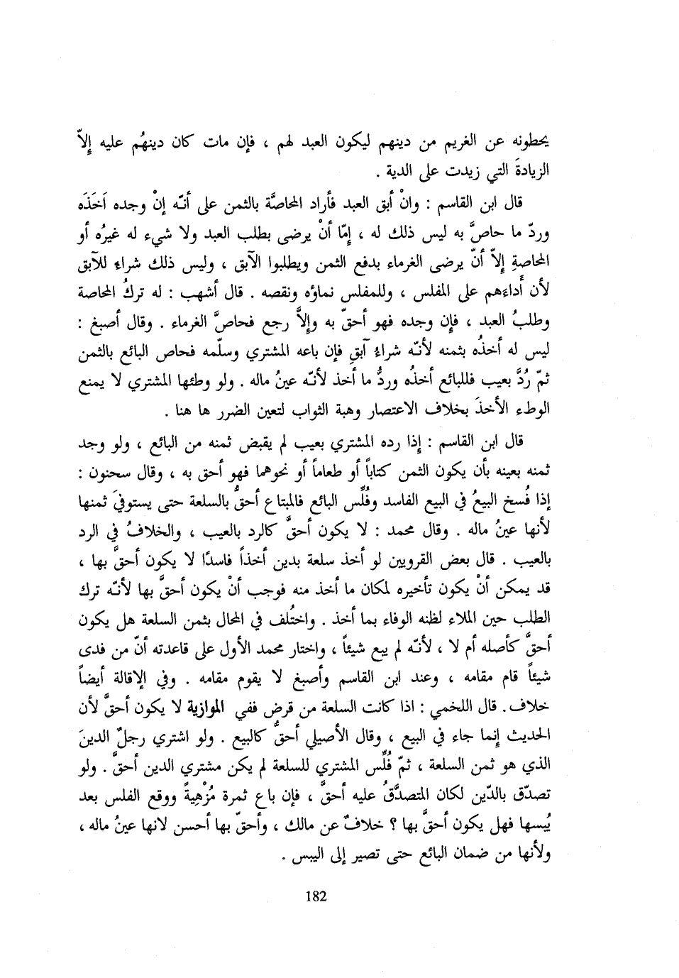 يَحُطُّونَهُ عَنِ الْغَرِيمِ مِنْ دَيْنِهِمْ لِيَكُونَ الْعَبْدُ لَهُمْ فَإِنْ مَاتَ كَانَ دينُهم عَلَيْهِ إِلَّا الزِّيَادَةَ الَّتِي زِيدَتْ عَلَى الدِّيَةِ قَالَ ابْنُ الْقَاسِمِ: وَإِنْ أَبَقَ الْعَبْدُ فَأَرَادَ المحاصَّة بِالثَّمَنِ عَلَى أَنَّهُ إِنْ وَجَدَهُ أَخَذَهُ وَرَدَّ مَا حاصَّ بِهِ لَيْسَ ذَلِكَ لَهُ إِمَّا أَنْ يَرْضَى بِطَلَبِ الْعَبْدِ وَلَا شَيْءَ لَهُ غَيْرُهُ أَوِ الْمُحَاصَّةِ إِلَّا أَنْ يَرْضَى الْغُرَمَاءُ بِدَفْعِ الثَّمَنِ وَيَطْلُبُوا الْآبِقَ وَلَيْسَ ذَلِكَ شِرَاءً لِلْآبِقِ لِأَن أداءهم على الْمُفلس وللمفلس نماؤه وَنقص قَالَ أَشْهَبُ: لَهُ تَرْكُ الْمُحَاصَّةِ وَطَلَبُ الْعَبْدِ فَإِنْ وَجَدَهُ فَهُوَ أَحَقُّ بِهِ وَإِلَّا رَجَعَ فحاصَّ الْغُرَمَاءَ وَقَالَ أَصْبَغُ: لَيْسَ لَهُ أَخْذُهُ بِثَمَنِهِ لِأَنَّهُ شراءُ آبِقٍ فَإِنْ بَاعَهُ الْمُشْتَرِي وَسَلَّمَهُ فَحَاصَّ الْبَائِعَ بِالثَّمَنِ ثُمَّ رُدَّ بِعَيْبٍ فَلِلْبَائِعِ أَخْذُهُ وردُّ مَا أَخَذَ لِأَنَّهُ عَيْنُ مَالِهِ وَلَوْ وَطِئَهَا الْمُشْتَرِي لَا يَمْنَعُ الْوَطْءُ الْأَخْذَ بِخِلَافِ الِاعْتِصَارِ وَهِبَةِ الثَّوَابِ لِتَعَيُّنِ الضَّرَرِ هَاهُنَا قَالَ ابْنُ الْقَاسِمِ: إِذَا رَدَّهُ الْمُشْتَرِي بِعَيْبٍ لَمْ يَقْبِضْ ثَمَنَهُ مِنَ الْبَائِعِ وَلَوْ وَجَدَ ثَمَنَهُ بِعَيْنِهِ بِأَنْ يَكُونَ الثَّمَنُ كِتَابًا أَوْ طَعَامًا أَوْ نَحْوَهُمَا فَهُوَ أَحَقُّ بِهِ وَقَالَ سُحْنُونٌ: إِذَا فُسخ الْبَيْعُ فِي الْبَيْعِ الْفَاسِد وفُلِّس البَائِع فالمتباع أحقُّ بِالسِّلْعَةِ حَتَّى يَسْتَوْفِيَ ثَمَنَهَا لِأَنَّهَا عَيْنُ مَالِهِ وَقَالَ مُحَمَّدٌ: لَا يَكُونُ أَحَقَّ كَالرَّدِّ بِالْعَيْبِ وَالْخِلَافِ فِي الرَّدِّ بِالْعَيْبِ قَالَ بَعْضُ الْقَرَوِيِّينَ لَوْ أَخَذَ سِلْعَةً بَدَيْنٍ أَخْذًا فَاسِدًا لَا يَكُونُ أحقُّ بِهَا قَدْ يُمْكِنُ أَنْ يَكُونَ تَأْخِيرُهُ لِمَكَانِ مَا أُخِذَ مِنْهُ فَوَجَبَ أَنْ يَكُونَ أحقَّ بِهَا لِأَنَّهُ تَرَكَ الطَّلَبَ حِينَ الْمَلَاءِ لِظَنِّهِ الْوَفَاءَ بِمَا أَخَذَ واختُلف فِي الْمَحَالِّ بِثَمَنِ السِّلْعَةِ هَلْ يَكُونُ أحقَّ كَأَصْلِهِ أَمْ لَا لِأَنَّهُ لَمْ يَبِعْ شَيْئًا وَاخْتَارَ مُحَمَّدٌ الْأَوَّلَ عَلَى قَاعِدَتِهِ أَنَّ مَنْ فَدَى شَيْئًا قَامَ مَقَامَهُ وَعِنْدَ ابْنِ الْقَاسِمِ وَأَصْبَغَ لَا يَقُومُ مَقَامَهُ وَفِي الْإِقَالَةِ أَيْضًا خِلَافٌ قَالَ اللَّخْمِيُّ: إِذَا كَانَتِ السِّلْعَةُ مِنْ قَرْضٍ فَفِي الْمَوَّازِيَّةِ لَا يَكُونُ أَحَقَّ لِأَنَّ الْحَدِيثَ إِنَّمَا جَاءَ فِي الْبَيْعِ وَقَالَ الْأَصِيلِيُّ أَحَقُّ كَالْبَيْعِ وَلَوِ اشْتَرَى رجلٌ الدَّيْنَ الَّذِي هُوَ ثَمَنُ السِّلْعَةِ ثُمَّ فُلِّس الْمُشْتَرِي لِلسِّلْعَةِ لَمْ يَكُنْ مُشْتَرِي الدَّيْنِ أَحَقَّ وَلَوْ تَصَدَّقَ بِالدَّيْنِ لَكَانَ الْمُتَصَدَّقُ عَلَيْهِ أَحَقَّ فَإِنْ بَاعَ ثَمَرَةً مُزْهِيَةً وَوَقَعَ الْفَلَسُ بَعْدَ يُبسها فَهَلْ يَكُونُ أَحَقَّ بِهَا؟ خلافٌ عَنْ مَالِكٍ وَأَحَقُّ بِهَا أَحْسَنُ لِأَنَّهَا عَيْنُ مَالِهِ وَلِأَنَّهَا ضَمَانُ الْبَائِعِ حَتَّى تَصِيرَ إِلَى الْيُبْسِ