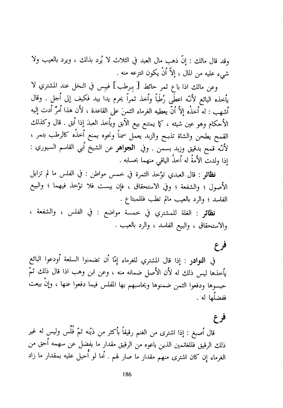 وَقَدْ قَالَ مَالِكٌ: إِنْ ذَهَبَ مَالُ الْعَبْدِ فِي الثَّلَاثِ لَا يُرَدُّ بِذَلِكَ وَيُرَدُّ بِالْعَيْبِ وَلَا شَيْءَ عَلَيْهِ مِنَ الْمَالِ إِلَّا أَنْ يَكُونَ انْتَزَعَهُ مِنْهُ وَعَنْ مَالِكٍ إِذَا بَاعَ ثَمَر حَائِطٍ [بِرُطَبٍ] فَيَبِسَ فِي النَّخْلِ عِنْدَ الْمُشْتَرِي لَا يَأْخُذُهُ الْبَائِعُ لِأَنَّهُ أَعْطَى رُطَبًا وَأَخَذَ ثمراً يُحَرَّمُ يَدًا بِيَدٍ فَكَيْفَ إِلَى أَجَلٍ وَقَالَ أَشْهَبُ: لَهُ أُخْذُهُ إِلَّا أَنْ يُعْطِيَهُ الْغُرَمَاءُ الثَّمَنَ عَلَى الْقَاعِدَةِ لِأَنَّ هَذَا أَمْرٌ أَدَّتْ إِلَيْهِ الْأَحْكَامُ وَهُوَ عَيْنُ شَيْئِهِ كَمَا يَمْتَنِعُ بَيْعُ الْآبِقِ وَيَأْخُذُ الْعَبْدَ إِذَا أَبَقَ قَالَ وَكَذَلِكَ الْقَمْحُ يُطْحَنُ وَالشَّاةُ تُذْبَحُ وَالزُّبْدُ يُعْمَلُ سَمْنًا وَنَحْوُهُ يُمْنَعُ أَخْذُهُ كَالرُّطَبِ بِتَمْرٍ لِأَنَّهُ قَمْحٌ بِدَقِيقٍ وَزُبْدٌ بِسَمْنٍ وَفِي الْجَوَاهِرِ عَنِ الشَّيْخِ أَبِي الْقَاسِمِ السُّيُورِيِّ: إِذَا وَلَدَتِ الْأَمَةُ لَهُ أَخْذُ الْبَاقِي مِنْهُمَا بِحِسَابِهِ نَظَائِرُ: قَالَ الْعَبْدِيُّ تُؤْخَذُ الثَّمَرَةُ فِي خَمْسِ مَوَاطِنَ: فِي الْفَلَسِ مَا لَمْ تُزَايِلِ الْأُصُولَ وَالشُّفْعَةِ وَفِي الِاسْتِحْقَاقِ فَإِنْ يَبِسَتْ فَلَا تُؤْخَذُ فِيهِمَا وَالْبَيْعِ الْفَاسِد وَالرَّدّ بِالْعَيْبِ مَا لم تطلب للْمُبْتَاع نَظَائِرُ: الْغَلَّةُ لِلْمُشْتَرِي فِي خَمْسَةِ مَوَاضِعَ: فِي الْفَلَسِ وَالشُّفْعَةِ وَالِاسْتِحْقَاقِ وَالْبَيْعِ الْفَاسِدِ وَالرَّدِّ بِالْعَيْبِ