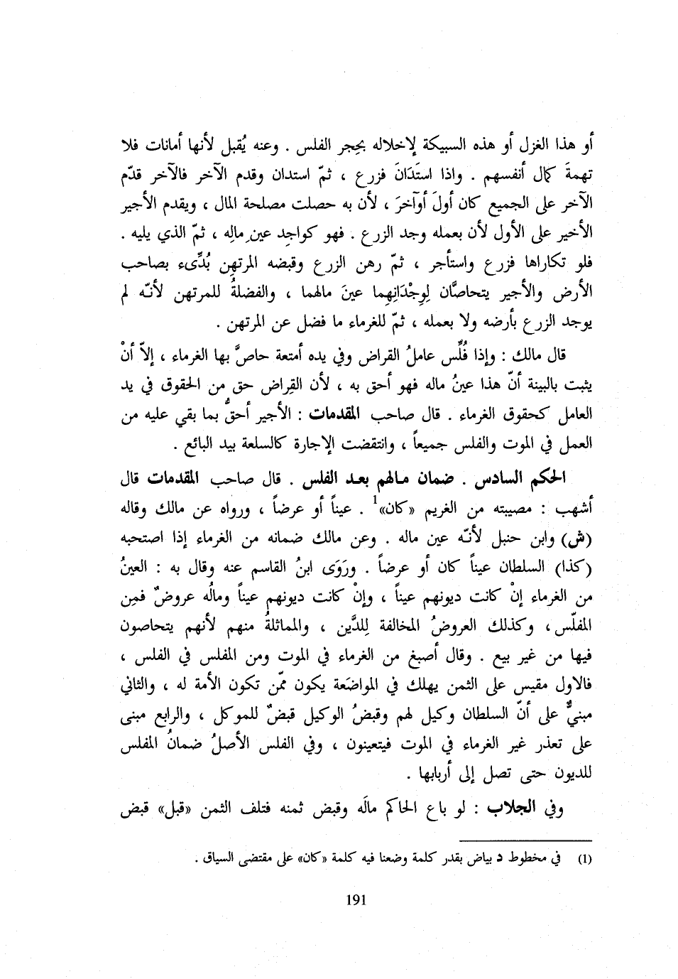 أَوْ هَذَا الْغَزْلَ أَوْ هَذِهِ السَّبِيكَةَ لِإِخْلَالِهِ بحِجر الْفَلَسِ وَعَنْهُ يُقبل لِأَنَّهَا أَمَانَاتٌ فَلَا تُهْمَةَ كَمَالِ أَنْفُسِهِمْ وَإِذَا استَدان فَزَرَعَ ثُمَّ اسْتَدَانَ وَقَدِمَ الْآخَرُ فَالْآخَرُ قِدَمَ الْآخَرُ عَلَى الْجَمِيع كَانَ أول أَوَاخِر لِأَنَّ بِهِ حَصَلَتْ مَصْلَحَةُ الْمَالِ وَيُقَدَّمُ الْأَجِيرُ الْأَخِيرُ عَلَى الْأَوَّلِ لِأَنَّ بِعَمَلِهِ وُجِدَ الزَّرْعُ فَهُوَ كَوَاجِدِ عَيْنِ مَالِهِ ثُمَّ الَّذِي يَلِيهِ فَلَوْ تَكَارَاهَا فَزَرَعَ وَاسْتَأْجَرَ ثُمَّ رَهَنَ الزَّرْعَ وَقَبَضَهُ المرتَهِن بُدِّئ بِصَاحِبِ الْأَرْضِ وَالْأَجِيرِ يَتَحَاصَّانِ لِوِجْدَانِهِمَا عَيْنَ مَالِهِمَا وَالْفَضْلَةُ لِلْمُرْتَهِنِ لِأَنَّهُ لَمْ يُوجد الرزع بِأَرْضِهِ وَلَا بِعَمَلِهِ ثُمَّ لِلْغُرَمَاءِ مَا فَضَلَ عَنِ الْمُرْتَهِنِ قَالَ مَالِكٌ: وَإِذَا فُلِّس عاملُ الْقِرَاضِ وَفِي يَدِهِ أَمْتِعَةٌ حاصَّ بِهَا الْغُرَمَاءُ إِلَّا أَنْ يُثْبِتَ بِالْبَيِّنَةِ أَنَّ هَذَا عَيْنُ مَالِهِ فَهُوَ أَحَقُّ بِهِ لِأَنَّ الْقِرَاضَ حَقٌّ مِنَ الْحُقُوقِ فِي يَدِ الْعَامِلِ كَحُقُوقِ الْغُرَمَاءِ قَالَ صَاحِبُ الْمُقَدِّمَاتِ: الْأَجِيرُ أحقُّ بِمَا بَقِيَ عَلَيْهِ مِنَ الْعَمَلِ فِي الْمَوْتِ وَالْفَلَسِ جَمِيعًا وَانْتَقَضَتِ الْإِجَارَةُ كَالسِّلْعَةِ بِيَدِ الْبَائِعِ الْحُكْمُ السَّادِسُ ضَمَانُ مَالِهِمْ بَعْدَ الْفَلَسِ قَالَ صَاحِبُ الْمُقَدِّمَاتِ قَالَ أَشْهَبُ: مُصِيبَتُهُ مِنَ الْغَرِيمِ " كَانَ " عَيْنًا أَوْ عَرَضًا وَرَوَاهُ عَنْ مَالِكٍ وَقَالَهُ (ش) وَابْنُ حَنْبَلٍ لِأَنَّهُ عَيْنُ مَالِهِ وَعَنْ مَالِكٍ ضَمَانه من الْغُرَمَاء إِذا اصتحبه (كَذَا) السُّلْطَان عينا كَانَ أَو عرضا وروى ابْنُ الْقَاسِمِ عَنْهُ وَقَالَ بِهِ: الْعَيْنُ مِنَ الْغُرَمَاءِ إِنْ كَانَتْ دُيُونُهُمْ عَيْنًا وَإِنْ كَانَتْ دُيُونُهُمْ عَيْنًا وَمَالُهُ عَرُوضٌ فَمِنَ الْمُفَلَّسِ وَكَذَلِكَ الْعُرُوضُ الْمُخَالِفَةُ للدَّين وَالْمُمَاثِلَةُ مِنْهُمْ لِأَنَّهُمْ يَتَحَاصُّونَ فِيهَا مِنْ غَيْرِ بَيْعٍ وَقَالَ أَصْبَغُ مِنَ الْغُرَمَاءِ فِي الْمَوْتِ وَمِنَ الْمُفَلَّسِ فِي الْفَلَسِ فَالْأَوَّلُ مَقِيسٌ عَلَى الثَّمَنِ يَهْلِكُ فِي الْمُوَاضَعَةِ يَكُونُ مِمَّنْ تَكُونُ الْأَمَةُ لَهُ وَالثَّانِي مبنيُّ عَلَى أَنَّ السُّلْطَانَ وَكِيلٌ لَهُمْ وَقَبْضُ الْوَكِيلِ قبضٌ لِلْمُوَكِّلِ وَالرَّابِعُ مَبْنِيٌّ عَلَى تَعَذُّرِ غَيْرِ لغرماء فِي الْمَوْتِ فَيَتَعَيَّنُونَ وَفِي الْفَلَسِ الْأَصْلُ ضَمَانُ الْمُفَلَّسِ لِلدُّيُونِ حَتَّى تَصِلَ إِلَى أَرْبَابِهَا وَفِي الْجُلَّابِ: لَوْ بَاعَ الْحَاكِمُ مَالَهُ وَقَبَضَ ثَمَنَهُ فَتَلِفَ الثَّمَنُ " قَبْلَ " قَبْضِ