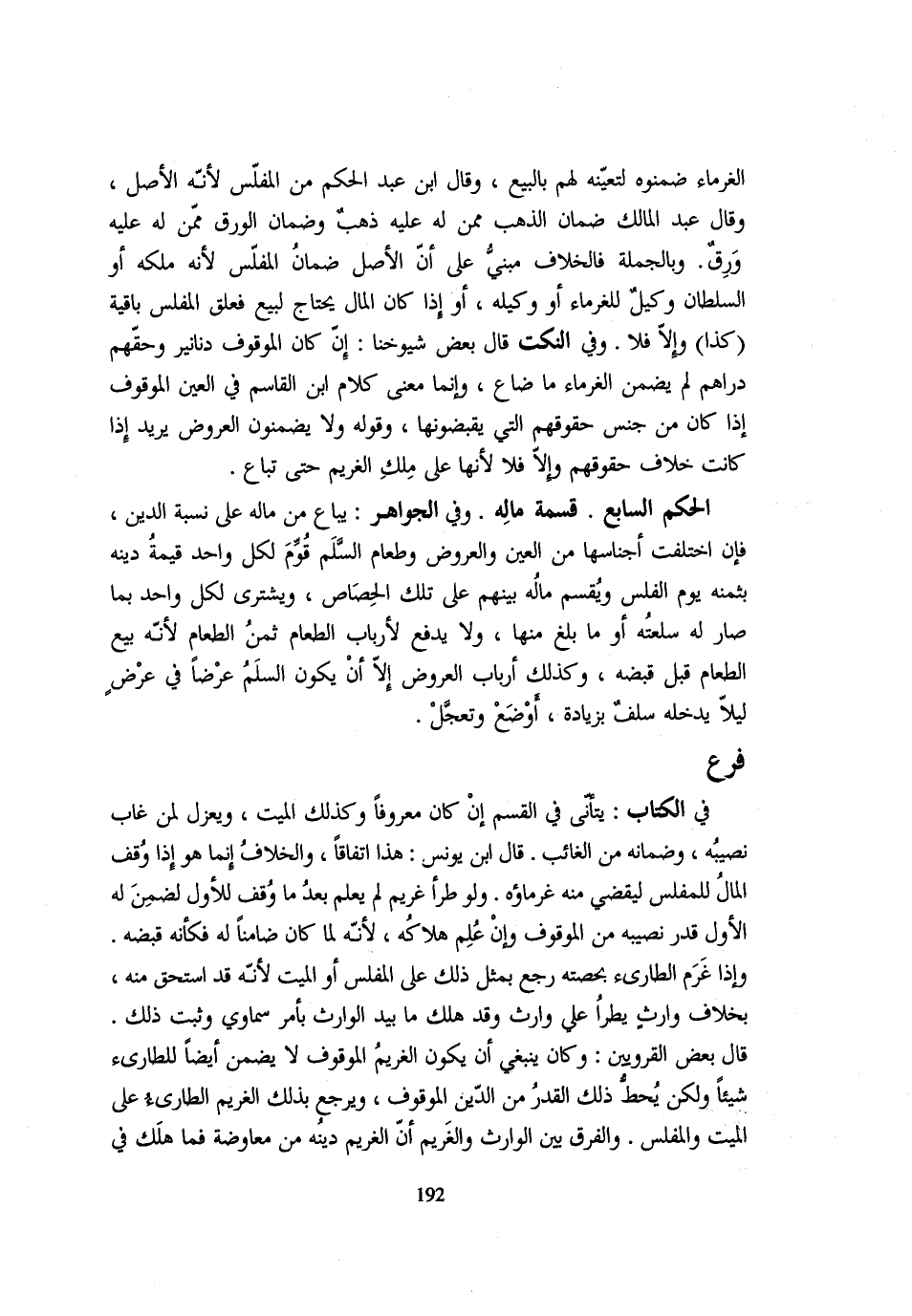 الْغُرَمَاءِ ضَمِنُوهُ لِتَعَيُّنِهِ لَهُمْ بِالْبَيْعِ وَقَالَ ابْنُ عَبْدِ الْحَكَمِ مِنَ الْمُفَلَّسِ لِأَنَّهُ الْأَصْلُ وَقَالَ عبد الْمَالِك ضَمَانُ الذَّهَبِ مِمَّنْ لَهُ عَلَيْهِ ذهبٌ وَضَمَانُ الْوَرِقِ مِمَّنْ لَهُ عَلَيْهِ وَرِقٌ وَبِالْجُمْلَةِ فَالْخِلَافُ مبنيُّ عَلَى أَنَّ الْأَصْلَ ضمانُ الْمُفَلَّسِ لِأَنَّهُ مِلْكُهُ أَوِ السُّلْطَانُ وكيلٌ لِلْغُرَمَاءِ أَوْ وَكِيلُهُ أَو إِذا كَانَ المَال يحْتَاج لبيع فعلق الْمُفلس بَاقِيَة (كَذَا) وَإِلَّا فَلَا وَفِي النكث قَالَ بَعْضُ شُيُوخِنَا: إِنْ كَانَ الْمَوْقُوفُ دَنَانِيرَ وَحَقُّهُمْ دَرَاهِمُ لَمْ يَضْمَنِ الْغُرَمَاءُ مَا ضَاعَ وَإِنَّمَا مَعْنَى كَلَامِ ابْنِ الْقَاسِمِ فِي الْعَيْنِ الْمَوْقُوفِ إِذَا كَانَ مِنْ جِنْسِ حُقُوقِهِمُ الَّتِي يَقْبِضُونَهَا وَقَوْلُهُ وَلَا يَضْمَنُونَ الْعُرُوضَ يُرِيدُ إِذَا كَانَتْ خِلَافَ حُقُوقِهِمْ وَإِلَّا فَلَا لِأَنَّهَا عَلَى مِلك الْغَرِيمِ حَتَّى تُبَاعَ الْحُكْمُ السَّابِعُ قِسْمَةُ مَالِهِ وَفِي الْجَوَاهِرِ: يُبَاعُ مِنْ مَالِهِ عَلَى نِسْبَةِ الدَّيْنِ فَإِنِ اخْتَلَفَتْ أَجْنَاسُهَا مِنَ الْعَيْنِ وَالْعَرُوضِ وَطَعَامِ السَّلَم قُوِّمَ لِكُلِّ وَاحِدٍ قِيمَةُ دَيْنِهِ بِثَمَنِهِ يَوْمَ الْفَلَسِ ويُقسم مَالُهُ بَيْنَهُمْ عَلَى تِلْكَ الحِصاص وَيَشْتَرِي لِكُلِّ وَاحِدٍ بِمَا صَارَ لَهُ سلعتُه أَوْ مَا بَلَغَ مِنْهَا وَلَا يَدْفَعُ لِأَرْبَابِ الطَّعَامِ ثَمَنَ الطَّعَامِ لِأَنَّهُ بَيْعُ الطَّعَامِ قَبْلَ قَبْضِهِ وَكَذَلِكَ أَرْبَابُ الْعُرُوضِ إِلَّا أَنْ يَكُونَ السلَم عَرَضًا فِي عرضِ ليلاّ يدْخل سلفُ بِزِيَادَة أوضع وتعجَّل