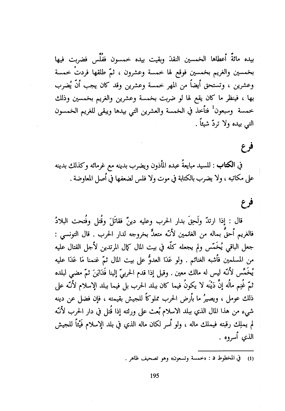 قَالَ إِذَا ارْتَدَّ ولحِقَ بِدَارِ الْحَرْبِ وَعَلَيْهِ دينٌ فقاتَل وقُتل وفُتحت الْبِلَادُ فَالْغَرِيمُ أحقُّ بِمَالِهِ مِنَ الْغَانِمِينَ لِأَنَّهُ متعدٍّ بِخُرُوجِهِ لِدَارِ الْحَرْبِ قَالَ التُّونُسِيُّ: جَعَلَ الْبَاقِيَ يُخَمّس وَلَمْ يَجْعَلْهُ كُلَّهُ فِي بَيْتِ الْمَالِ كَمَالِ الْمُرْتَدِّينَ لِأَجْلِ الْقِتَالِ عَلَيْهِ مِنَ الْمُسْلِمِينَ فَأَشْبَهَ الْغَنَائِمَ وَلَوْ عَدَا الْعَدُوُّ عَلَى بَيْتِ الْمَالِ ثُمَّ غَنِمْنَا مَا عَدَا عَلَيْهِ يُخَمّس لِأَنَّهُ لَيْسَ لَهُ مَالِكٌ مُعَيَّنٌ وَقِيلَ إِذَا قَدِمَ الْحَرْبِيُّ إِلَيْنَا فداينَ ثُمَّ مَضَى لِبَلَدِهِ ثُمَّ غُنم مَالُهُ إنَّ دَينه لَا يَكُونُ فِيمَا كَانَ بِبَلَدِ الْحَرْبِ بَلْ فِيمَا بِبَلَدِ الْإِسْلَامِ لِأَنَّهُ عَلَى ذَلِكَ عُومِلَ وَيَصِيرُ مَا بِأَرْضِ الْحَرْبِ مَمْلُوكًا لِلْجَيْشِ بِقِيمَتِهِ فَإِنْ فَضَلَ عَنْ دَيْنِهِ شَيْءٌ مِنْ هَذَا الْمَالِ الَّذِي بِبَلَدِ الْإِسْلَامِ بُعث عَلَى وَرَثَتِهِ إِذَا قُتل فِي دَارِ الْحَرْبِ لِأَنَّهُ لَمْ يَمْلِكْ رَقَبَتَهُ فَيَمْلِكَ مَالَهُ وَلَوْ أُسِرَ لَكَانَ مَالُهُ الَّذِي فِي بلد الْإِسْلَام فَيْئا للجيش الَّذِي أسروه