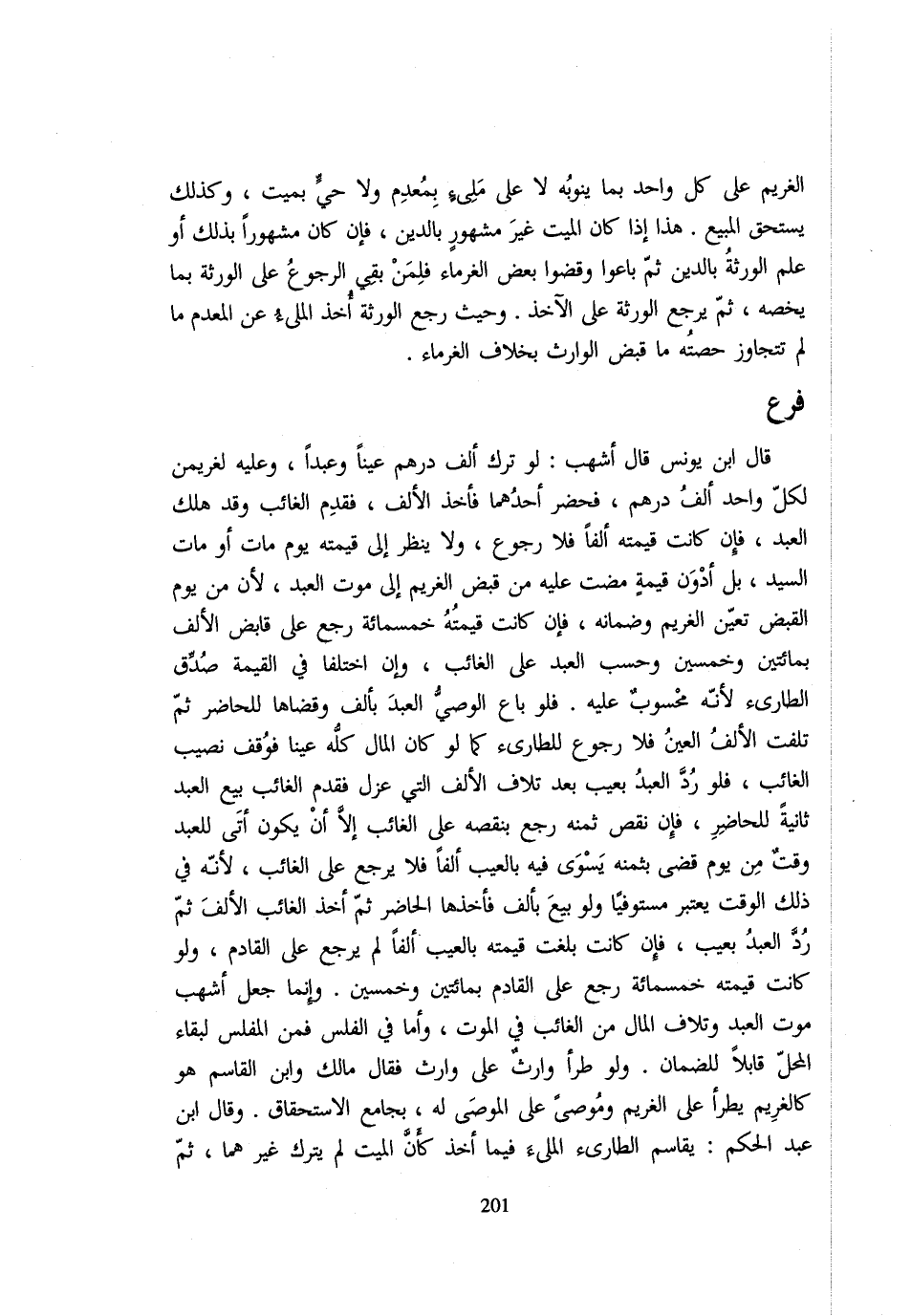 قَالَ ابْنُ يُونُسَ قَالَ أَشْهَبُ: لَوْ تَرَكَ أَلْفَ دِرْهَمٍ عَيْنًا وَعَبْدًا وَعَلَيْهِ لِغَرِيمَيْنِ لِكُلِّ وَاحِدٍ أَلْفُ دِرْهَمٍ فَحَضَرَ أحدُهما فَأَخَذَ الْأَلْفَ فَقَدِمَ الْغَائِبُ وَقَدْ هَلَكَ الْعَبْدُ فَإِنْ كَانَتْ قِيمَتُهُ أَلْفًا فَلَا رُجُوعَ وَلَا يُنْظَرُ إِلَى قِيمَتِهِ يَوْمَ مَاتَ أَوْ مَاتَ السَّيِّدُ بَلْ أدوَن قيمةٍ مَضَتْ عَلَيْهِ مِنْ قَبْضِ الْغَرِيمِ إِلَى مَوْتِ الْعَبْدِ لِأَنَّ مِنْ يَوْمِ الْقَبْضِ تَعَيَّنَ الْغَرِيمُ وَضَمَانُهُ فَإِنْ كَانَتْ قيمتُه خَمْسَمِائَةٍ رَجَعَ عَلَى قَابِضِ الْأَلْفِ بِمِائَتَيْنِ وَخَمْسِينَ وَحُسِبَ الْعَبْدُ عَلَى الْغَائِبِ وَإِنِ اخْتَلَفَا فِي الْقِيمَةِ صُدِّق الطَّارِئُ لِأَنَّهُ مَحْسُوبٌ عَلَيْهِ فَلَوْ بَاعَ الوصيُّ الْعَبْدَ بِأَلْفٍ وَقَضَاهَا لِلْحَاضِرِ ثُمَّ تَلِفَتِ الْأَلْفُ الْعَيْنُ فَلَا رُجُوعَ لِلطَّارِئِ كَمَا لَوْ كَانَ الْمَالُ كُلُّهُ عَيْنًا فَوَقَفَ نَصِيبُ الْغَائِبِ فَلَوْ رُدَّ العبدُ بِعَيْب بعد تلاف الْأَلِفِ الَّتِي عَزَلَ فَقَدِمَ الْغَائِبُ بِيعَ الْعَبْدُ ثَانِيَةً لِلْحَاضِرِ فَإِنْ نَقَصَ ثَمَنُهُ رَجَعَ بِنَقْصِهِ عَلَى الْغَائِبِ إِلَّا أَنْ يَكُونَ أَتَى لِلْعَبْدِ وقتٌ مِنْ يَوْمِ قَضَى بِثَمَنِهِ يَسْوِي فِيهِ بِالْعَيْبِ أَلْفًا فَلَا يَرْجِعُ عَلَى الْغَائِبِ لِأَنَّهُ فِي ذَلِكَ الْوَقْتِ يُعْتَبَرُ مُسْتَوْفِيًا وَلَوْ بِيعَ بِأَلْفٍ فَأَخَذَهَا الْحَاضِرُ ثُمَّ أَخَذَ الْغَائِبُ الْأَلْفَ ثُمَّ رُدّ الْعَبْدُ بِعَيْبٍ فَإِنْ كَانَتْ بَلَغَتْ قِيمَتُهُ بِالْعَيْبِ أَلْفًا لَمْ يَرْجِعْ عَلَى الْقَادِمِ وَلَوْ كَانَتْ قِيمَتُهُ خَمْسَمِائَةٍ رَجَعَ عَلَى الْقَادِمِ بِمِائَتَيْنِ وَخَمْسِينَ وَإِنَّمَا جَعَلَ أَشْهَبُ مَوْتَ الْعَبْدِ وتلاف الْمَالِ مِنَ الْغَائِبِ فِي الْمَوْتِ وَأَمَّا فِي الْفَلَسِ فَمِنَ الْمُفَلَّسِ لِبَقَاءِ الْمَحَلِّ قَابِلًا لِلضَّمَانِ وَلَوْ طَرَأَ وَارِثٌ عَلَى وَارِثٍ فَقَالَ مَالِكٌ وَابْنُ الْقَاسِمِ هُوَ كَالْغَرِيمِ يَطْرَأُ عَلَى الْغَرِيمِ وموصىً على الْمُوصَى لَهُ بِجَامِعِ الِاسْتِحْقَاقِ وَقَالَ ابْنُ عبد الحكم: يقاسم الطَّارِئ الملئ فِيمَا أَخَذَ كَأَنَّ الْمَيِّتَ لَمْ يَتْرُكْ غَيْرَهُمَا ثمَّ