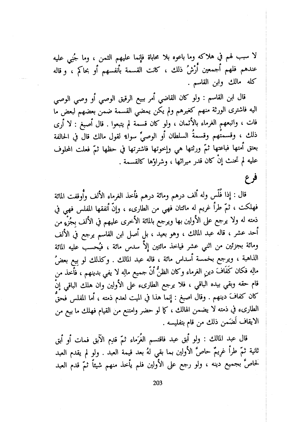 قَالَ: إِذَا فُلِّسَ وَلَهُ أَلْفُ دِرْهَمٍ وَمِائَةُ دِرْهَمٍ فَأَخَذَ الْغُرَمَاءُ الْأَلْفَ وَأُوقِفَتِ الْمِائَةُ فَهَلَكَتْ ثُمَّ طَرَأَ غَرِيمٌ لَهُ مِائَتَانِ فَهِيَ مِنَ الطَّارِئِ وَإِنْ أَنْفَقَهَا الْمُفَلَّسُ فَهِيَ فِي ذِمَّتِهِ لَهُ وَلَا يَرْجِعُ عَلَى الْأَوَّلِينَ بِهَا وَيَرْجِعُ بِالْمِائَةِ الْأُخْرَى عَلَيْهِمْ فِي الْأَلْفِ بِجُزْءٍ مِنْ أَحَدَ عَشَرَ قَالَهُ عبد الْمَالِك وَهُوَ بَعِيدٌ بَلْ أَصْلُ ابْنِ الْقَاسِمِ يَرْجِعُ فِي الْألف وَمِائَة بجزئين مِنِ اثْنَيْ عَشَرَ فَيَأْخُذُ مِائَتَيْنِ إِلَّا سُدُسَ مِائَةٍ فَيُحْسَبُ عَلَيْهِ الْمِائَةُ الذَّاهِبَةُ وَيَرْجِعُ بِخَمْسَةِ أَسْدَاس مائَة قَالَه عبد الْمَالِك وَكَذَلِكَ لَوْ بِيعَ بَعْضُ مَالِهِ فَكَانَ كَفَافَ دَيْنِ الْغُرَمَاءِ وَكَانَ الظَّنُّ أَنَّ جَمِيعَ مَالِهِ لَا يَفِي بِدَيْنِهِمْ فَأُخِذَ مَنْ قَامَ حَقُّهُ وَبَقِيَ بِيَدِهِ الْبَاقِي فَلَا يَرْجِعُ الطَّارِئُ عَلَى الْأَوَّلِينَ وَإِنْ هَلَكَ الْبَاقِي إِنْ كَانَ كَفَافَ دَيْنِهِمْ وَقَالَ أَصْبَغُ: إِنَّمَا هَذَا فِي الْمَيِّتِ لِعَدَمِ ذِمَّتِهِ أَمَّا الْمُفَلَّسُ فَحَقُّ الطَّارِئِ فِي ذِمَّتِهِ لَا يَضْمَنُ الْهَالِكَ كَمَا لَوْ حَضَرَ وَامْتَنَعَ مِنَ الْقِيَامِ فَهَلَكَ مَا بِيعَ مِنَ الْإِيقَافِ لَضَمِنَ ذَلِكَ مَنْ قَامَ بِتَفْلِيسِهِ قَالَ عَبْدُ الْمَلِكِ: وَلَوْ أَبَقَ عَبْدٌ فَاقْتَسَمَ الْغُرَمَاءُ ثُمَّ قَدِمَ الْآبِقُ فَمَاتَ أَوْ أَبَقَ ثَانِيَةً ثُمَّ طَرَأَ غَرِيمٌ حَاصَّ الْأَوَّلِينَ بِمَا بَقِيَ لَهُ بَعْدَ قِيمَةِ الْعَبْدِ وَلَوْ لَمْ يَقْدَمِ الْعَبْدُ لَحَاصَّ بِجَمِيعِ دَيْنِهِ وَلَوْ رَجَعَ عَلَى الْأَوَّلِينَ فَلَمْ يَأْخُذْ مِنْهُمْ شَيْئًا ثُمَّ قَدِمَ العَبْد
