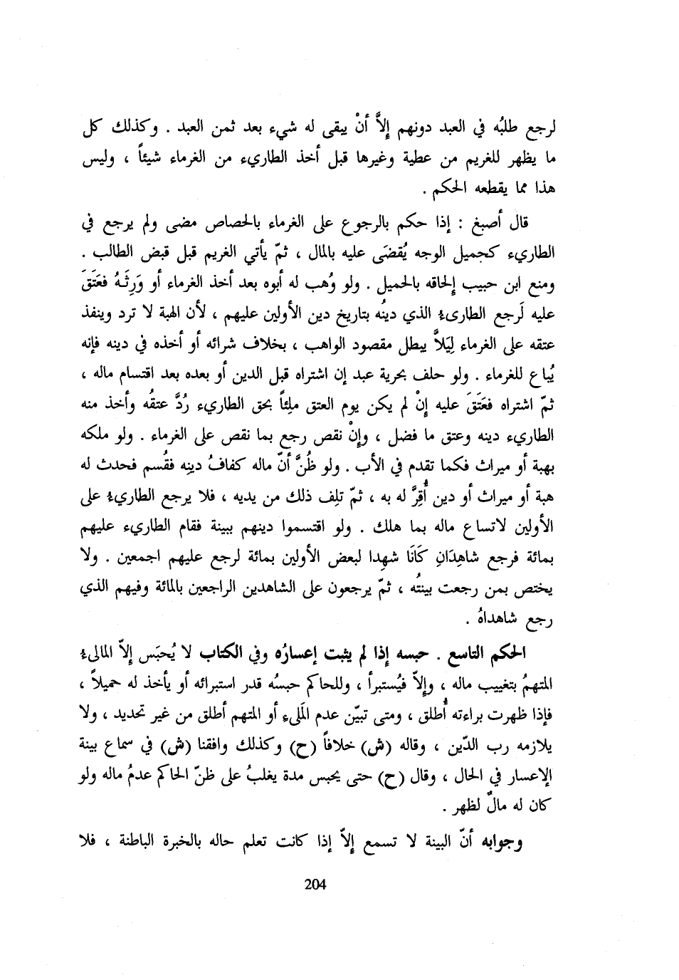 لَرَجَعَ طَلَبُهُ فِي الْعَبْدِ دُونَهُمْ إِلَّا أَنْ يَبْقَى لَهُ شَيْءٌ بَعْدَ ثَمَنِ الْعَبْدِ وَكَذَلِكَ كُلُّ مَا يَظْهَرُ لِلْغَرِيمِ مِنْ عَطِيَّةٍ وَغَيْرِهَا قَبْلَ أَخْذِ الطَّارِئِ مِنَ الْغُرَمَاءِ شَيْئًا وَلَيْسَ هَذَا مِمَّا يَقْطَعُهُ الْحُكْمُ قَالَ أَصْبَغُ: إِذَا حَكَمَ بِالرُّجُوعِ عَلَى الْغُرَمَاءِ بِالْحِصَاصِ مَضَى وَلَمْ يرجع فِي الطَّارِئ كجميل الْوَجْهِ يُقْضَى عَلَيْهِ بِالْمَالِ ثُمَّ يَأْتِي الْغَرِيمُ قَبْلَ قَبْضِ الطَّالِبِ وَمَنَعَ ابْنُ حَبِيبٍ إِلْحَاقَهُ بِالْحَمِيلِ وَلَوْ وَهَبَ لَهُ أَبُوهُ بَعْدَ أَخْذِ الْغُرَمَاءِ أَوْ وَرِثَهُ فَعُتِقَ عَلَيْهِ لَرَجَعَ الطَّارِئُ الَّذِي دَيْنُهُ بِتَارِيخِ دَيْنِ الْأَوَّلِينَ عَلَيْهِمْ لِأَنَّ الْهِبَةَ لَا تُرَدُّ وَيُنَفَّذُ عِتْقُهُ عَلَى الْغُرَمَاءِ لَيْلًا يَبْطُلَ مَقْصُودُ الْوَاهِبِ بِخِلَافِ شِرَائِهِ أَوْ أَخْذِهِ فِي دَيْنِهِ فَإِنَّهُ يُبَاعُ لِلْغُرَمَاءِ وَلَوْ حَلَفَ بِحُرِّيَّةِ عَبْدٍ إِنِ اشْتَرَاهُ قَبْلَ الدَّيْنِ أَوْ بعده بعد اقْتِسَامِ مَالِهِ ثُمَّ اشْتَرَاهُ فَعُتِقَ عَلَيْهِ إِنْ لم يكن يَوْم الْعتْق ملئاً بِحَقِّ الطَّارِئِ رُدَّ عِتْقُهُ وَأَخَذَ مِنْهُ الطَّارِئُ دَيْنَهُ وَعُتِقَ مَا فَضَلَ وَإِنْ نَقَصَ رَجَعَ بِمَا نَقَصَ عَلَى الْغُرَمَاءِ وَلَوْ مَلَكَهُ بِهِبَةٍ أَوْ مِيرَاثٍ فَكَمَا تَقَدَّمَ فِي الْأَبِ وَلَوْ ظَنَّ أَنَّ مَالَهُ كَفَافُ دَيْنِهِ فَقَسَّمَ فَحَدَثَ لَهُ هِبَةٌ أَوْ مِيرَاثٌ أَوْ دَيْنٌ أَقَرَّ لَهُ بِهِ ثُمَّ تَلِفَ ذَلِكَ مِنْ يَدَيْهِ فَلَا يَرْجِعُ الطَّارِئُ عَلَى الْأَوَّلِينَ لِاتِّسَاعِ مَالِهِ بِمَا هَلَكَ وَلَوِ اقْتَسَمُوا دَيْنَهُمْ بِبَيِّنَةٍ فَقَامَ الطَّارِئُ عَلَيْهِمْ بِمِائَةٍ فَرَجَعَ شَاهِدَانِ كَانَا شَهِدَا لِبَعْضِ الْأَوَّلِينَ بِمِائَةٍ لَرَجَعَ عَلَيْهِمْ أَجْمَعِينَ وَلَا يَخْتَصُّ بِمَنْ رَجَعَتْ بَيِّنَتُهُ ثُمَّ يَرْجِعُونَ عَلَى الشَّاهِدَيْنِ الرَّاجِعَيْنِ بِالْمِائَةِ وَفِيهِمُ الَّذِي رَجَعَ شَاهِدَاهُ الْحُكْمُ التَّاسِعُ حَبْسُهُ إِذَا لَمْ يَثْبُتْ إِعْسَارُهُ وَفِي الْكتاب لَا يحبس إِلَّا المالئ الْمُتَّهَمُ بِتَغْيِيبِ مَالِهِ وَإِلَّا فَيُسْتَبْرَأُ وَلِلْحَاكِمِ حَبْسُهُ قَدْرَ اسْتِبْرَائِهِ أَوْ يَأْخُذُ لَهُ حَمِيلًا فَإِذَا ظَهرت بَرَاءَته أطلق وَمَتى تبين عدم الملئ أَوِ الْمُتَّهَمِ أُطْلِقَ مِنْ غَيْرِ تَحْدِيدٍ وَلَا يلازمه رب الدّين وَقَالَهُ (ش) خلافًا (ح) وَكَذَلِكَ وَافَقَنَا (ش) فِي سَمَاعِ بَيِّنَةِ الْإِعْسَارِ فِي الْحَالِ وَقَالَ (ح) حَتَّى يُحْبَسَ مُدَّةً يَغْلِبُ عَلَى ظَنِّ الْحَاكِمِ عَدَمُ مَالِهِ وَلَوْ كَانَ لَهُ مَالٌ لَظَهَرَ وَجَوَابُهُ أَنَّ الْبَيِّنَةَ لَا تُسْمَعُ إِلَّا إِذَا كَانَ تُعْلَمُ حَالُهُ بِالْخِبْرَةِ الْبَاطِنَةِ فَلَا