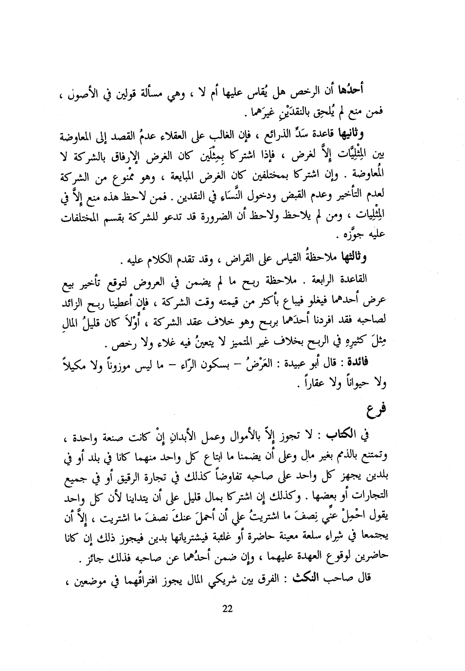 فِي الْكِتَابِ لَا تَجُوزُ إِلَّا بِالْأَمْوَالِ وَعَمَلِ الْأَبْدَانِ إِنْ كَانَت صَنْعَة وَاحِدَة وتمتنع بِالذِّمَمِ بِغَيْرِ مَالٍ وَعَلَى أَنْ يَضْمَنَا مَا ابْتَاعَ كُلُّ وَاحِدٍ مِنْهُمَا كَانَا فِي بَلَدٍ أَوْ فِي بَلَدَيْنِ يُجْهِزُ كُلُّ وَاحِدٍ عَلَى صَاحِبِهِ تَفَاوُضًا كَذَلِكَ فِي تِجَارَةِ الرَّقِيقِ أَوْ فِي جَمِيع التِّجَارَات أَو بعضهما. وَكَذَلِكَ إِنِ اشْتَرَكَا بِمَالٍ قَلِيلٍ عَلَى أَنْ يَتَدَايَنَا لِأَنَّ كُلَّ وَاحِدٍ يَقُولُ احْمِلْ عَنِّي نِصْفَ مَا اشْتَرَيْتُ عَلَى أَنْ أَحْمِلَ عَنْكَ نِصْفَ مَا اشْتَرَيْتَ إِلَّا أَنْ يَجْتَمِعَا فِي شِرَاء سلْعَة مُعينَة حَاضِرَة أَو علئبة فَيَشْتَرِيَانِهَا بِدَيْنٍ فَيَجُوزُ ذَلِكَ إِنْ كَانَا حَاضِرَيْنِ لِوُقُوعِ الْعُهْدَةِ عَلَيْهِمَا وَإِنْ ضَمِنَ أحدُهما عَنْ صَاحبه فَذَلِك جَائِز قَالَ صَاحب النكث: الْفَرْقُ بَيْنَ شَرِيكَيِ الْمَالِ يَجُوزُ افْتِرَاقُهُمَا فِي موضِعين