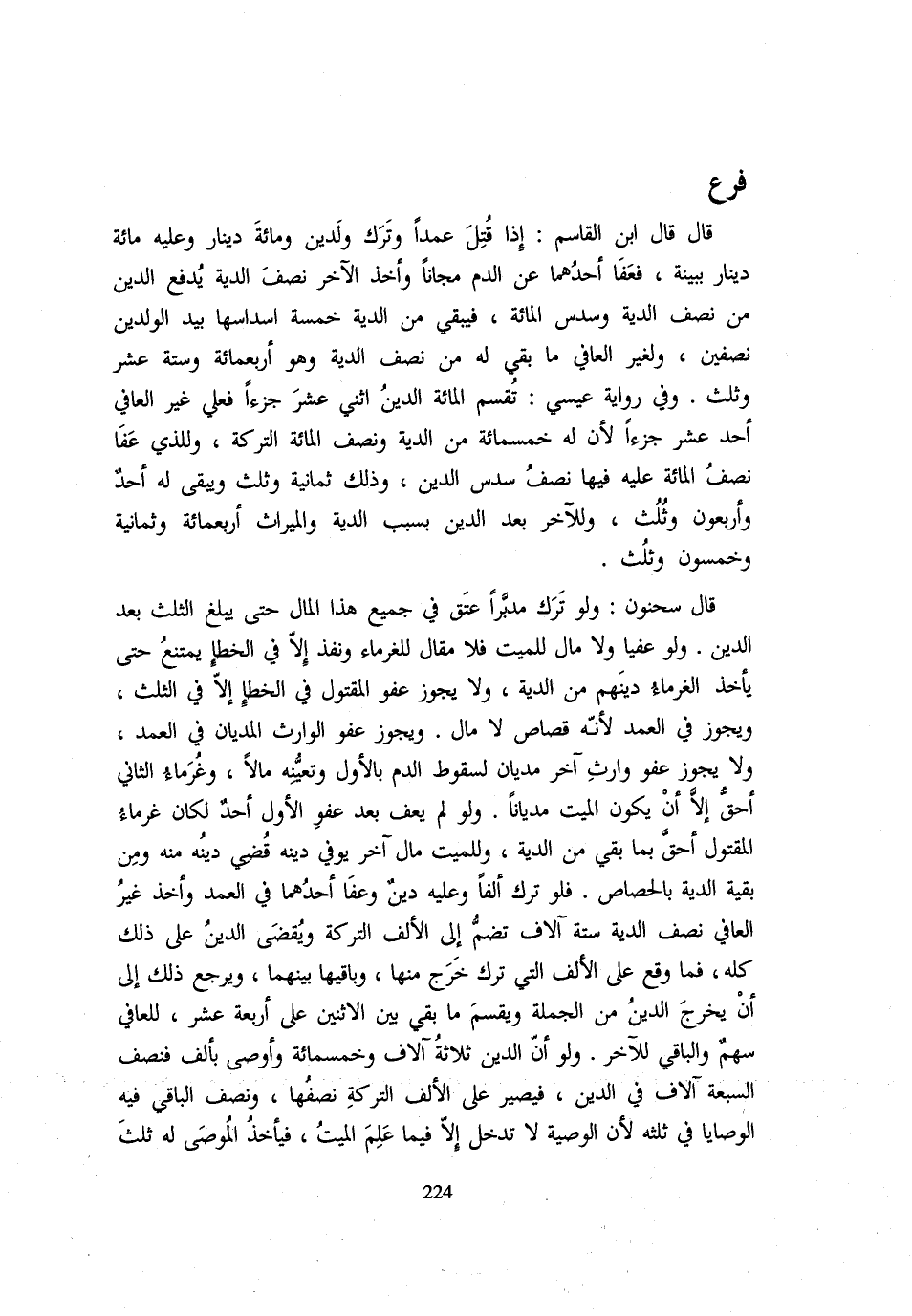 قَالَ: قَالَ ابْن الْقَاسِم: إِذا قُتِل عَمْدًا وتَرك وَلَدَيْنِ وَمِائَةَ دِينَارٍ وَعَلَيْهِ مِائَةُ دِينَارٍ بِبَيِّنَةٍ فَعَفَا أحدُهما عَنِ الدَّمِ مَجَّانًا وَأَخَذَ الْآخَرُ نِصْفَ الدِّيَةِ يُدفع الدَّيْنُ مِنْ نِصْفِ الدِّيَةِ وَسُدُسِ الْمِائَةِ فَيَبْقَى مِنَ الدِّيَةِ خَمْسَةُ أَسْدَاسِهَا بِيَدِ الْوَلَدَيْنِ نِصْفَيْنِ وَلِغَيْرِ الْعَافِي مَا بَقِيَ لَهُ مِنْ نِصْفِ الدِّيَةِ وَهُوَ أَرْبَعُمِائَةٍ وَسِتَّةَ عَشَرَ وَثُلُثٌ وَفِي رِوَايَةِ عِيسَى: تُقسم الْمِائَةُ الدينُ اثْنَيْ عَشَرَ جُزْءًا فَعَلَى غَيْرِ الْعَافِي أَحَدَ عَشَرَ جُزْءًا لِأَنَّ لَهُ خَمْسَمِائَةٍ مِنَ الدِّيَةِ وَنِصْفَ الْمِائَةِ التَّرِكَةِ وَلِلَّذِي عَفَا نِصْفُ الْمِائَةِ عَلَيْهِ فِيهَا نِصْفُ سُدُسِ الدَّيْنِ وَذَلِكَ ثَمَانِيَةٌ وَثُلُثٌ وَيَبْقَى لَهُ أحدٌ وَأَرْبَعُونَ وَثُلُثٌ وَلِلْآخَرِ بَعْدَ الدَّيْنِ بِسَبَبِ الدِّيَةِ وَالْمِيرَاثِ أَرْبَعُمِائَةٍ وَثَمَانِيَةٌ وَخَمْسُونَ وَثُلُثٌ قَالَ سُحْنُونٌ: وَلَوْ تَرَكَ مدبَّراً عُتِقَ فِي جَمِيعِ هَذَا الْمَالِ حَتَّى يَبْلُغَ الثُّلُثَ بَعْدَ الدَّيْنِ وَلَوْ عُفِيَا وَلَا مَالَ لِلْمَيِّتِ فَلَا مَقَالَ لِلْغُرَمَاءِ وَنُفِّذَ إِلَّا فِي الْخَطَأِ يَمْتَنِعُ حَتَّى يَأْخُذَ الْغُرَمَاءُ دَيْنَهُمْ مِنَ الدِّيَةِ وَلَا يَجُوزَ عَفْوُ الْمَقْتُولِ فِي الْخَطَأِ إِلَّا فِي الثُّلُثِ وَيَجُوزُ فِي الْعَمْدِ لِأَنَّهُ قِصَاصٌ لَا مَالٌ وَيَجُوزُ عَفْوُ وَارِثِ الْمِدْيَانِ فِي الْعَمْدِ وَلَا يَجُوزُ عَفْوُ وَارِثٍ آخَرَ مِدْيَانٍ لِسُقُوطِ الدَّمِ بِالْأَوَّلِ وتعيُّنه مَالًا وَغُرَمَاءُ الثَّانِي أَحَقُّ إِلَّا أَنْ يَكُونَ الْمَيِّتُ مِدْيَانًا وَلَوْ لَمْ يَعْفُ بَعْدَ عفوِ الْأَوَّلِ أحدٌ لَكَانَ غُرَمَاءُ الْمَقْتُولِ أَحَقَّ بِمَا بَقِيَ مِنَ الدِّيَةِ وَلِلْمَيِّتِ مَالٌ آخَرُ يُوَفِّي دَيْنَهُ قُضي دَيْنُهُ مِنْهُ وَمِنْ بَقِيَّةِ الدِّيَةِ بِالْحِصَاصِ فَلَوْ تَرَكَ أَلْفًا وَعَلَيْهِ دينٌ وَعَفَا أحدُهما فِي الْعَمْدِ وَأَخَذَ غَيْرُ الْعَافِي نِصْفَ الدِّيَةِ سِتَّةَ آلَافٍ تضمُّ إِلَى الْأَلْفِ التَّرِكَةِ ويُقضى الدَّيْنُ عَلَى ذَلِكَ كُلِّهِ فَمَا وَقَعَ عَلَى الْأَلْفِ الَّتِي تَرَكَ خَرَجَ مِنْهَا وَبَاقِيهَا بَيْنَهُمَا وَيَرْجِعُ ذَلِكَ إِلَى أَنْ يُخْرَجَ الدَّيْنُ مِنَ الْجُمْلَةِ وَيُقَسَّمَ مَا بَقِيَ بَيْنَ الِاثْنَيْنِ عَلَى أَرْبَعَةَ عَشَرَ لِلْعَافِي سهمٌ وَالْبَاقِي لِلْآخَرِ وَلَوْ أَنَّ الدَّيْنَ ثَلَاثَةُ آلَافٍ وَخَمْسُمِائَةٍ وَأَوْصَى بِأَلْفٍ فَنِصْفُ السَّبْعَةِ آلَافٍ فِي الدَّيْنِ فَيَصِيرُ عَلَى الْأَلْفِ التَّرِكَةَ نَصِفُهَا وَنِصْفُ الْبَاقِي فِيهِ الْوَصَايَا فِي ثُلُثُهِ لِأَنَّ الْوَصِيَّةَ لَا تَدْخُلُ إِلَّا فِيمَا عَلِم الْمَيِّتُ فَيَأْخُذُ الْمُوصَى لَهُ ثلث