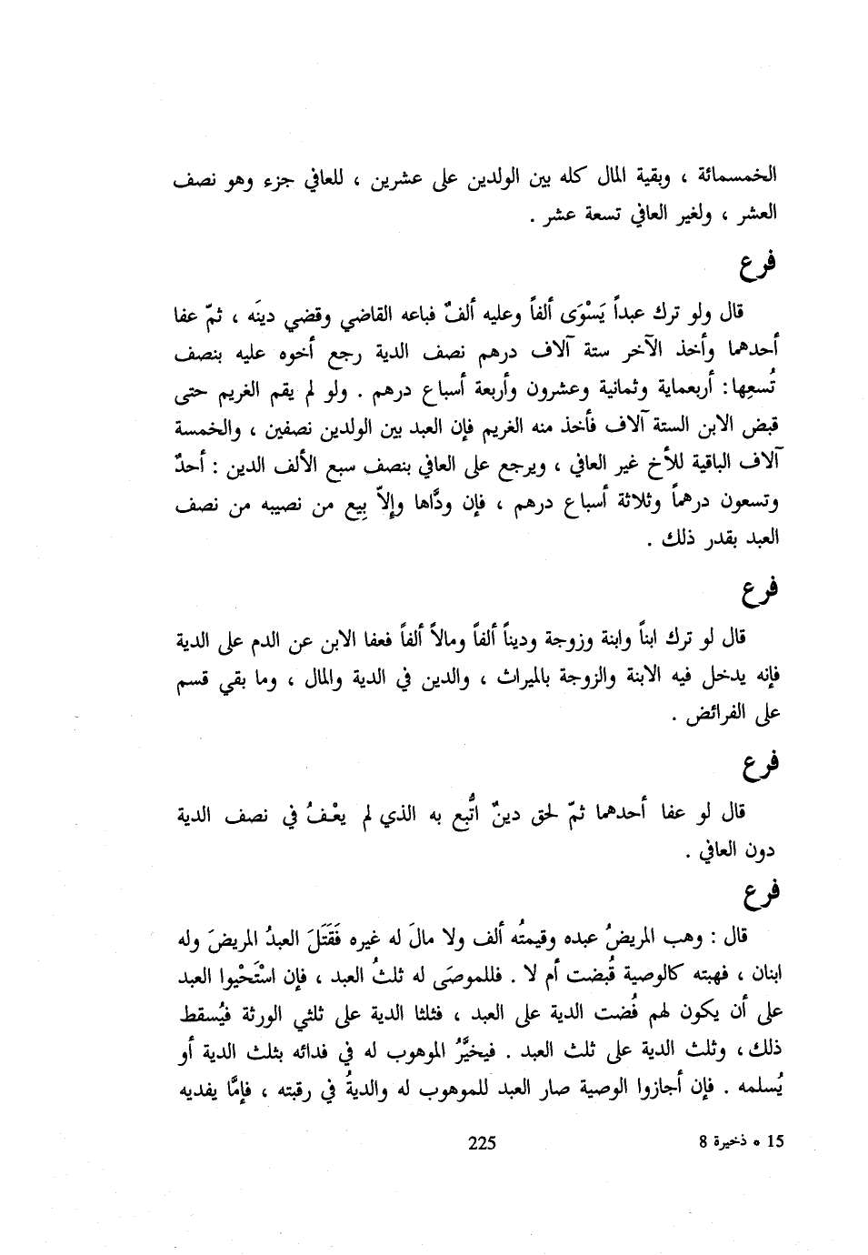 قَالَ: لَوْ تَرَكَ ابْنًا وَابْنَةً وَزَوْجَةً وَدَيْنًا أَلْفًا وَمَالًا أَلْفًا فَعَفَا الِابْنُ عَنِ الدَّمِ عَلَى الدِّيَةِ فَإِنَّهُ يَدْخُلُ فِيهِ الِابْنَةُ وَالزَّوْجَةُ بِالْمِيرَاثِ وَالدَّيْنُ فِي الدِّيَةِ وَالْمَالِ وَمَا بَقِيَ قُسِّمَ عَلَى الْفَرَائِضِ قَالَ: لَوْ عَفَا أَحَدُهُمَا ثُمَّ لَحِقَ دينٌ اتُّبع بِهِ الَّذِي لَمْ يَعفُ فِي نِصْفِ الدِّيَةِ دُونَ الْعَافِي قَالَ: وَهَبَ المريضُ عَبْدَهُ وَقِيمَتُهُ أَلْفٌ وَلَا مَالَ لَهُ غَيْرُهُ فقَتَلَ الْعَبْدُ المريضَ وَلَهُ ابْنَانِ فَهِبَتُهُ كَالْوَصِيَّةِ قُبضت أَمْ لَا فَلِلْمُوصَى لَهُ ثُلُثُ الْعَبْدِ فَإِنِ اسْتَحْيَوُا الْعَبْدَ عَلَى أَنْ يكون لَهُم فُضت الدِّيَةُ عَلَى الْعَبْدِ فَثُلُثَا الدِّيَةِ عَلَى ثُلُثَيِ الْوَرَثَةِ فيُسقط ذَلِكَ وَثُلُثُ الدِّيَةِ عَلَى ثُلُثِ العَبْد فَيُخَير الْمَوْهُوب لَهُ فِي فدائه بِثلث الدِّيَة أَو يُسلمه فَإِن أَجَازُوا الوجية صَار العَبْد للْمَوْهُوب لَهُ وَالدية فِي رقببته فإمَّا يفْدِيه