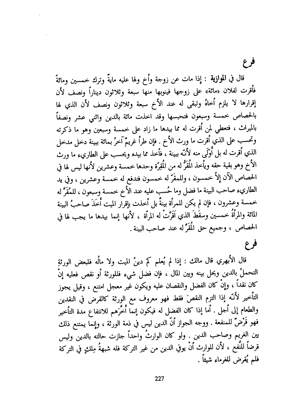 قَالَ فِي الْمَوَّازِيَّةِ: إِذَا مَاتَ عَنْ زَوْجَة وَأَخ وَلها عَلَيْهِ ماية وَتَرَكَ خَمْسِينَ وَمِائَةً فَأَقَرَّتْ لِفُلَانٍ " مِائَةً " عَلَى زَوْجِهَا فَيَنُوبُهَا مِنْهَا سَبْعَةٌ وَثَلَاثُونَ دِينَارًا وَنِصْفٌ لِأَن إِقْرَارهَا لايلزم أَخَاهُ وَتَبْقَى لَهُ عِنْدَ الْأَخِ سَبْعَةٌ وَثَلَاثُونَ وَنِصْفٌ لِأَنَّ الَّذِي لَهَا بِالْحِصَاصِ خَمْسَةٌ وَسَبْعُونَ فَتَحْبِسُهَا وَقَدْ أَخَذَتْ مِائَةً بِالدَّيْنِ وَاثْنَيْ عَشَرَ وَنِصْفًا بِالْمِيرَاثِ فَتُعْطِي لِمَنْ أَقَرَّتْ لَهُ مِمَّا بِيَدِهَا مَا زَادَ عَلَى خَمْسَةٍ وَسَبْعِينَ وَهُوَ مَا ذكرته وتحسب على الَّذِي أقرَّت مَا وَرِثَ الْأَخُ فَإِنْ طَرَأَ غريمٌ آخَرُ بِمِائَةٍ بِبَيِّنَةٍ دَخَلَ مَدْخَلَ الَّذِي أَقَرَّتْ لَهُ بَلْ أَوْلَى مِنْهُ لِأَنَّهُ بِبَيِّنَةٍ فَأَخَذَ مِمَّا بِيَدِهِ وَيُحْسَبُ عَلَى الطَّارِئِ مَا وَرِثَ الْأَخُ وَهُوَ بَقِيَّةُ حَقِّهِ وَيَأْخُذُ المُقَرُّ لَهُ مِنَ المُقِرة وَحْدَهَا خَمْسَةً وَعِشْرِينَ لِأَنَّهَا لَيْسَ لَهَا فِي الْحِصَاصِ الْآنَ إِلَّا خَمْسُونَ وَلِلْمُقَرِّ لَهُ خَمْسُونَ فَتَدْفَعُ لَهُ خَمْسَةً وَعِشْرِينَ وَفِي يَدِ الطَّارِئِ صَاحِبِ الْبَيِّنَةِ مَا فَضَلَ وَمَا حُسب عَلَيْهِ عِنْدَ الْأَخِ خَمْسَةٌ وَسَبْعُونَ للمُقَرّ لَهُ خَمْسَةٌ وَعِشْرُونَ فَإِنْ لَمْ يَكُنْ لِلْمَرْأَةِ بينةٌ بَلْ أَخَذَتْ بِإِقْرَارِ الْمَيِّتِ أَخَذَ صَاحِبُ الْبَيِّنَةِ الْمِائَةَ وَالْمَرْأَةُ خَمْسِينَ وَسَقَطَ الَّذِي أَقَرَّتْ لَهُ الْمَرْأَةُ لِأَنَّهَا إِنَّمَا بِيَدِهَا مَا يَجِبُ لَهَا فِي الْحِصَاصِ وَجَمِيعُ حَقِّ المُقَرِّ لَهُ عِنْدَ صَاحِبِ الْبَيِّنَةِ
