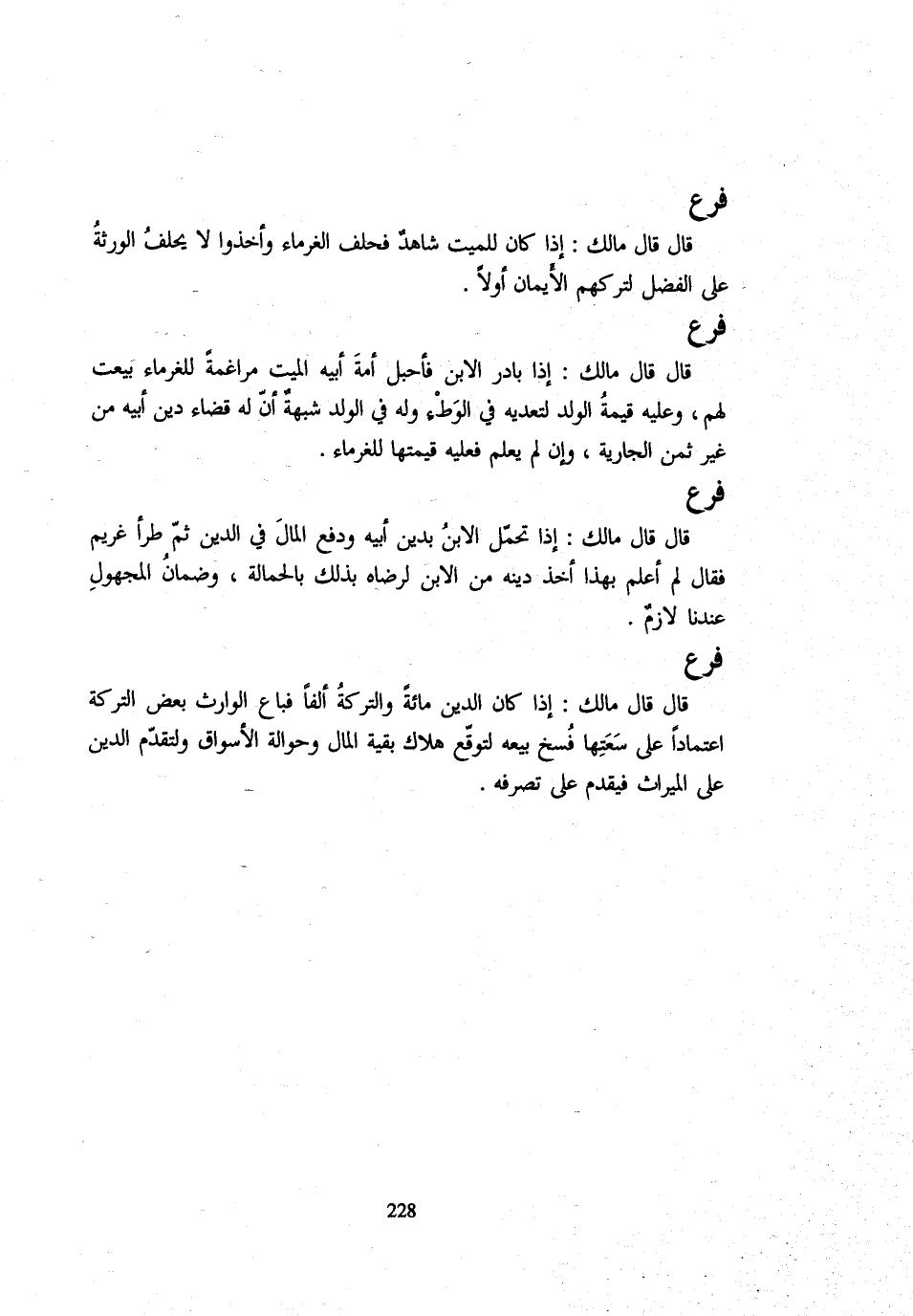 قَالَ: قَالَ مَالِكٌ: إِذَا كَانَ الدَّيْنُ مِائَةً والتركةُ أَلْفًا فَبَاعَ الْوَارِثُ بَعْضَ التَّرِكَةِ اعْتِمَادًا عَلَى سَعَتِها فُسخ بَيْعُهُ لِتَوَقُّعِ هَلَاكِ بَقِيَّةِ الْمَالِ وَحَوَالَةِ الْأَسْوَاقِ وَلِتَقَدُّمِ الدَّيْنِ عَلَى الْمِيرَاثِ فَيُقَدَّمُ عَلَى تصرفه