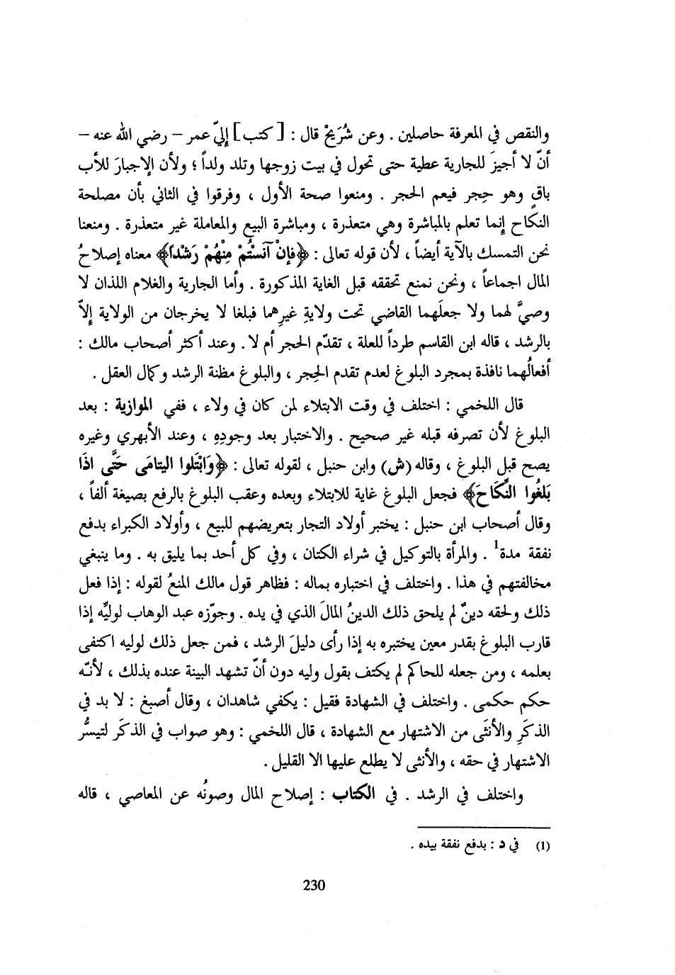 وَالنَّقْصُ فِي الْمَعْرِفَةِ حَاصِلَيْنِ وَعَنْ شُريح قَالَ: [كَتَبَ] إِلَيَّ عُمَرُ - رَضِيَ اللَّهُ عَنْهُ - أَنْ لَا أُجِيزَ لِلْجَارِيَةِ عَطِيَّةً حَتَّى تُحَوَّلَ فِي بَيت زَوجهَا وتلد ولدا وَلِأَن الْإِجْبَار للْأَب باقِ وَهُوَ حِجر فَيَعُمُّ الْحَجْرُ وَمَنَعُوا صِحَّةَ الْأَوَّلِ وَفَرَّقُوا فِي الثَّانِي بِأَنَّ مَصْلَحَةَ النِّكَاحِ إِنَّمَا تُعْلَمُ بِالْمُبَاشَرَةِ وَهِيَ مُتَعَذِّرَةٌ وَمُبَاشَرَةُ الْبَيْعِ والمعاملة غير مُتَعَذر وَمَنَعْنَا نَحْنُ التَّمَسُّكَ بِالْآيَةِ أَيْضًا لِأَنَّ قَوْله تَعَالَى {فَإِن آنستم مِنْهُم رشدا} مَعْنَاهُ إِصْلَاحُ الْمَالِ إِجْمَاعًا وَنَحْنُ نَمْنَعُ تَحَقُّقَهُ قَبْلَ الْغَايَةِ الْمَذْكُورَةِ وَأَمَّا الْجَارِيَةُ وَالْغُلَامُ اللَّذَانِ لَا وصيَّ لَهُمَا وَلَا جَعَلَهُمَا الْقَاضِي تَحْتَ وَلَايَةِ غَيْرِهِمَا فَبَلَغَا لَا يَخْرُجَانِ مِنَ الْوَلَايَةِ إِلَّا بِالرُّشْدِ قَالَهُ ابْنُ الْقَاسِمِ طَرْدًا لِلْعِلَّةِ تَقَدَّمَ الْحَجْرُ أَمْ لَا وَعِنْدَ أَكْثَرِ أَصْحَابِ مَالِكٍ: أفعالُهما نَافِذَةٌ بِمُجَرَّدِ الْبُلُوغِ لِعَدَمِ تَقَدُّمِ الحِجر وَالْبُلُوغُ مَظِنَّةُ الرُّشْدِ وَكَمَالِ الْعَقْلِ قَالَ اللَّخْمِيُّ: اخْتُلِفَ فِي وَقْتِ الِابْتِلَاءِ لِمَنْ كَانَ فِي وَلَاءٍ فَفِي الْمَوَّازِيَّةِ: بَعْدَ الْبُلُوغِ لِأَنَّ تَصَرُّفَهُ قَبْلَهُ غَيْرُ صَحِيحٍ وَالِاخْتِبَارُ بَعْدَ وُجُودِهِ وَعِنْدَ الْأَبْهَرِيِّ: وَغَيْرِهِ يَصِحُّ قَبْلَ الْبُلُوغِ وَقَالَهُ (ش) وَابْنُ حَنْبَلٍ لِقَوْلِهِ تَعَالَى {وَابْتَلُوا الْيَتَامَى حَتَّى إِذا بلغُوا النِّكَاح} فَجَعَلَ الْبُلُوغَ غَايَةً لِلِابْتِلَاءِ وَبَعْدَهُ وَعَقَّبَ الْبُلُوغَ بِالرَّفْع بِصِيغَة الْفَا وَقَالَ أَصْحَابُ ابْنِ حَنْبَلٍ: يُخْتَبَرُ أَوْلَادُ التُّجَّارِ بتعريضهم للْبيع وَأَوْلَاد الكبراء بِدفع نَفَقَة مُدَّة وَالْمَرْأَةُ بِالتَّوْكِيلِ فِي شِرَاءِ الْكَتَّانِ وَفِي كُلِّ أَحَدٍ بِمَا يَلِيقُ بِهِ وَمَا يَنْبَغِي مُخَالَفَتُهُمْ فِي هَذَا وَاخْتُلِفَ فِي اخْتِبَارِهِ بِمَالِهِ: فَظَاهِرُ قَوْلِ مَالِكٍ الْمَنْعُ لِقَوْلِهِ: إِذَا فَعَلَ ذَلِكَ وَلَحِقَهُ دَيْنٌ لَمْ يَلْحَقْ ذَلِكَ الدَّيْنُ الْمَالَ الَّذِي فِي يَدِهِ وَجَوَّزَهُ عَبْدُ الْوَهَّابِ لوليِّه إِذَا قَارَبَ الْبُلُوغَ بِقَدْرٍ مُعَيَّنٍ يَخْتَبِرُهُ بِهِ إِذَا رَأَى دَلِيلَ الرُّشْدِ فَمَنْ جَعَلَ ذَلِكَ لِوَلِيِّهِ اكْتَفَى بِعِلْمِهِ وَمَنْ جَعَلَهُ لِلْحَاكِمِ لَمْ يَكْتَفِ بِقَوْلِ وَلِيِّهِ دُونَ أَنْ تَشْهَدَ الْبَيِّنَةُ عِنْدَهُ بِذَلِكَ لِأَنَّهُ حُكْمٌ حُكْمِيٌّ وَاخْتُلِفَ فِي الشَّهَادَةِ فَقِيلَ: يَكْفِي شَاهِدَانِ وَقَالَ أَصْبَغُ: لَا بُدَّ فِي الذكَر والأُنثى مِنَ الِاشْتِهَارِ مَعَ الشَّهَادَةِ قَالَ اللَّخْمِيُّ: وَهُوَ صَوَابٌ فِي الذَّكَرِ لتيسُّر الِاشْتِهَارِ فِي حَقِّهِ والأُنثى لَا يَطَّلِعُ عَلَيْهَا إِلَّا الْقَلِيل وَاخْتلف فِي الرشد فِي الْكِتَابِ: إِصْلَاحُ الْمَالِ وَصَوْنُهُ عَنِ الْمَعَاصِي قَالَهُ